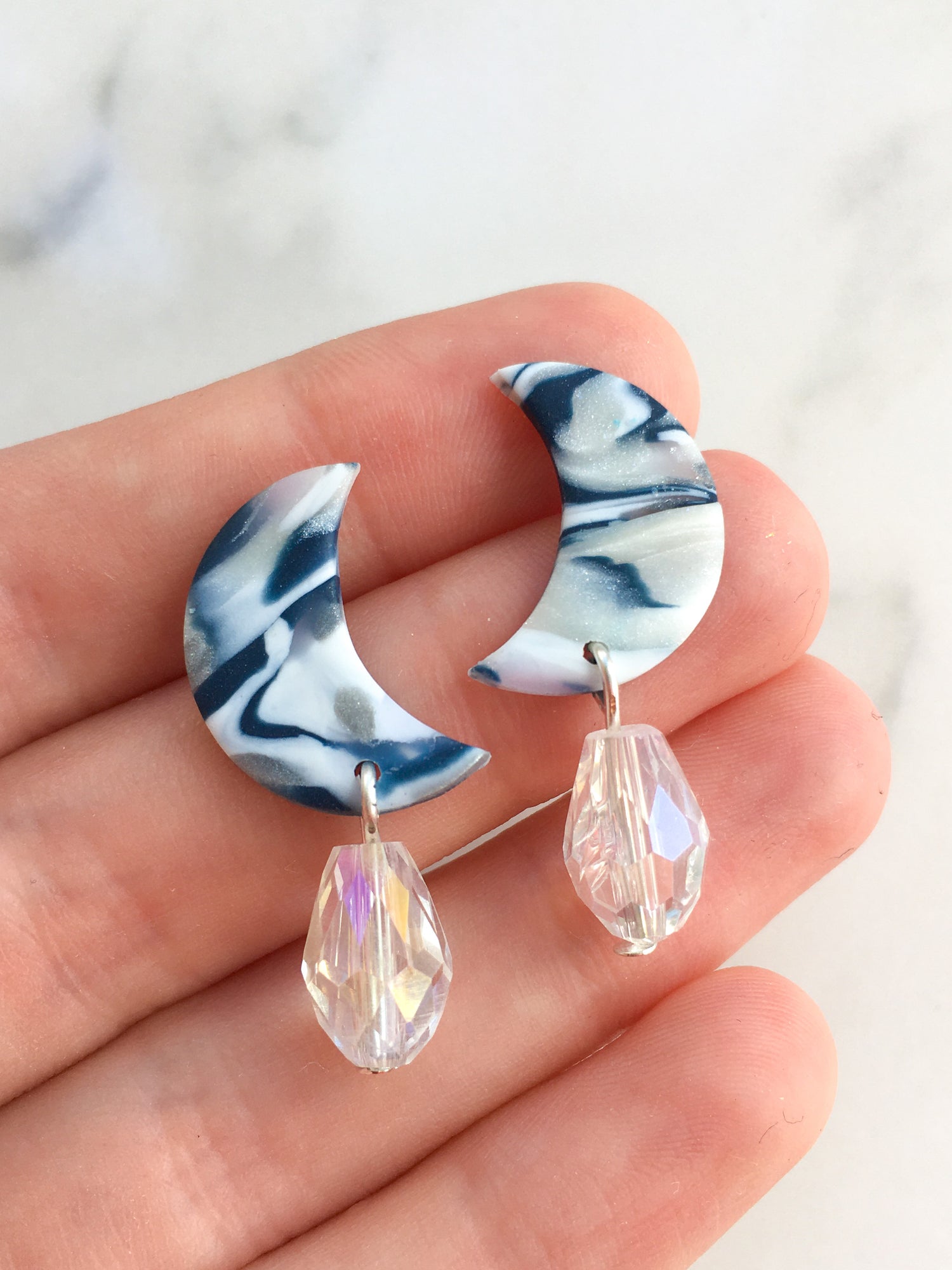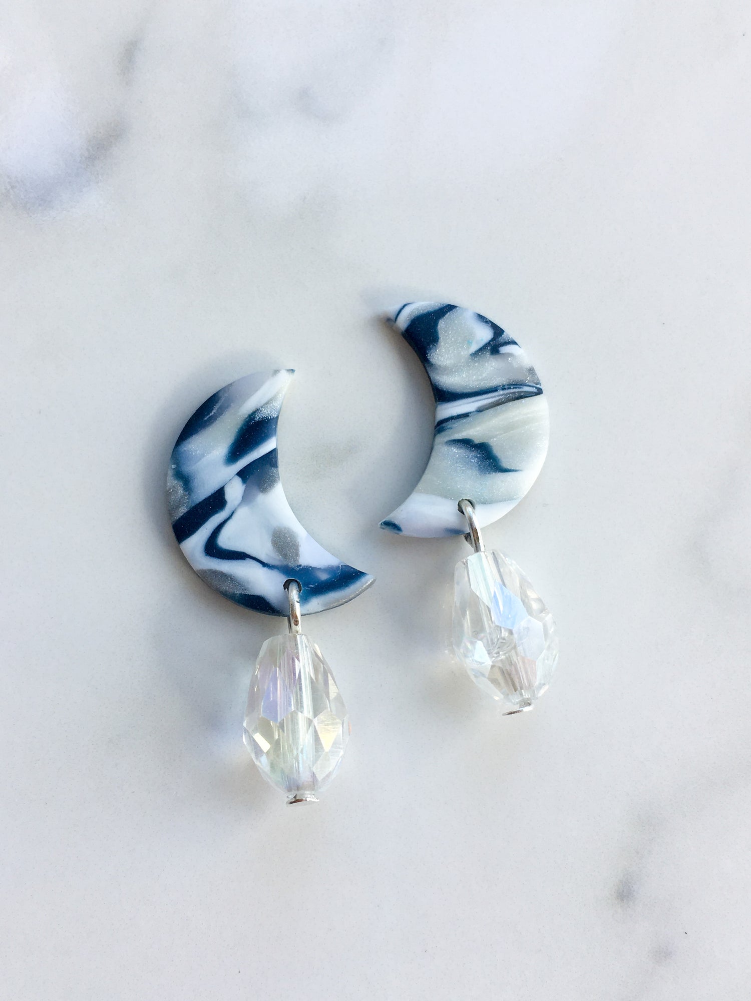 Elegant stud top moons with a crystal moonbeam drop! A marbled combination of silver, blue and white makes these a stunning pair of studs!