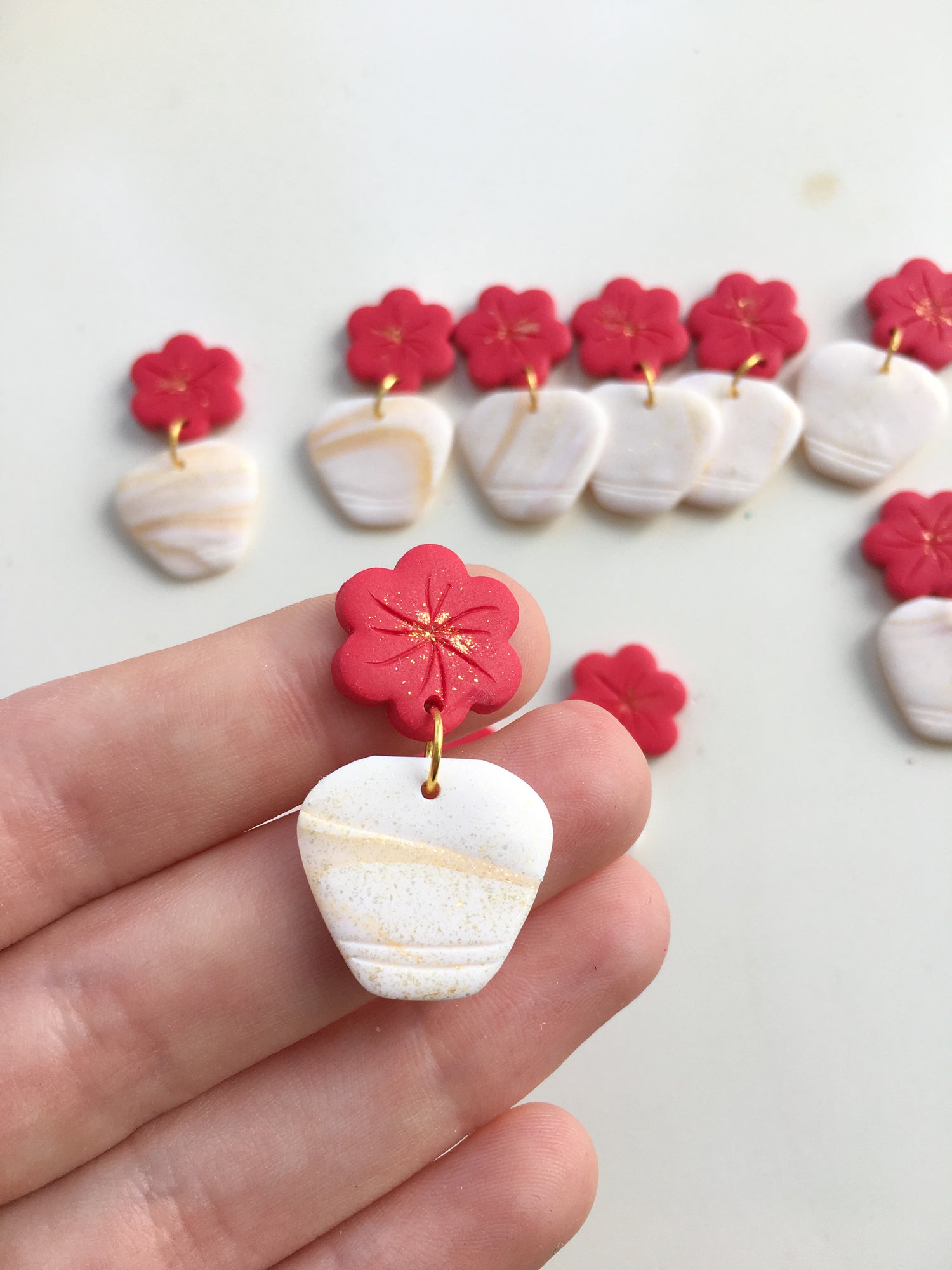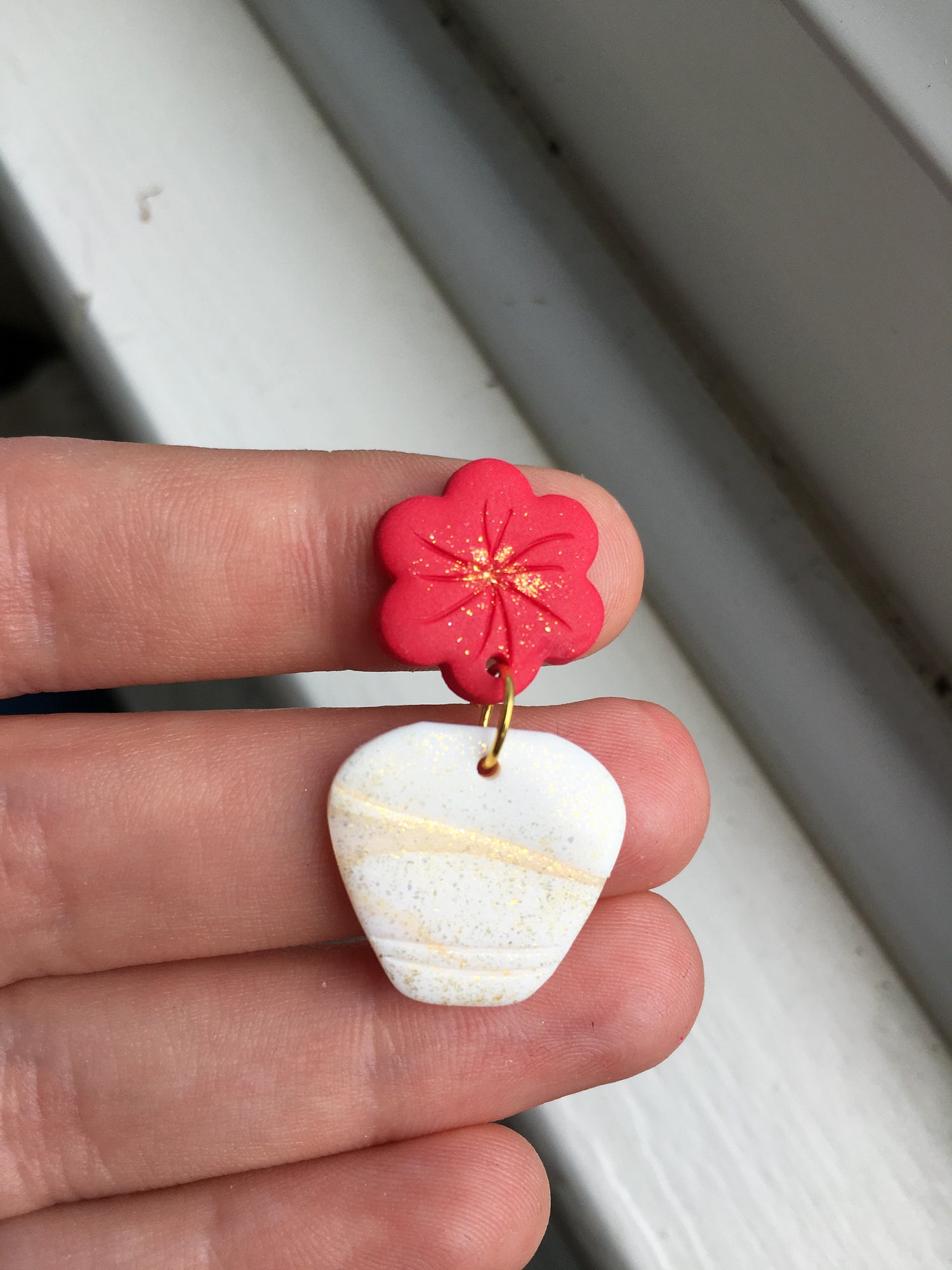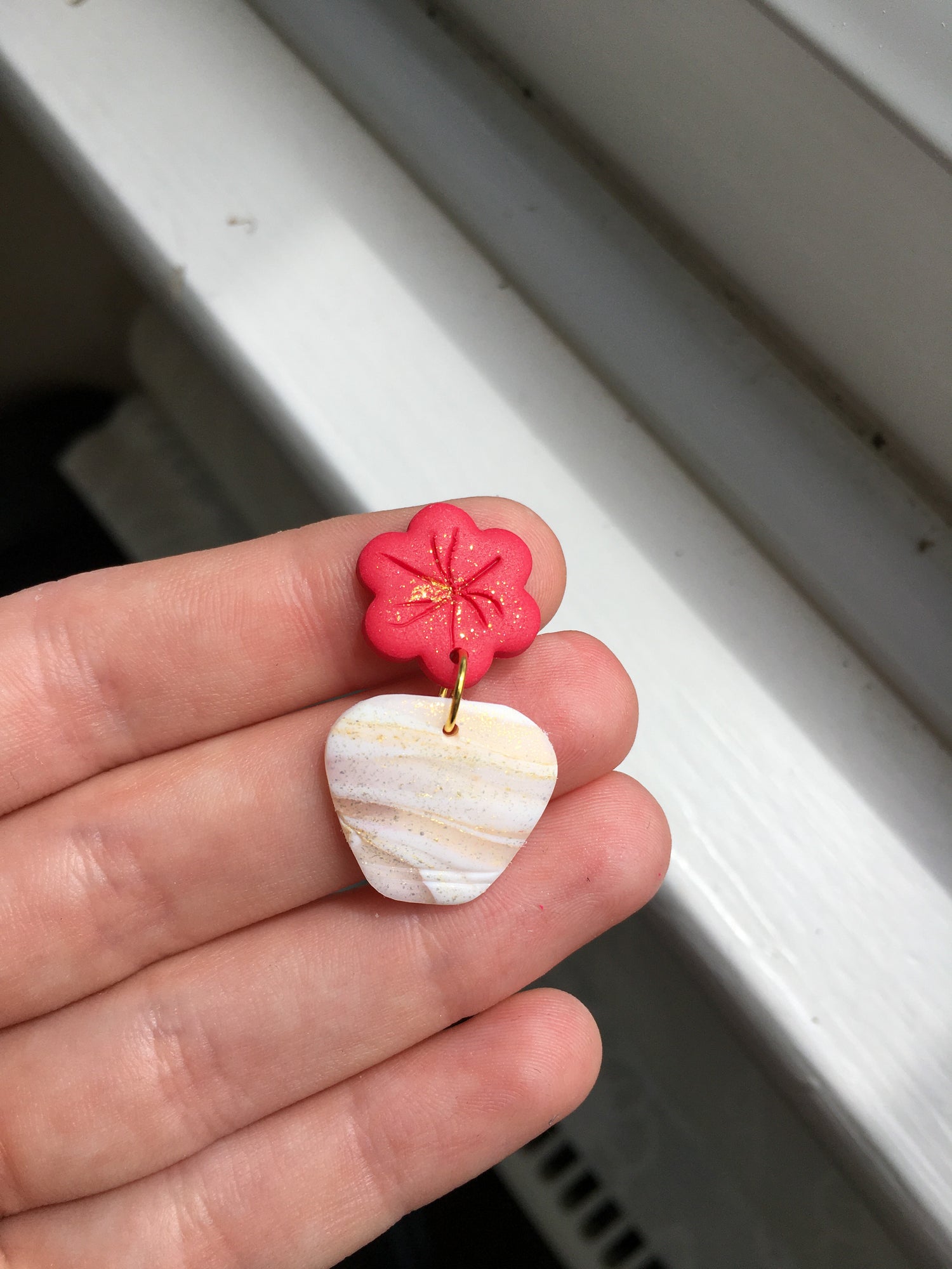 Elegant stud topped dangles inspired by the beautiful hot pink Flowering Bougainvillea that covers the Mediterranean Islands! Marbled white and gold glittering vases are topped by simple hot pink flowers! Just divine.