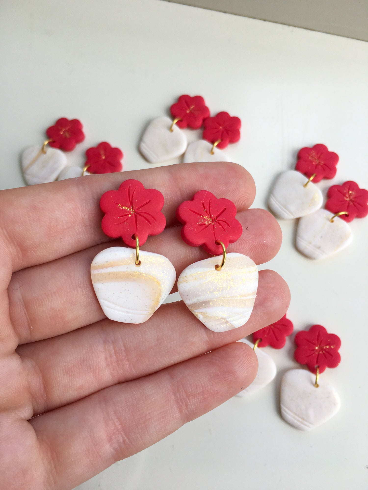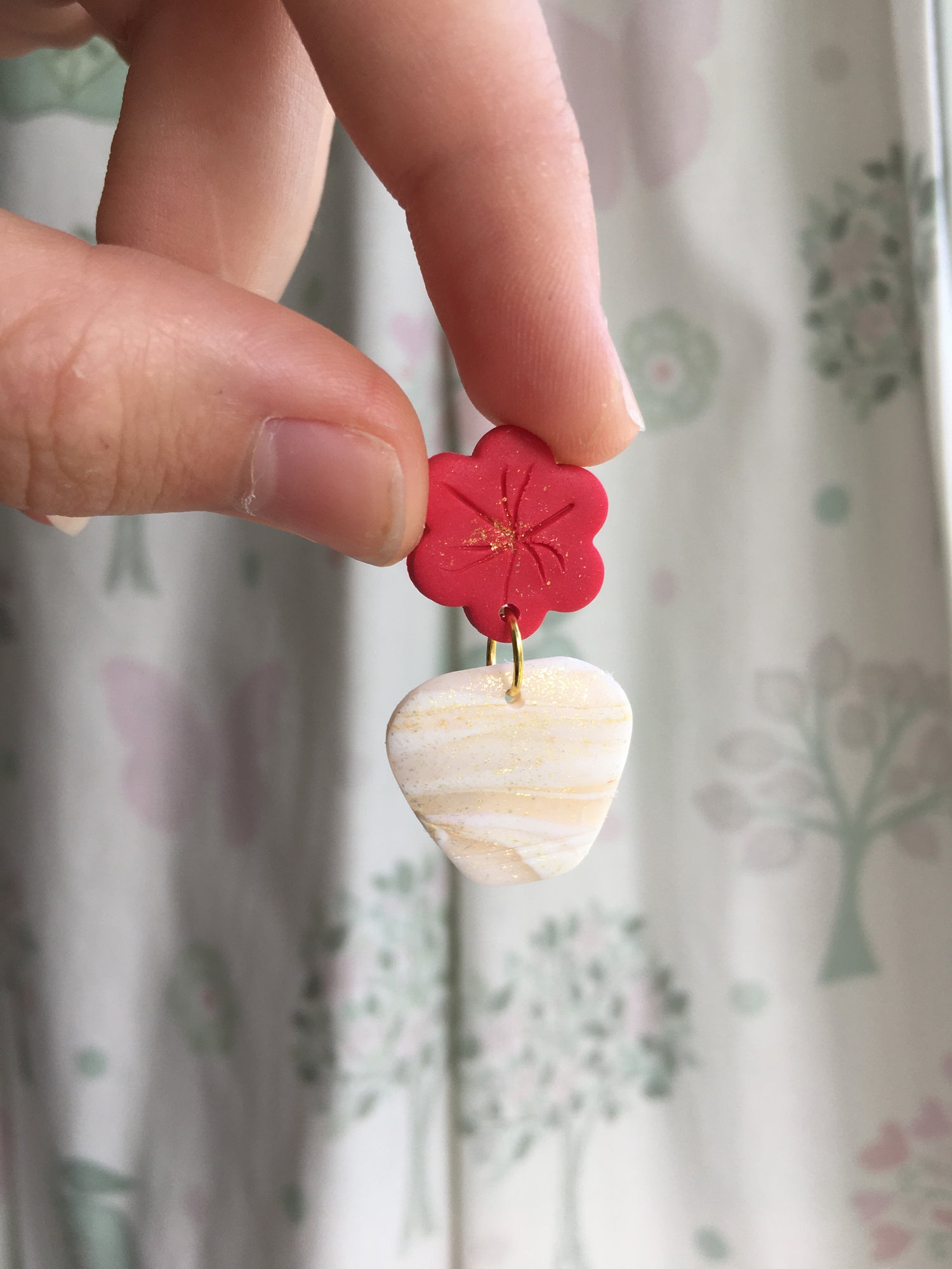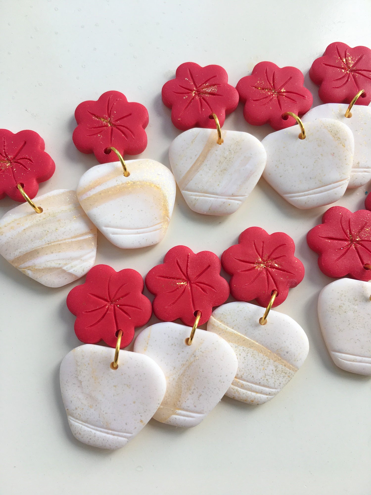 Elegant stud topped dangles inspired by the beautiful hot pink Flowering Bougainvillea that covers the Mediterranean Islands! Marbled white and gold glittering vases are topped by simple hot pink flowers! Just divine.