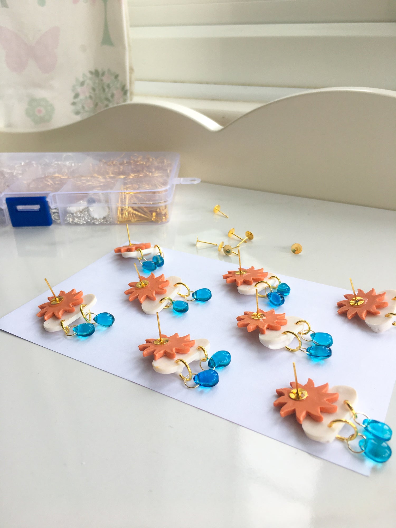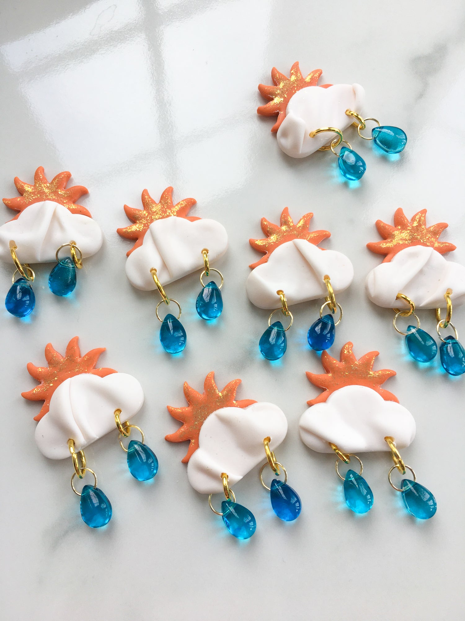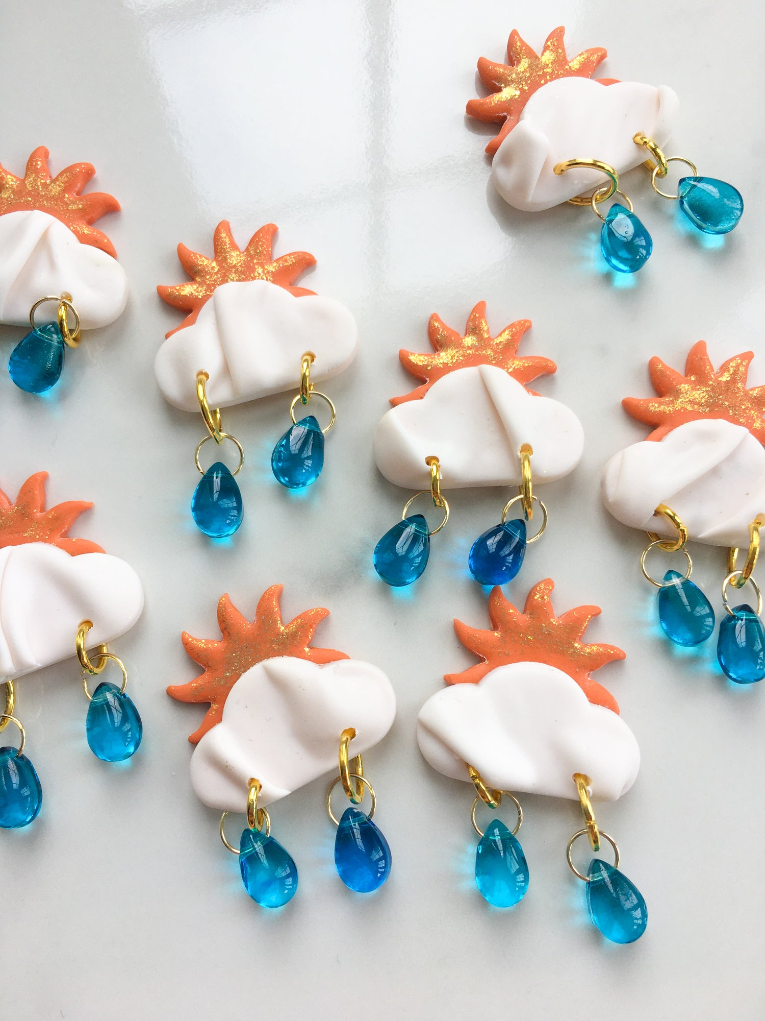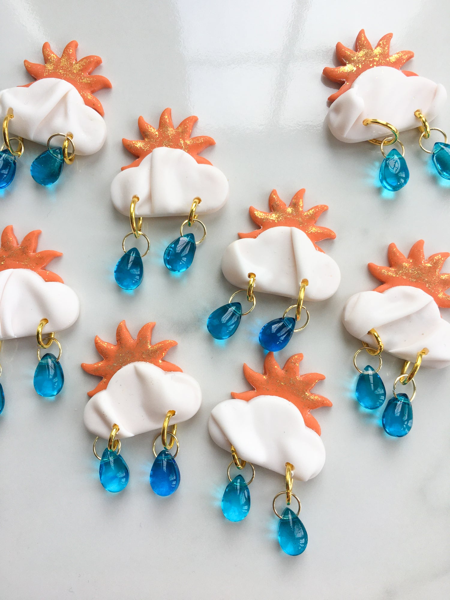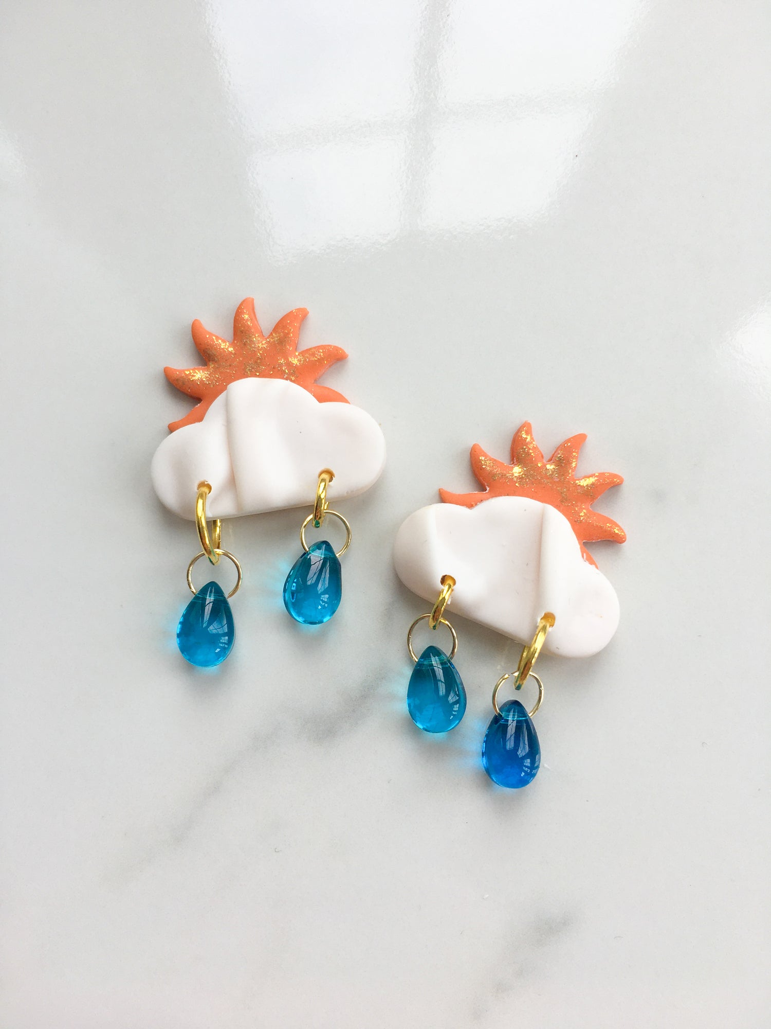 New to the cloud gang, these beauties feature glittering terracotta suns behind fluffy folded white clouds with radiant glass raindrops to finish!