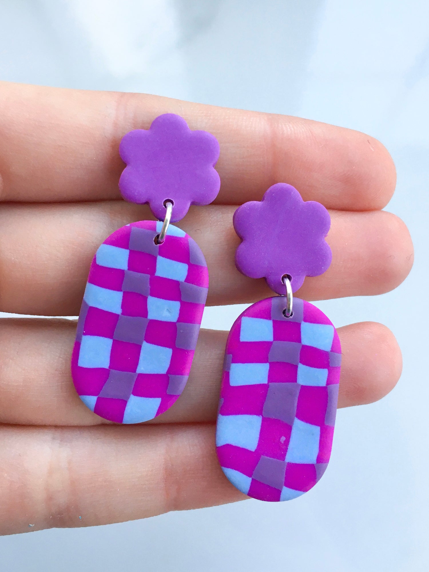 Cozy and cute, this slab design is a fuchsia gingham. This pair features capsules with a fuchsia flower stud top.