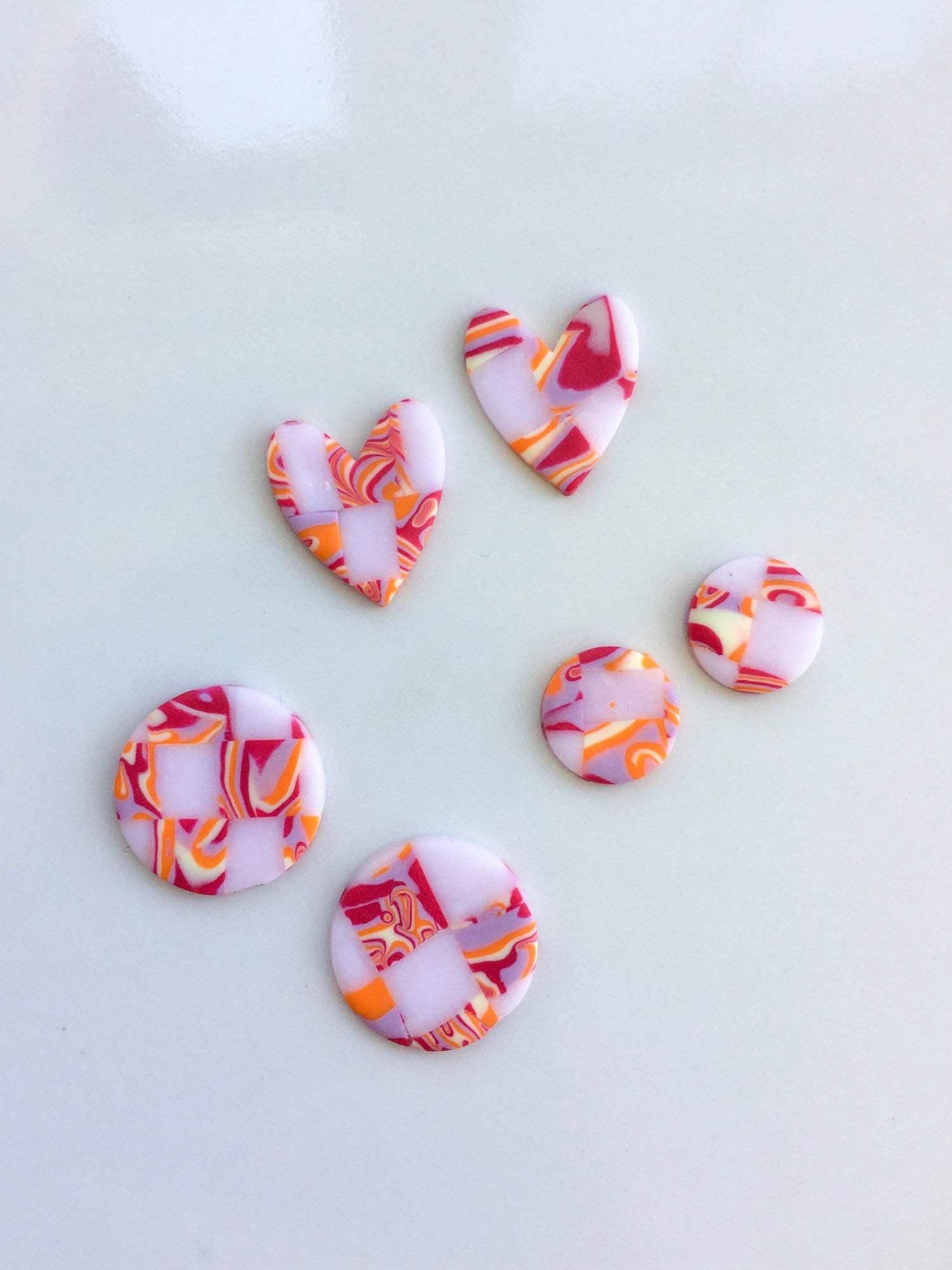 Studs in a retro checkerboard pattern of translucent pink and a swirling combo of orange, pink and purple. Choose your shape below!