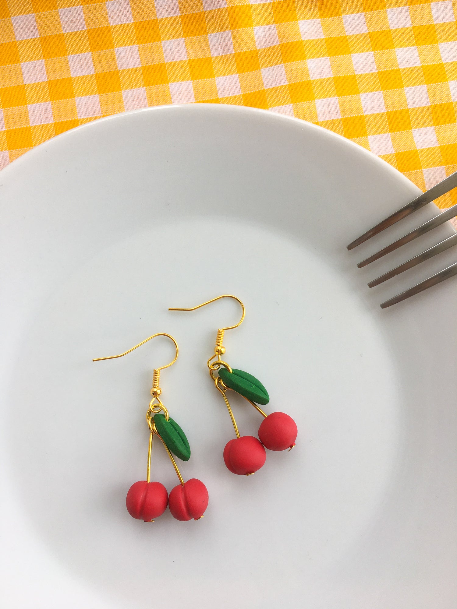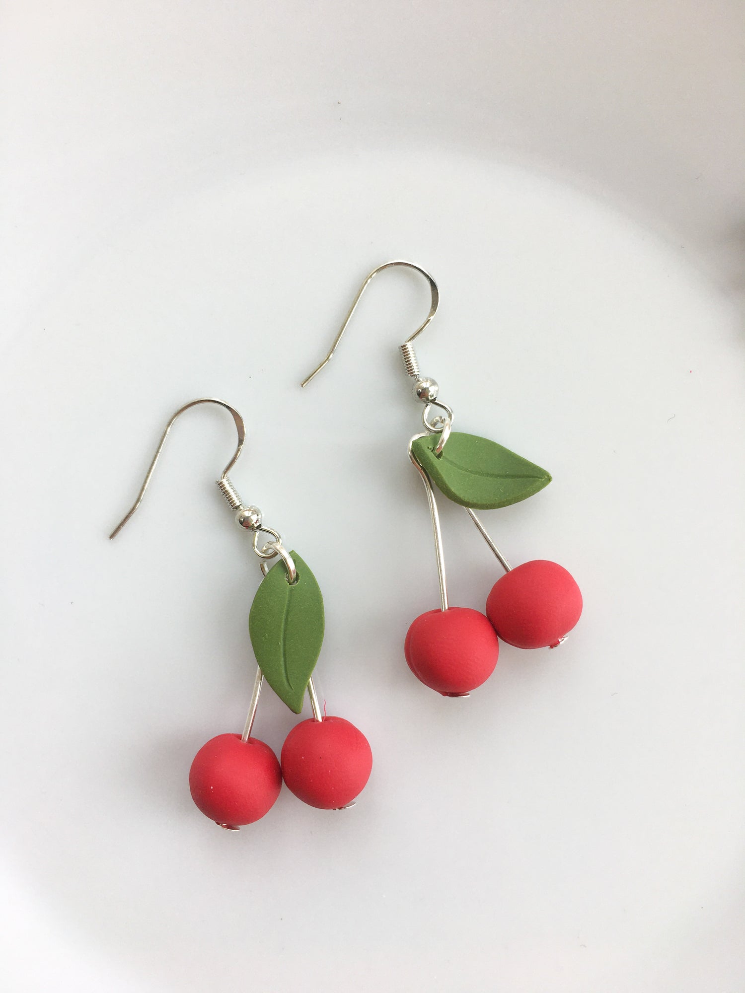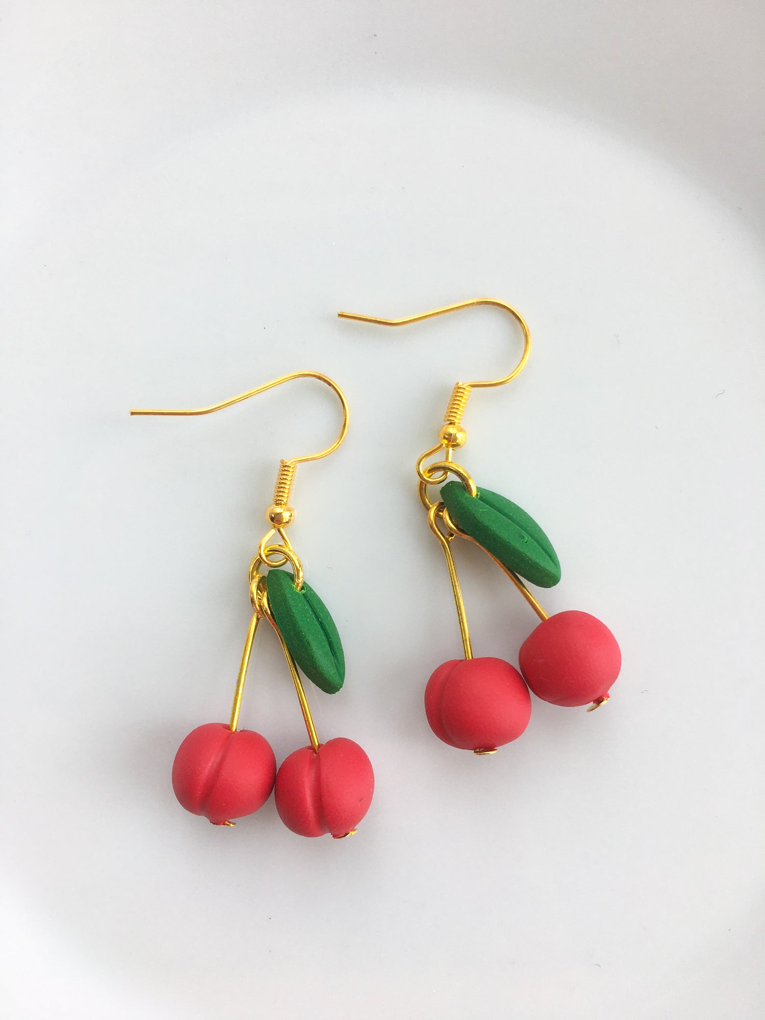 Feel fruity with these adorable cherry dangles! Featuring a pair of cherry beads with a cute leaf as a finishing touch.