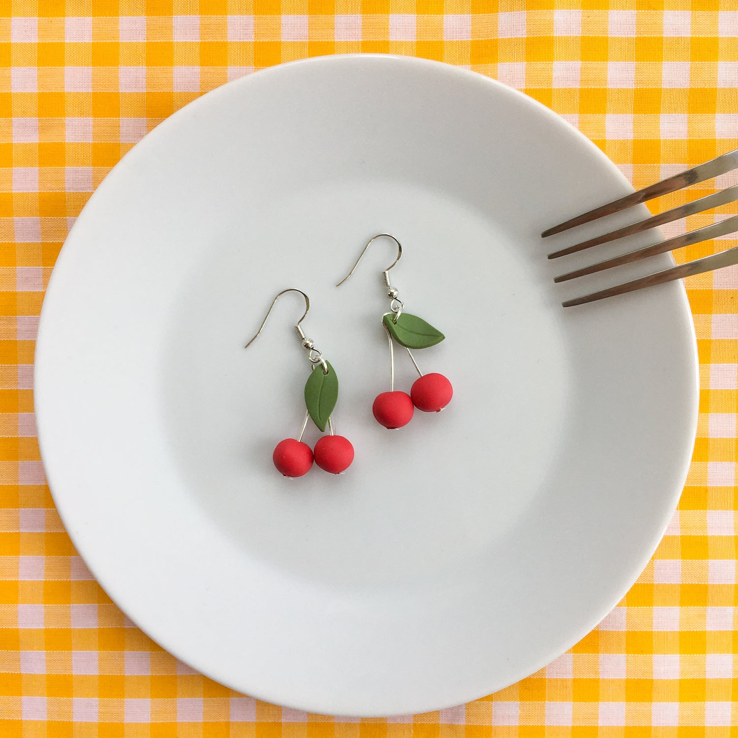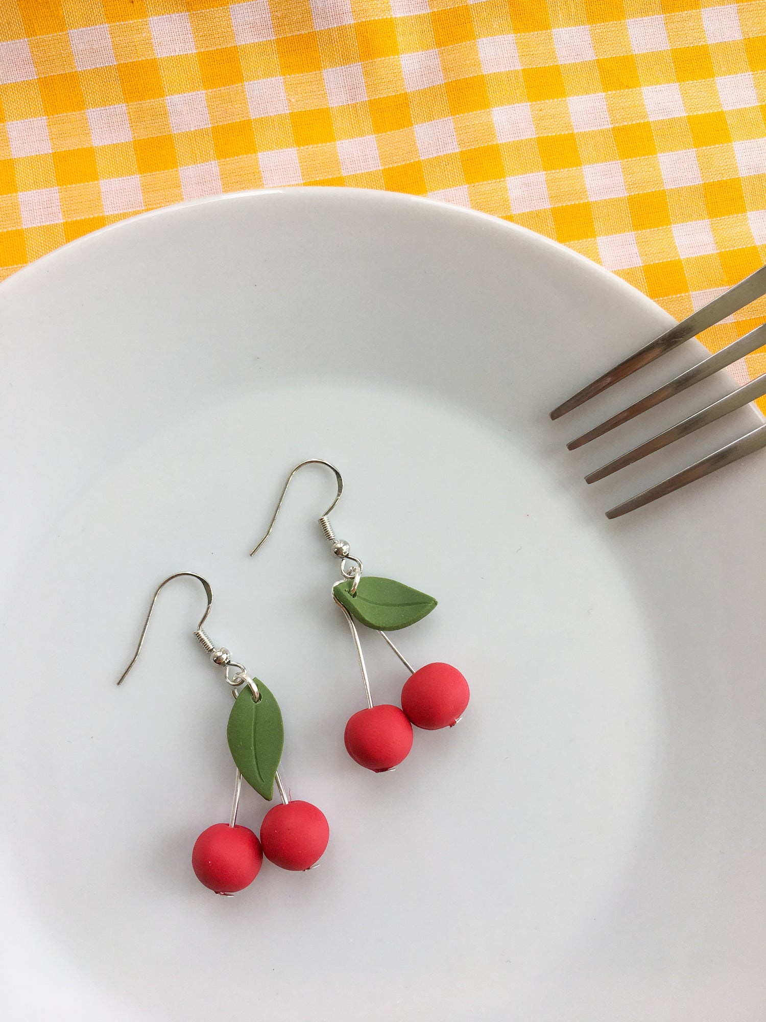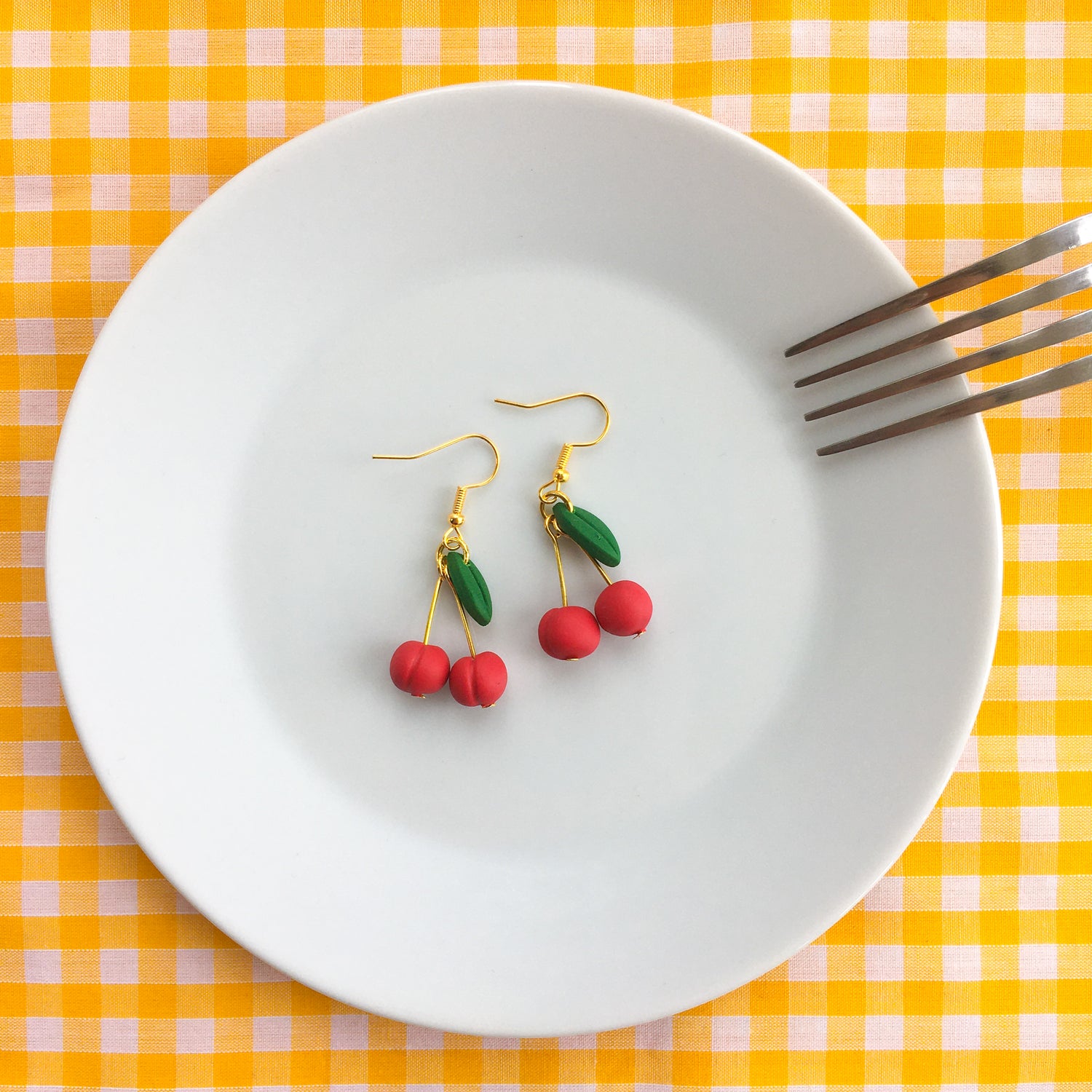 Feel fruity with these adorable cherry dangles! Featuring a pair of cherry beads with a cute leaf as a finishing touch.