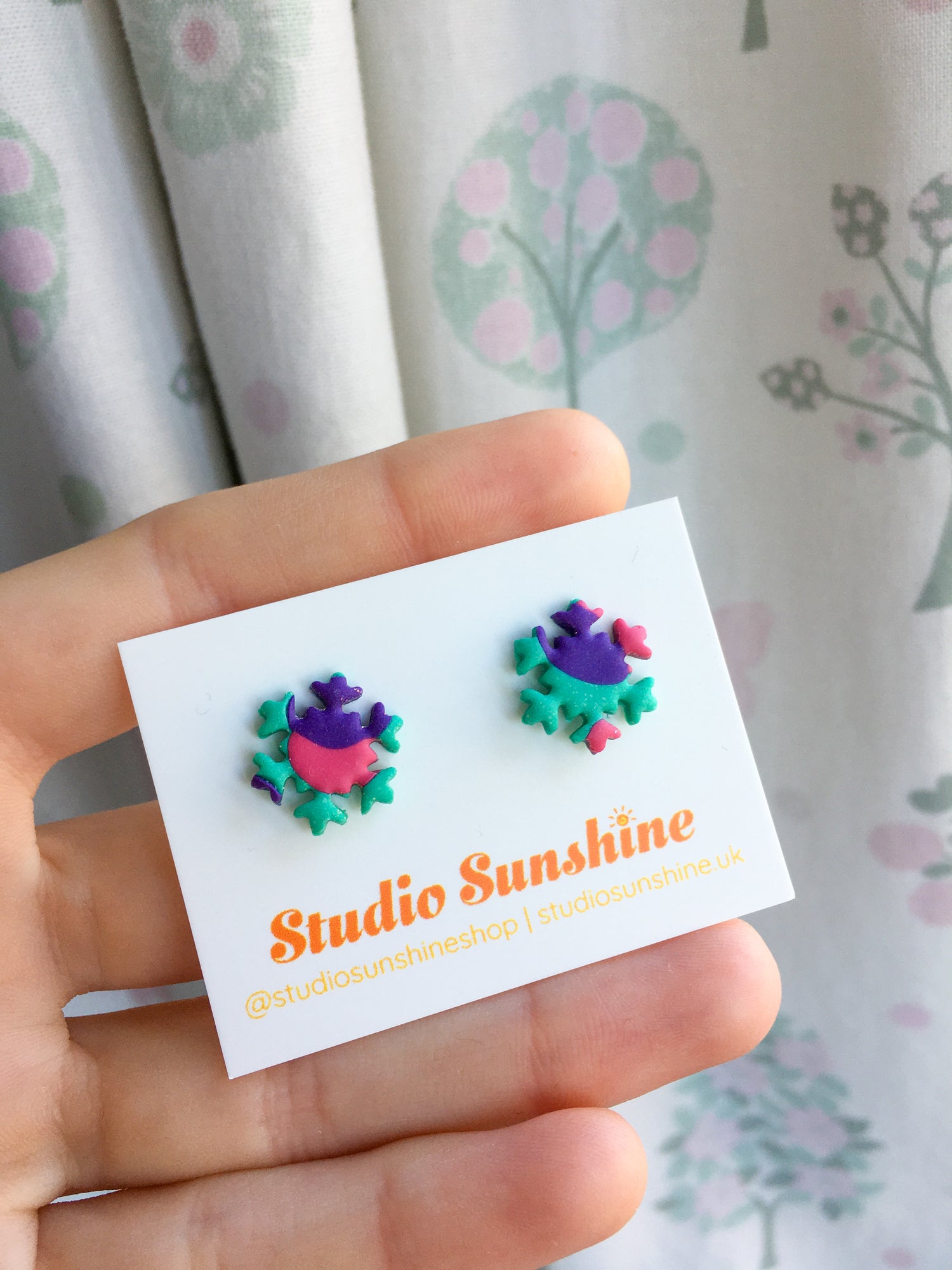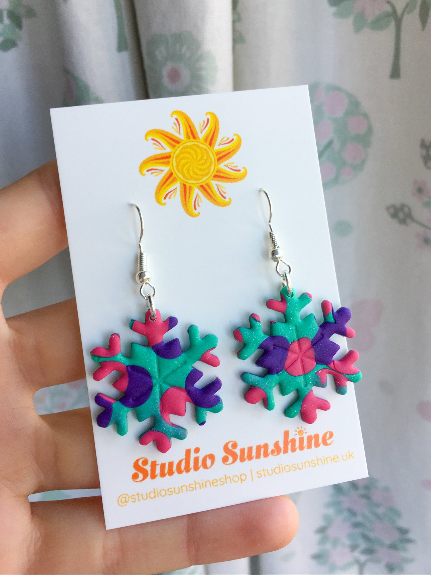 These fun snowflakes are a sparkling bright blue with added purple and pink spotty details. Also available as studs!