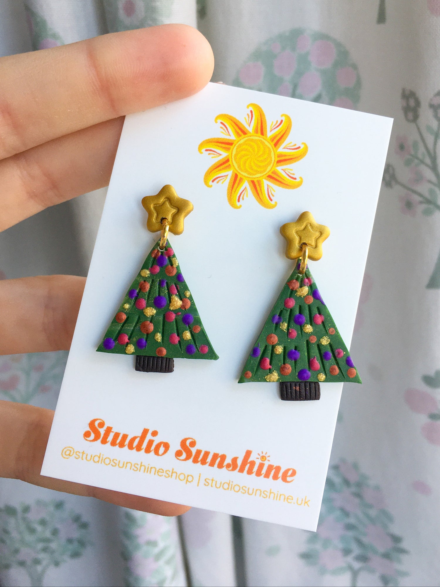 These fun and quirky pieces feature a colourful Christmas tree complete with golden stud top stars. Choose standard or a golden tinsel design! Note: Gold plated jump rings but stainless steel stud posts.
