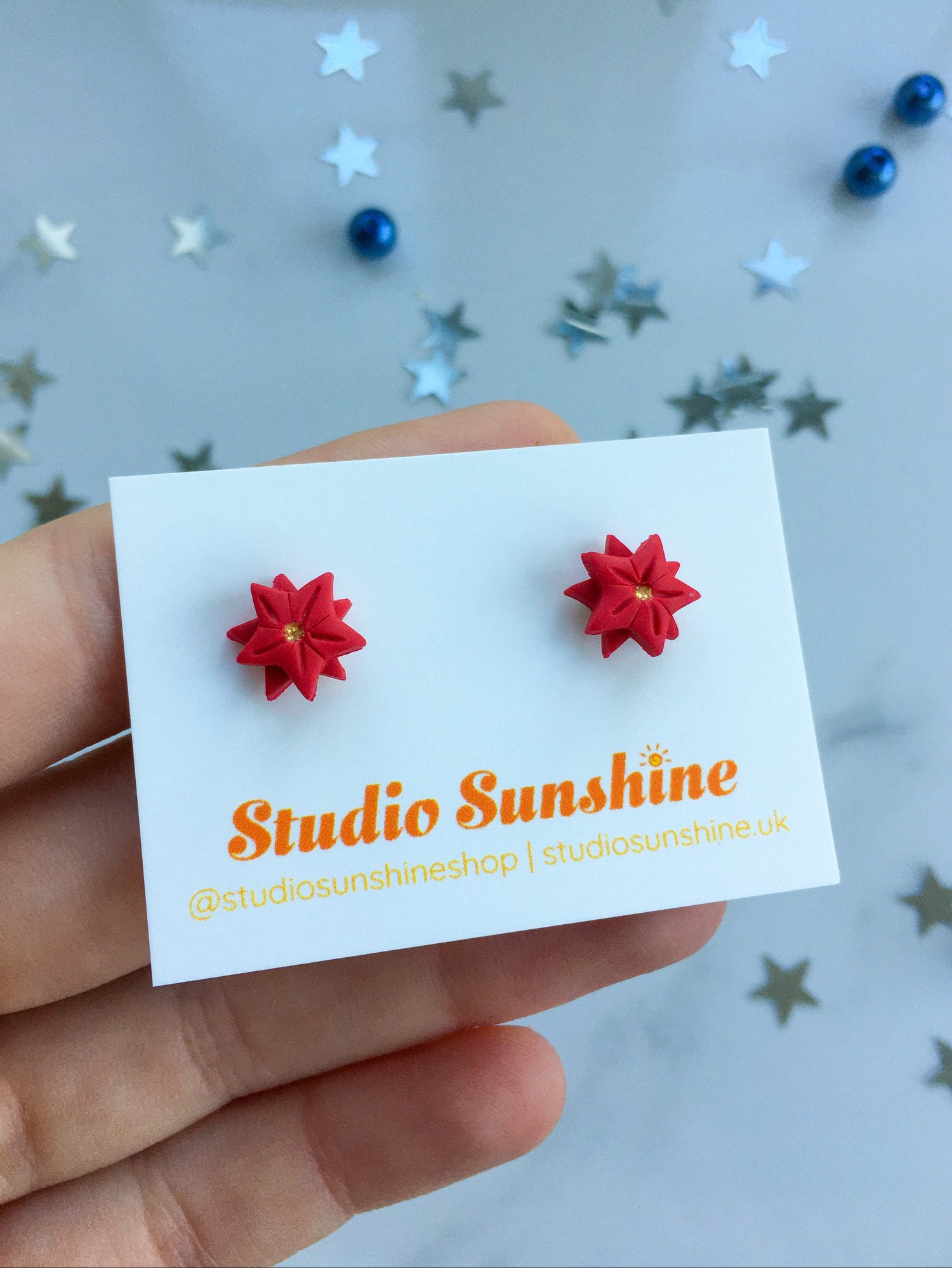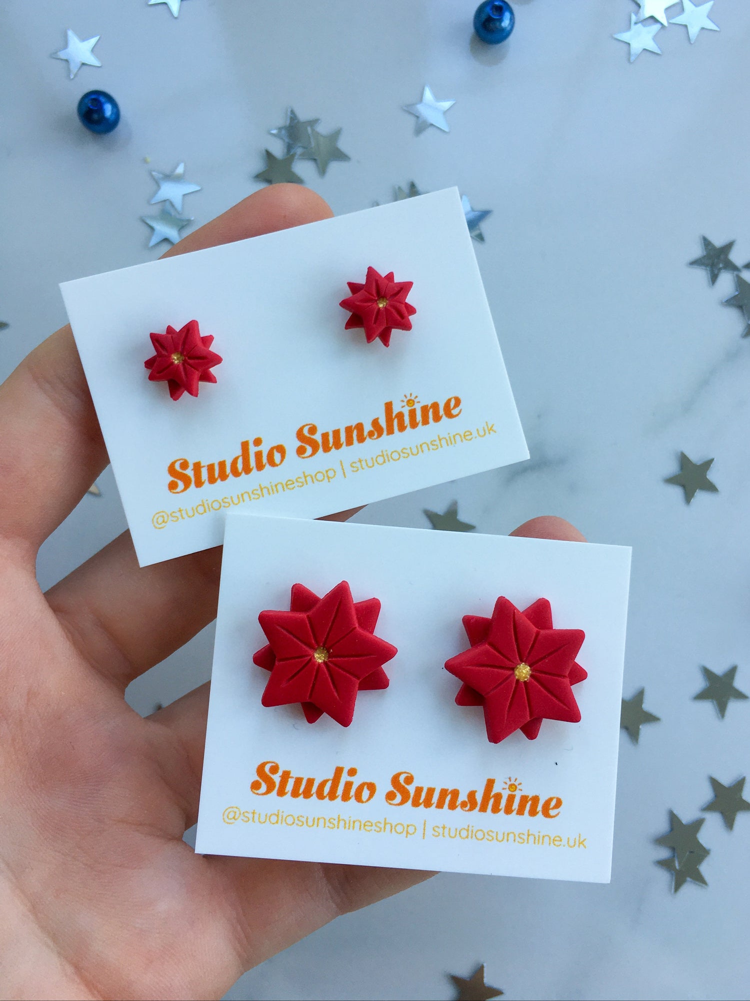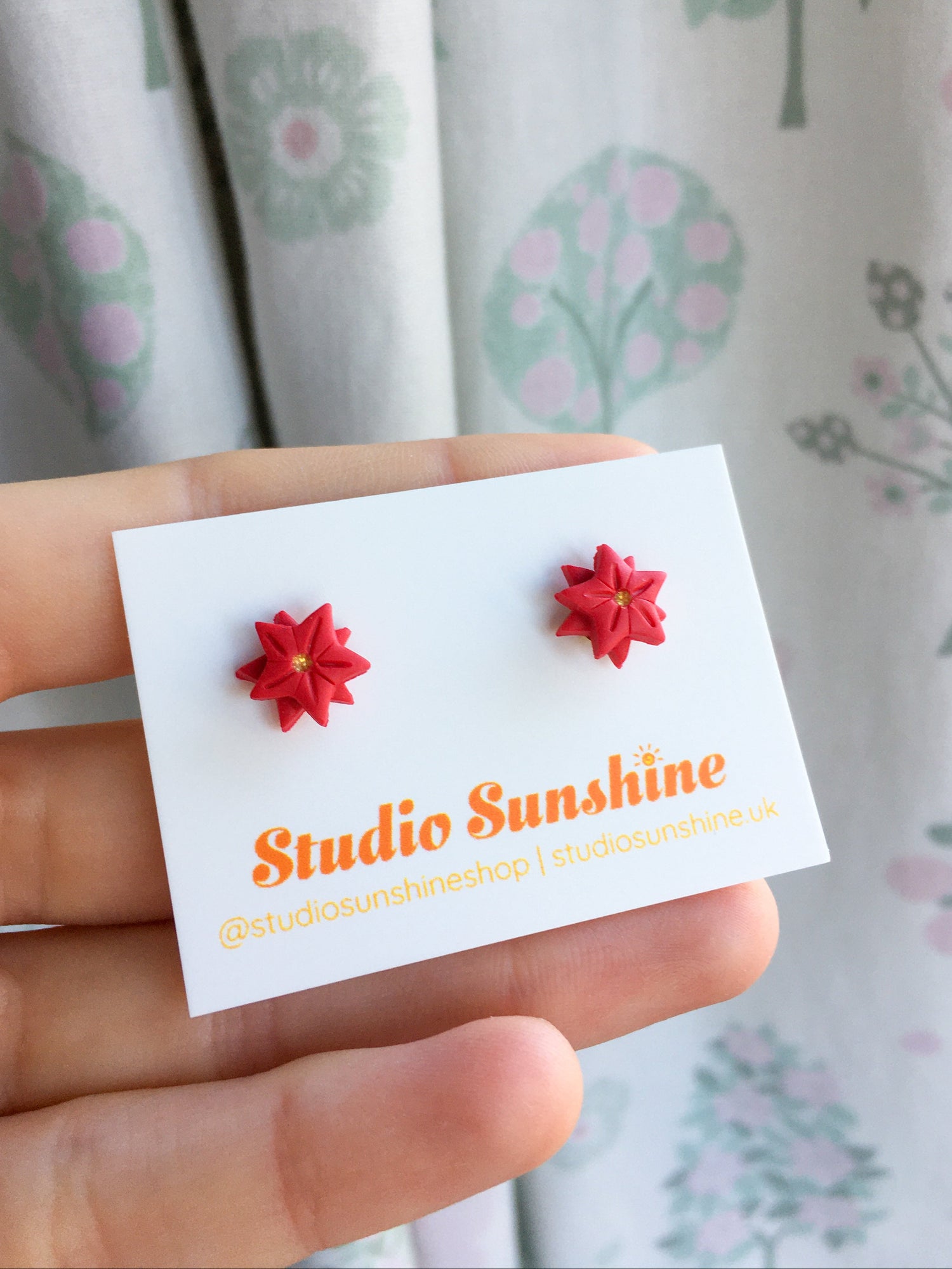 The most adorable pair of studs in the collection. These tiny pieces are made the same as Poinsettias on a miniature scale! Complete with golden centre.