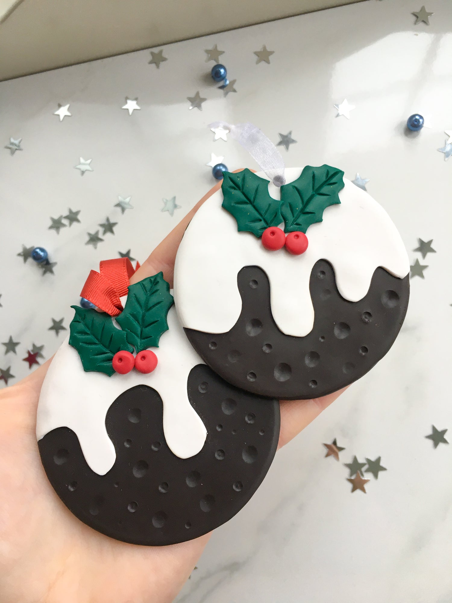 Studio Sunshine does handcrafted Christmas ornaments! This design features a 2D Christmas Pudding complete with icing, holly and berries! Topped with a red or white ribbon.