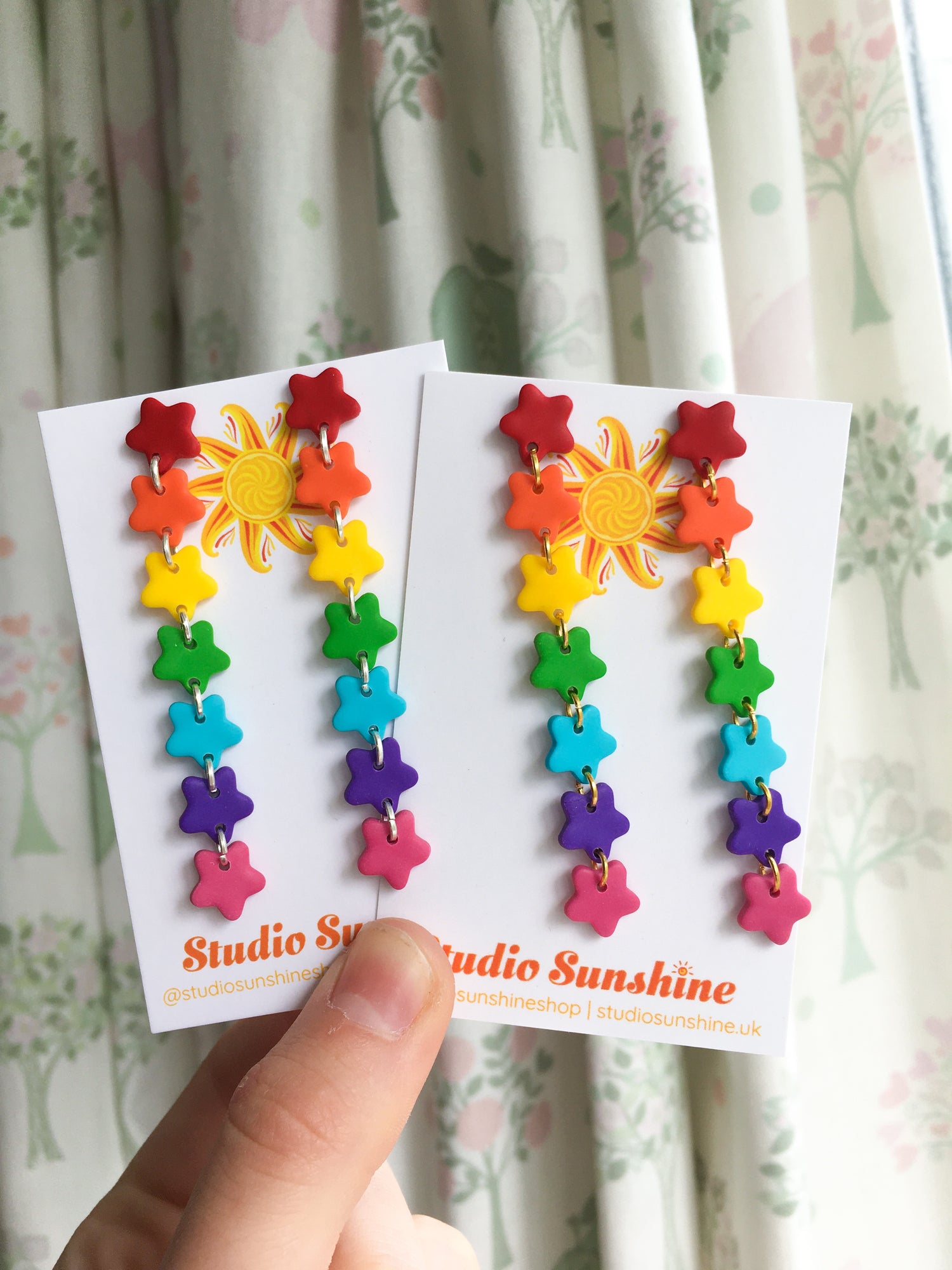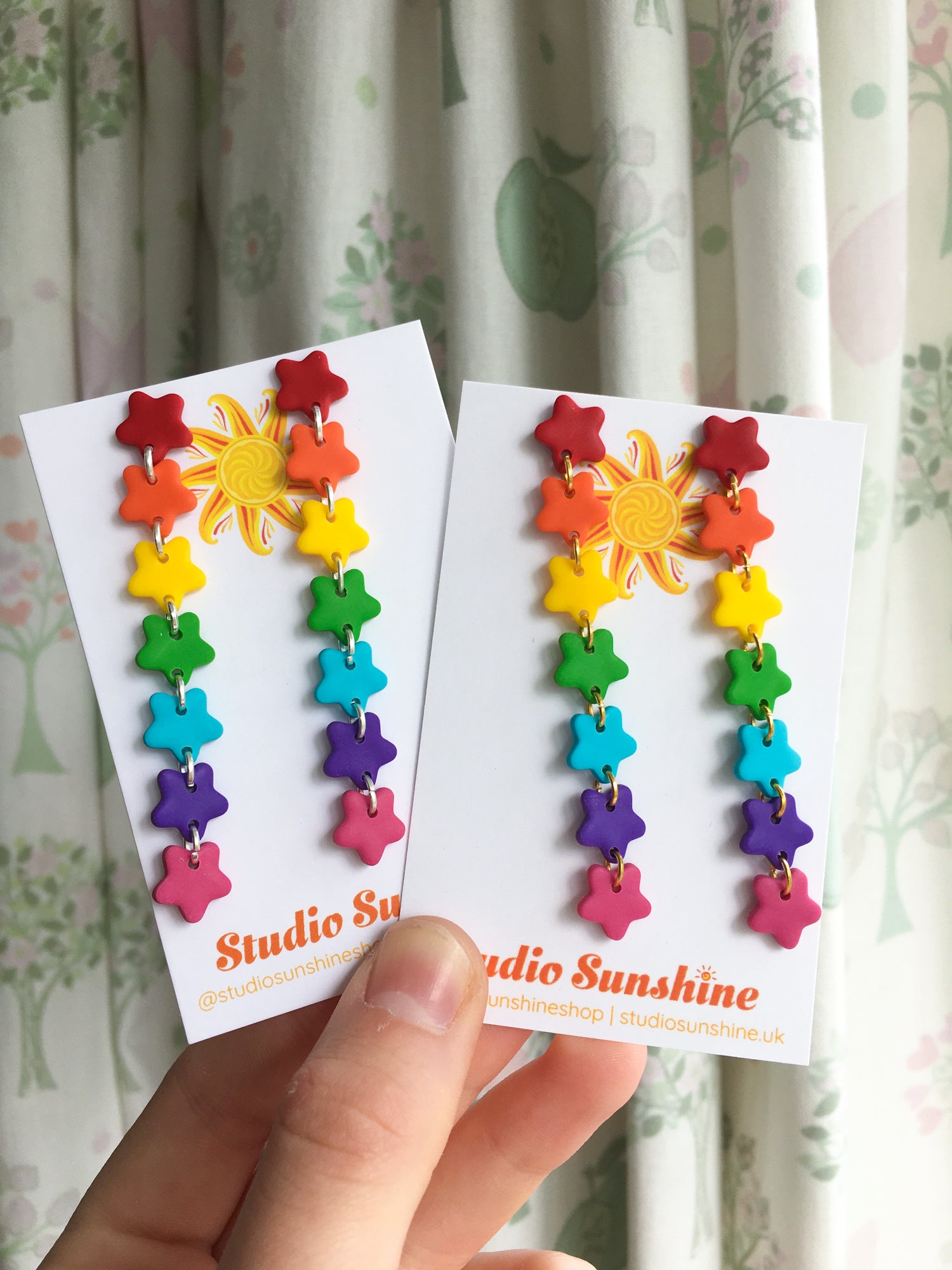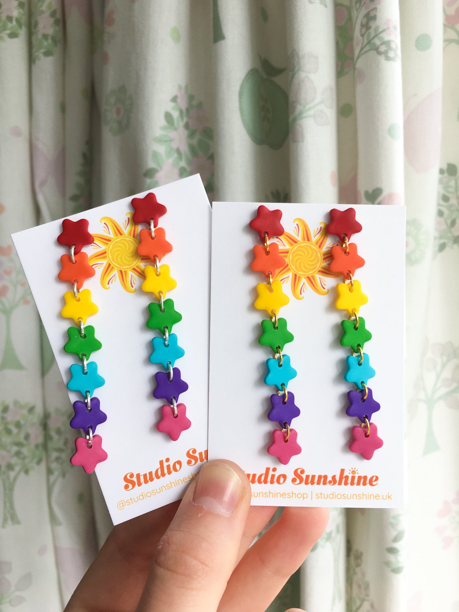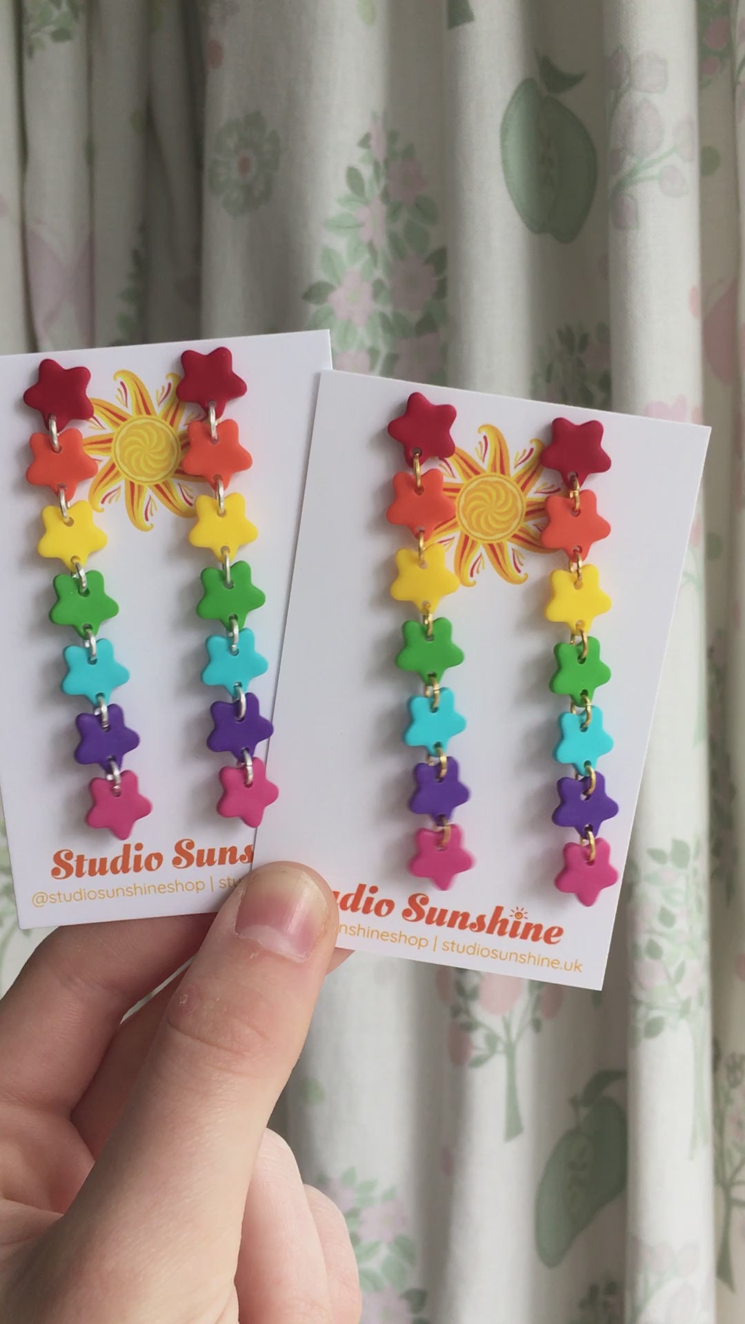 Dangling rainbow stars from red to pink! Available in gold or silver.