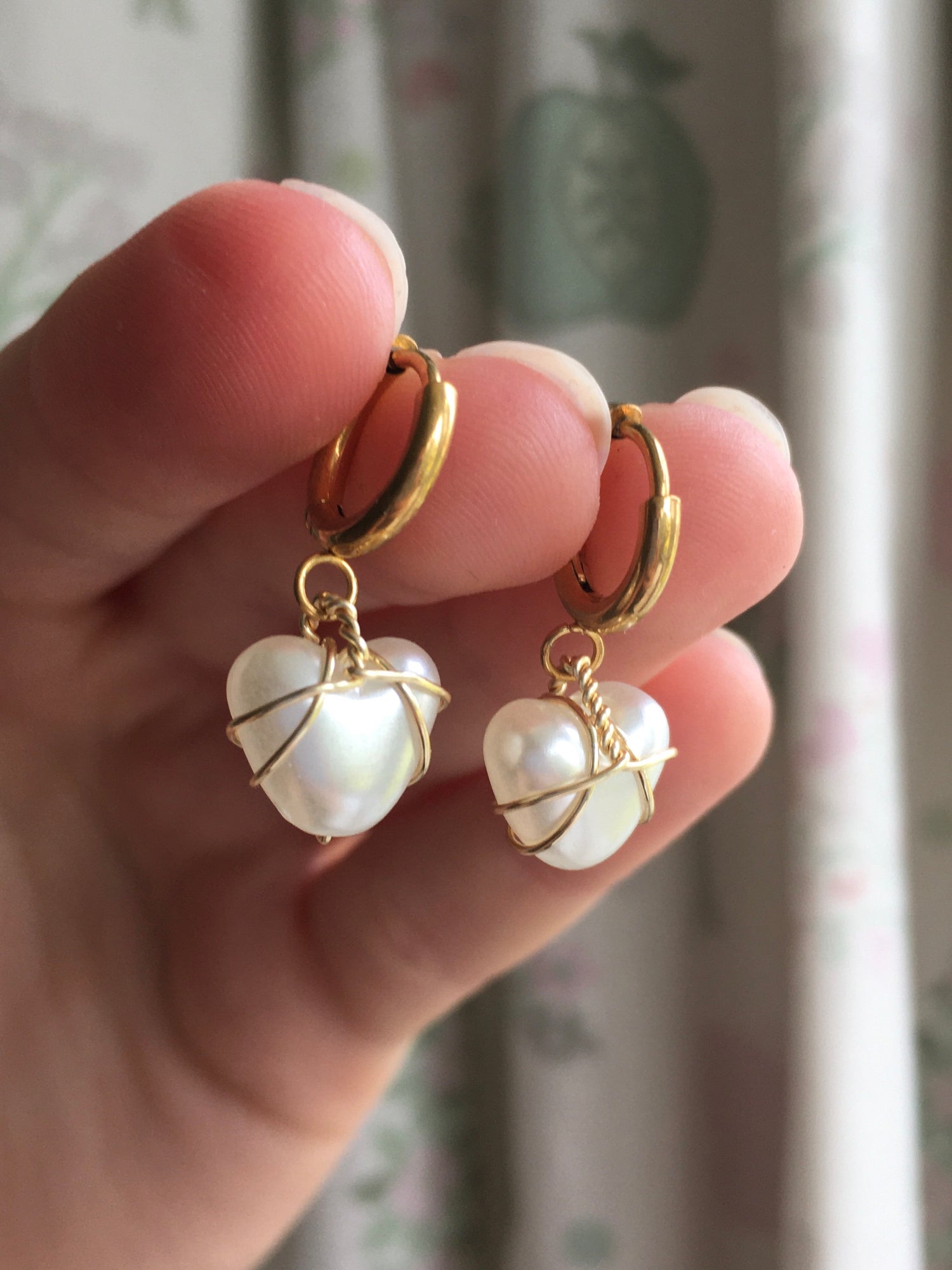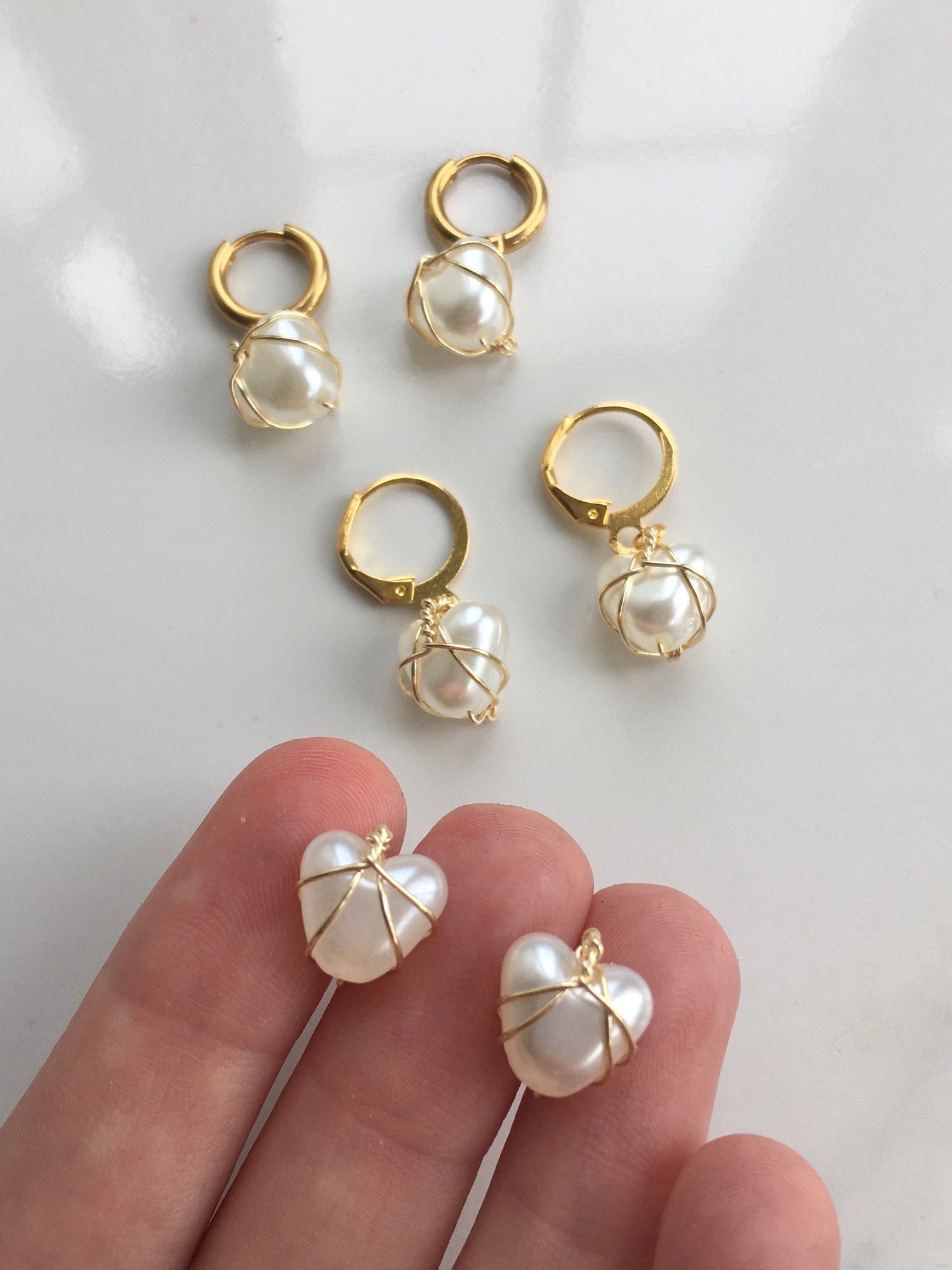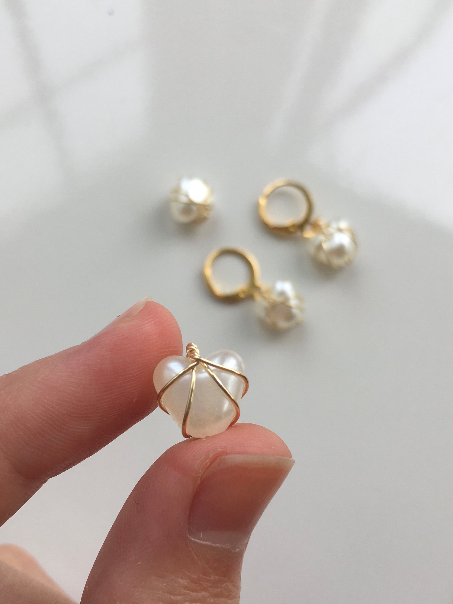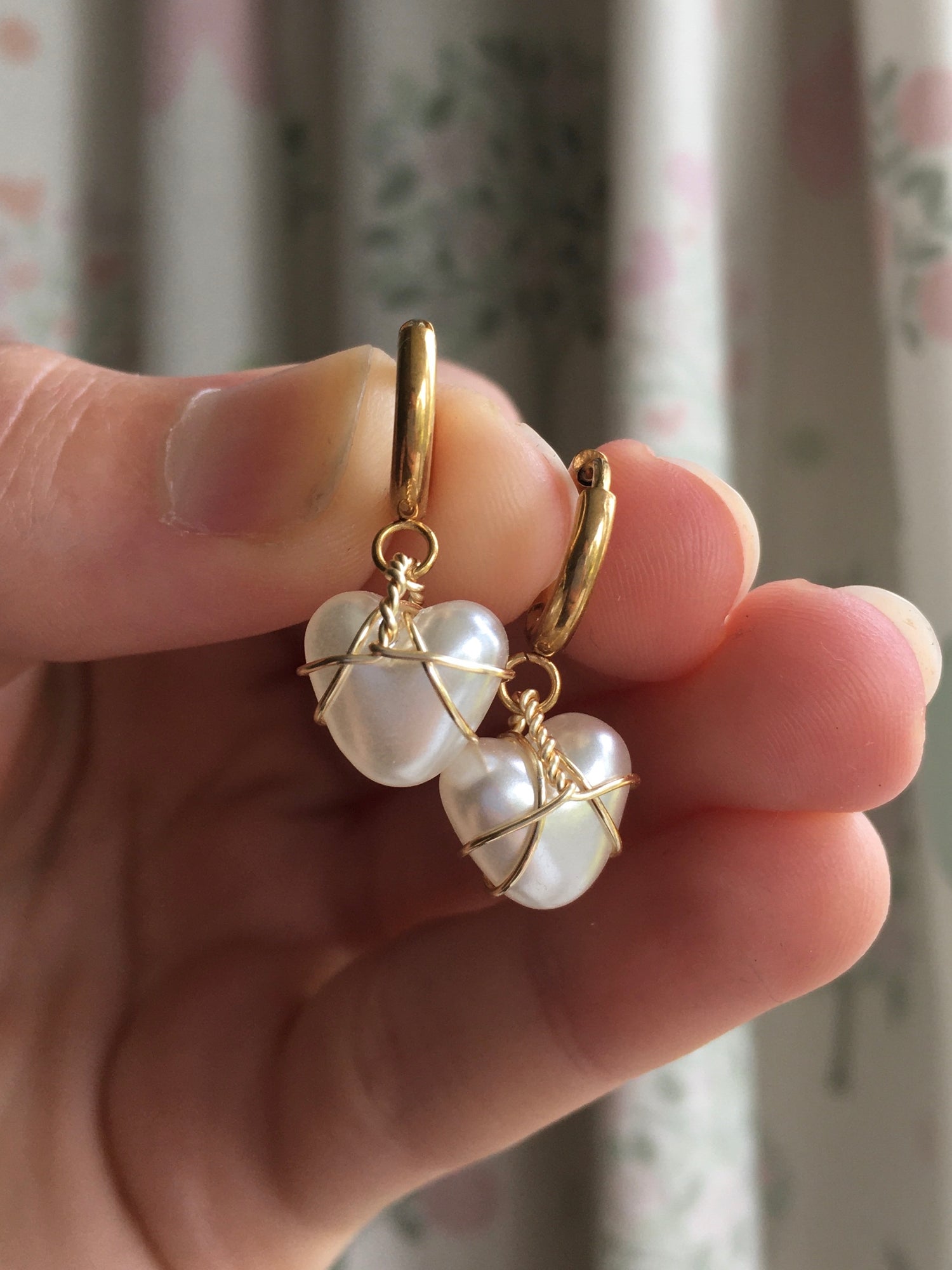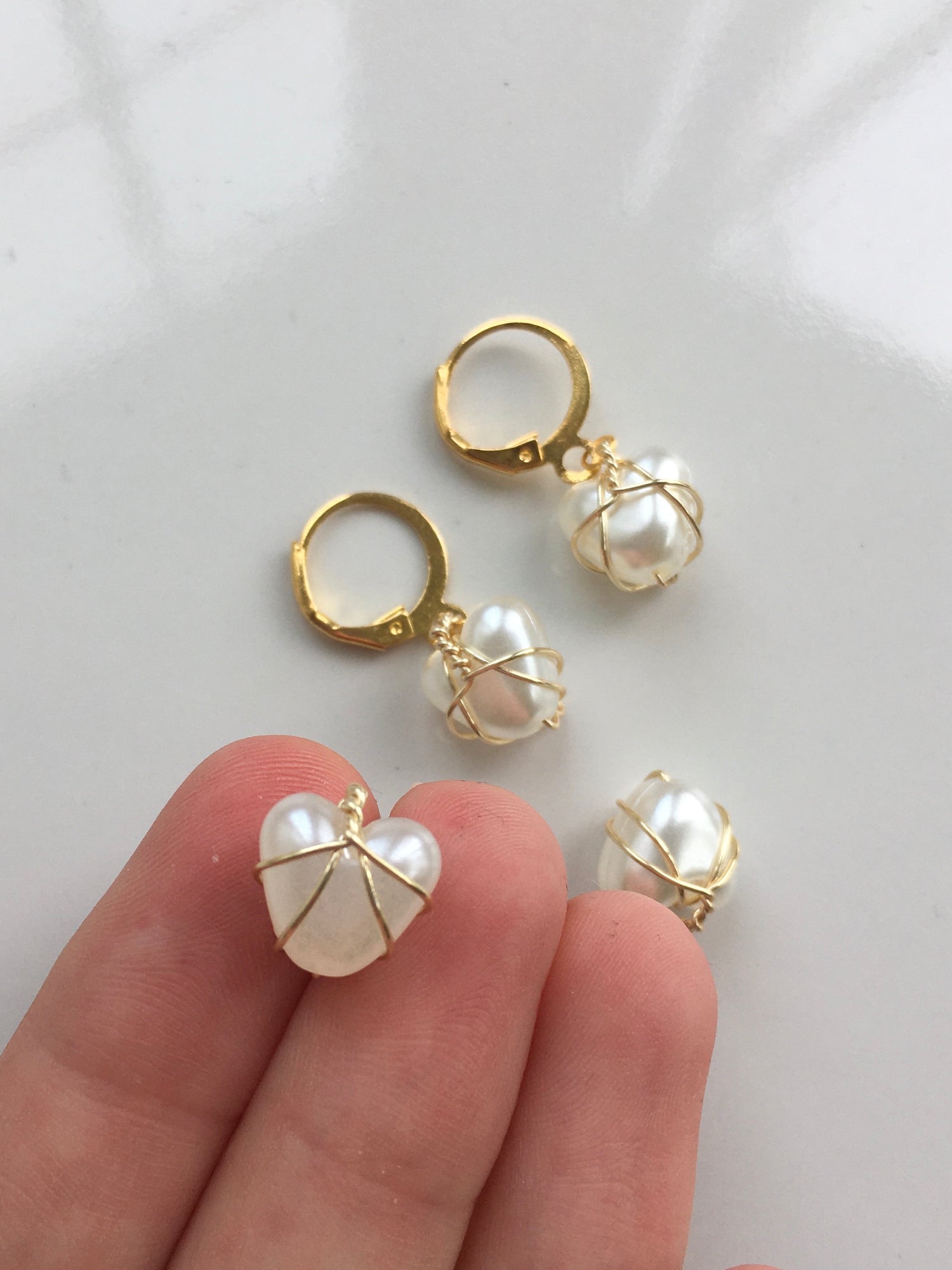 The most adorable, pretty and charming earrings ever! Featuring acrylic pearl hearts handwrapped in wire. ♥