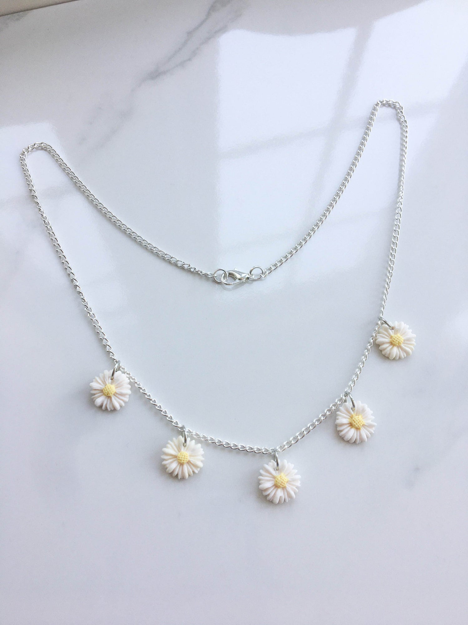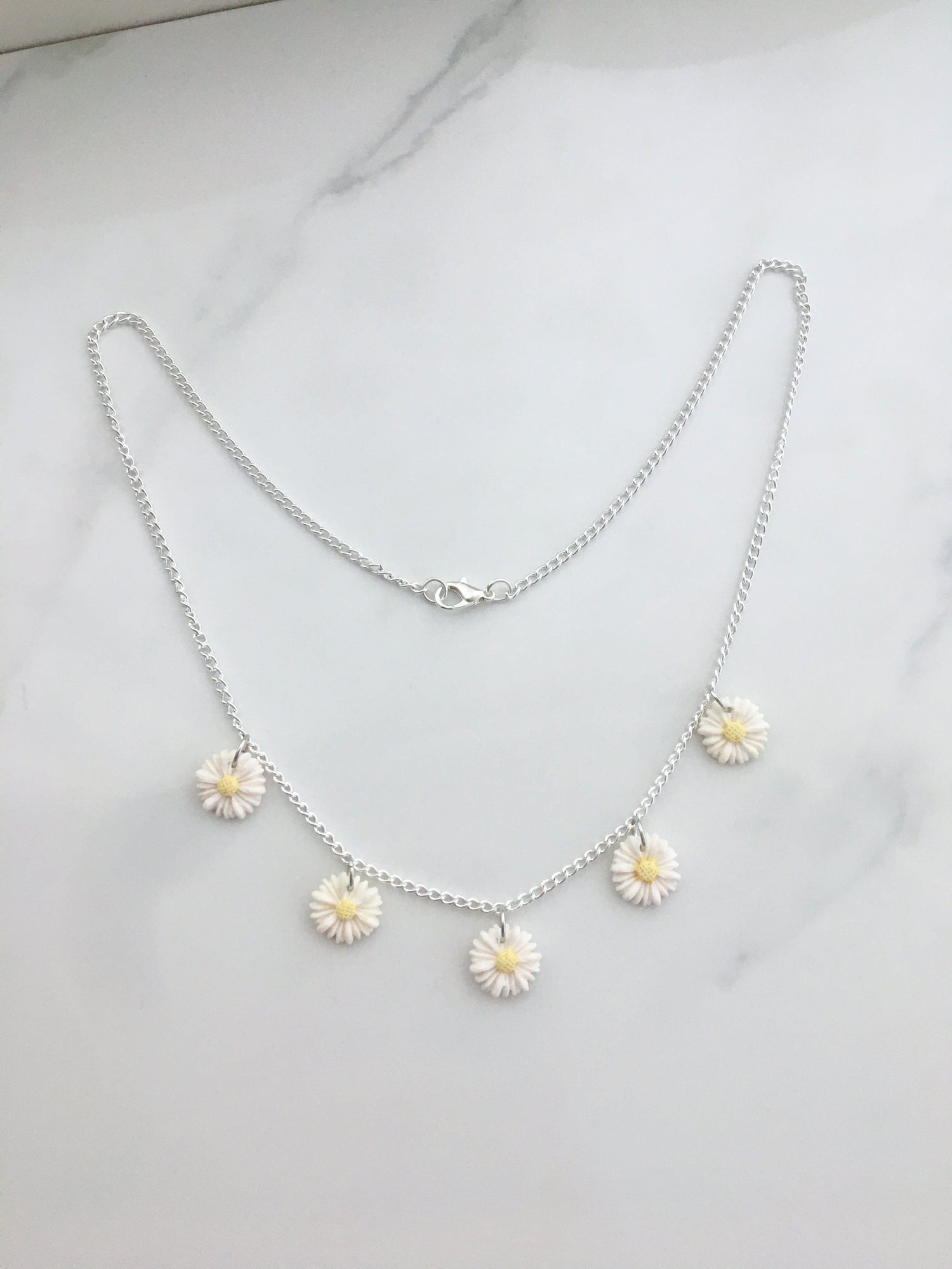 Simple, dainty & elegant. This adorable Daisy Chain necklace features 5 daisy flower pieces along a silver plated chain! Made to match the Daisy Chain dangles, this is perfect for long summer dresses and sunsets.