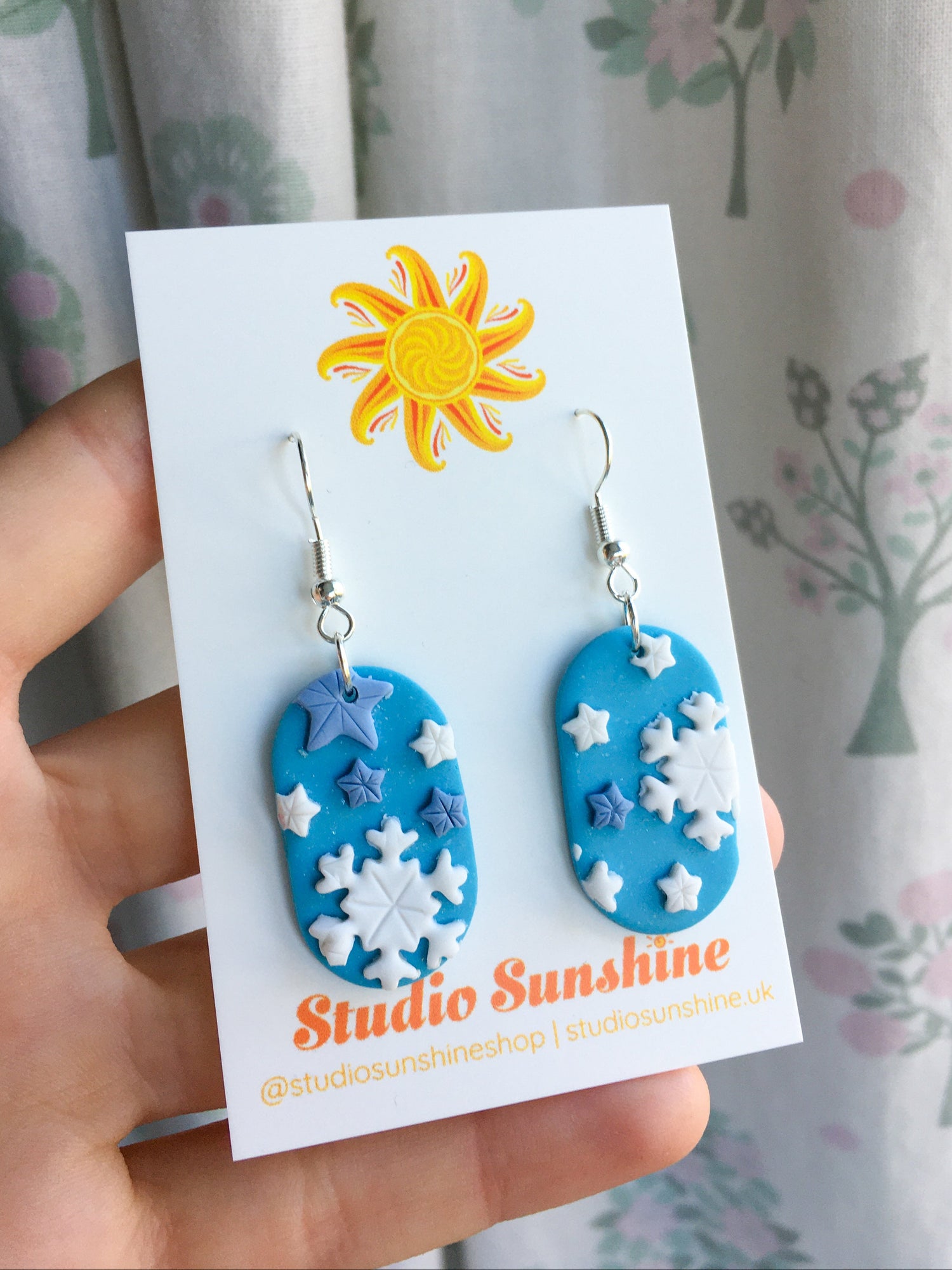 This slab captures that flurry of snow we all long for! With white snowflakes and periwinkle stars on a pale blue background. This pair consists of capsules.
