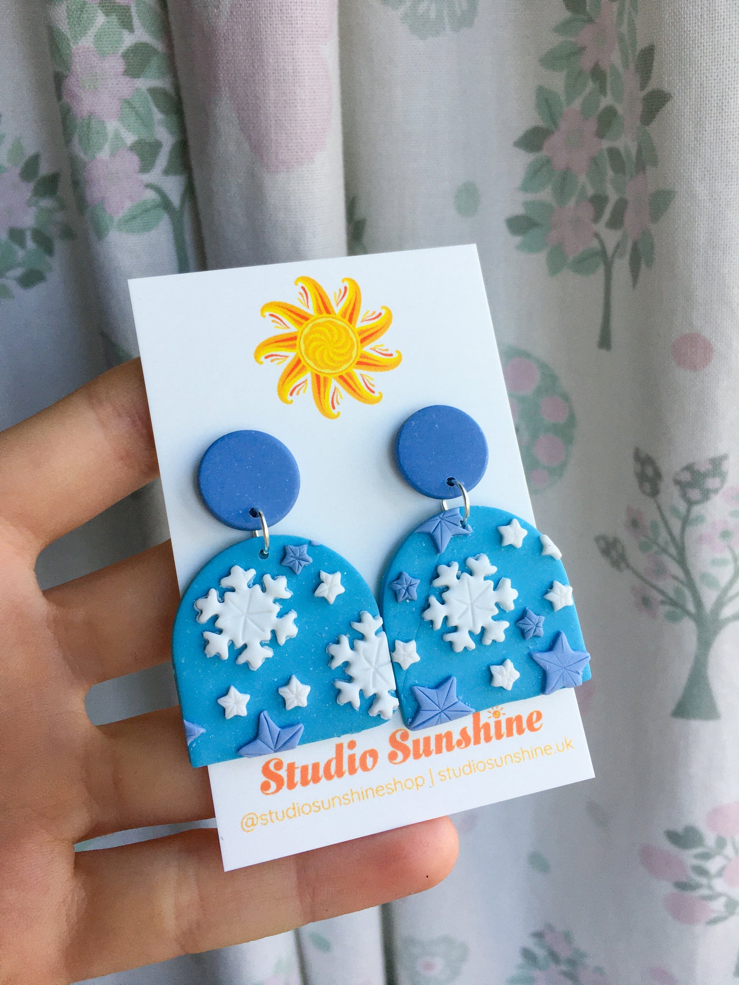 This slab captures that flurry of snow we all long for! With white snowflakes and periwinkle stars on a pale blue background. This pair consists of stud topped arches.