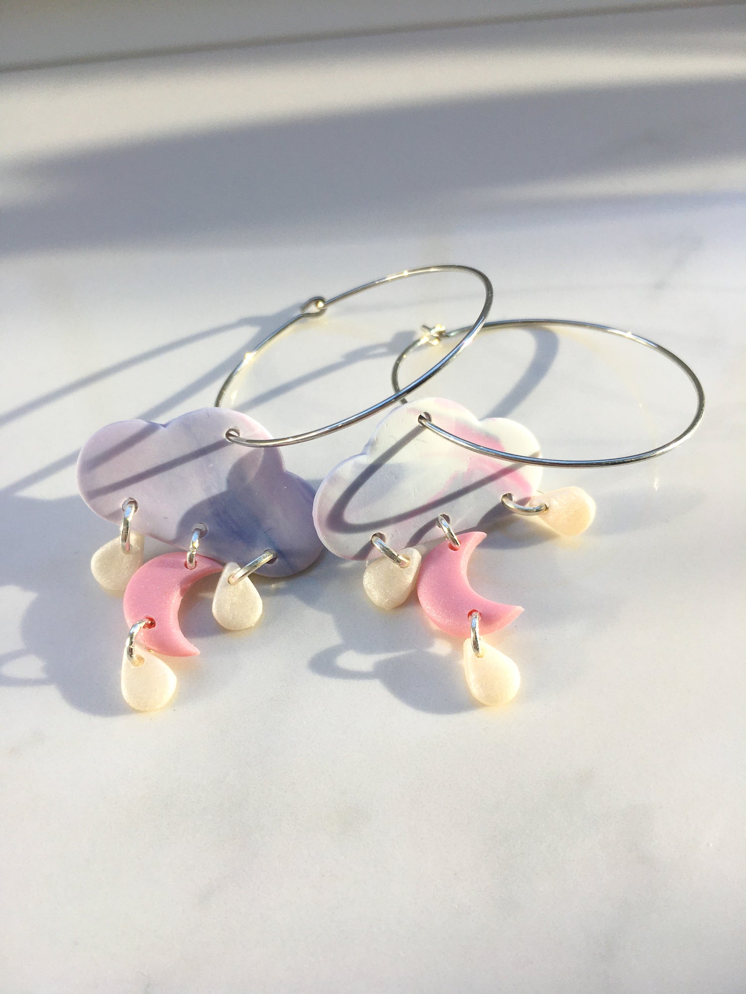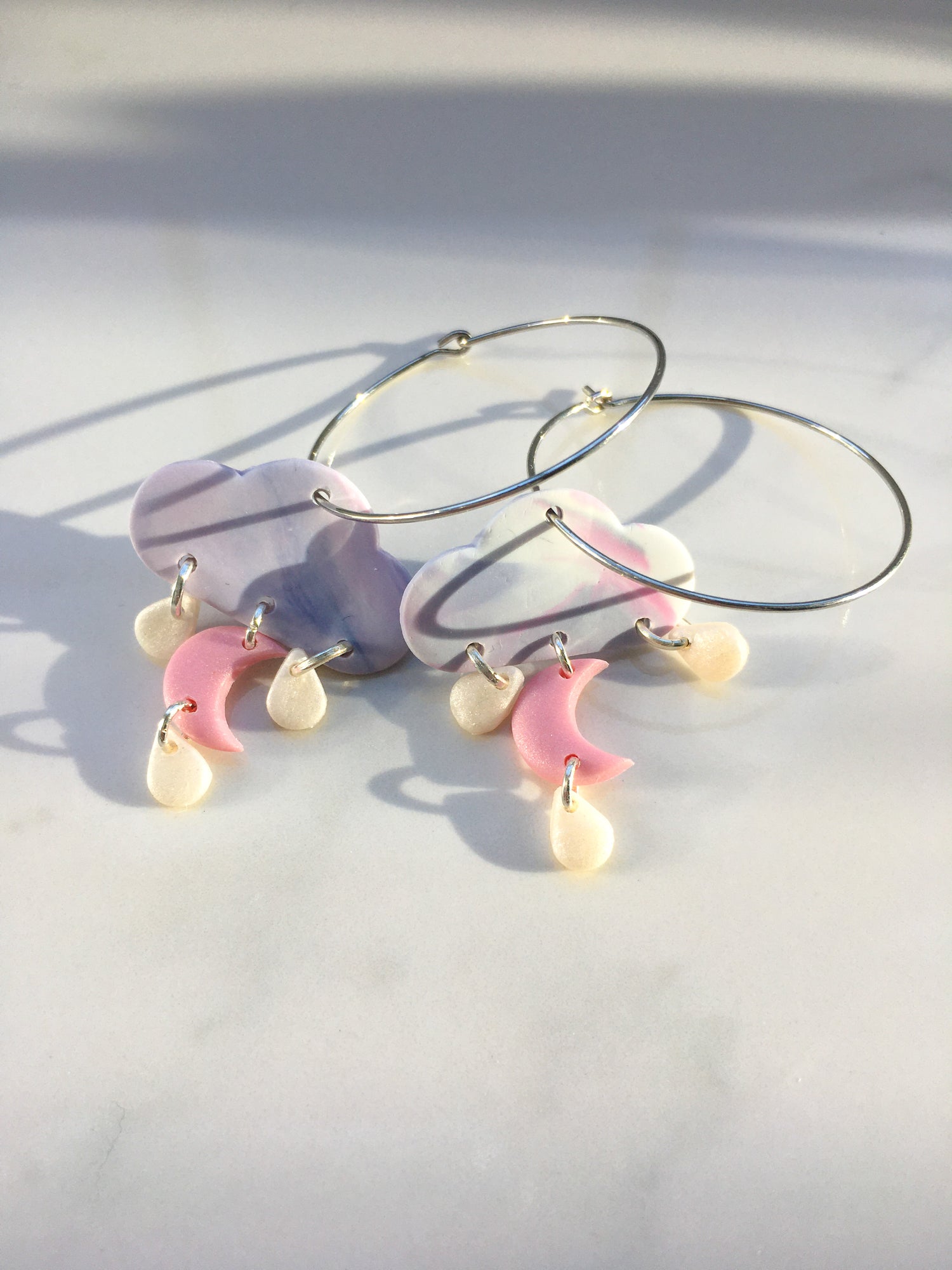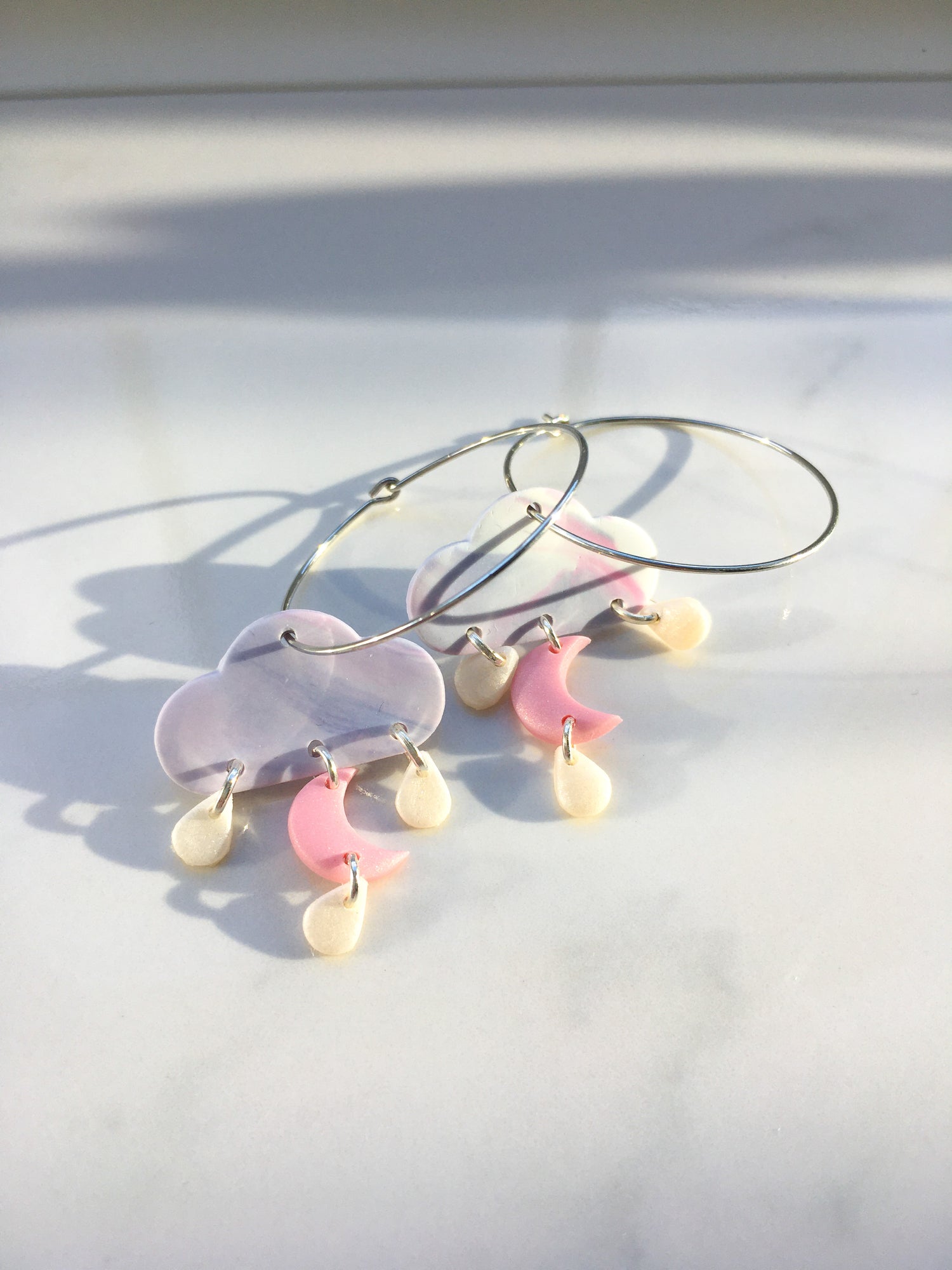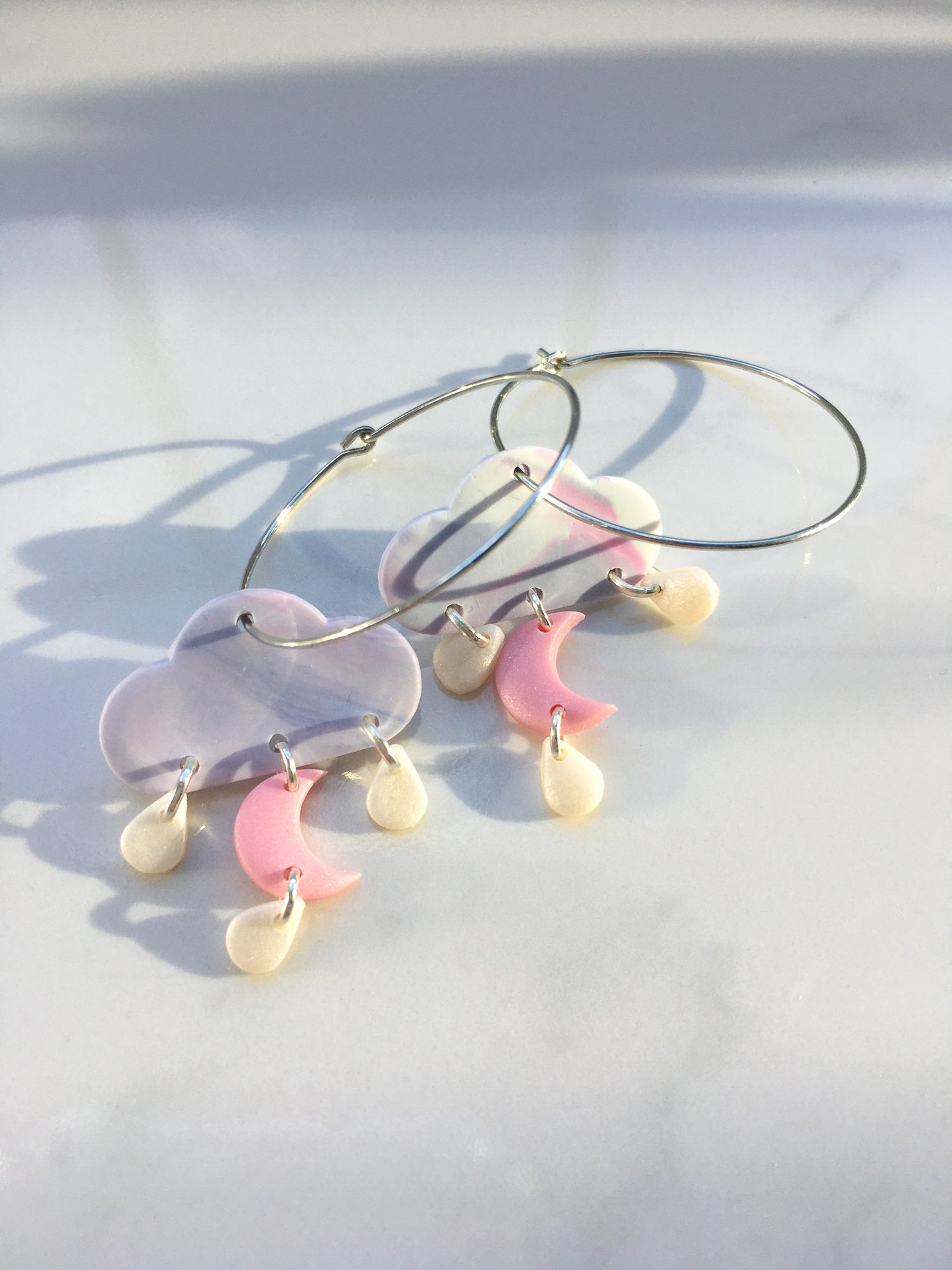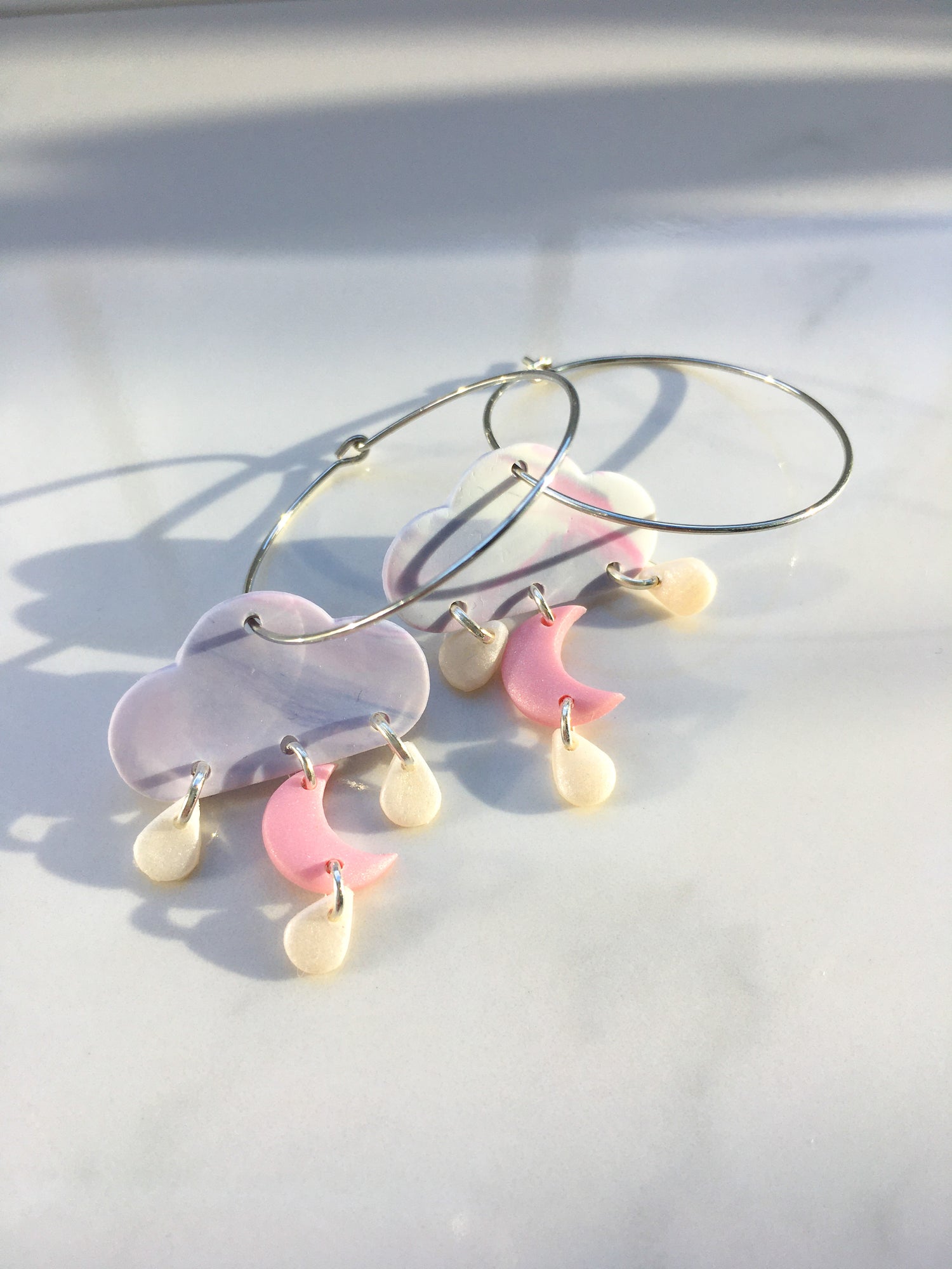 The long-awaited pastel pink & purple marbled Dream Clouds! Dangling from a hoop with a pearlised pink moon and drops of ivory to send you into sweet, sweet slumbers!