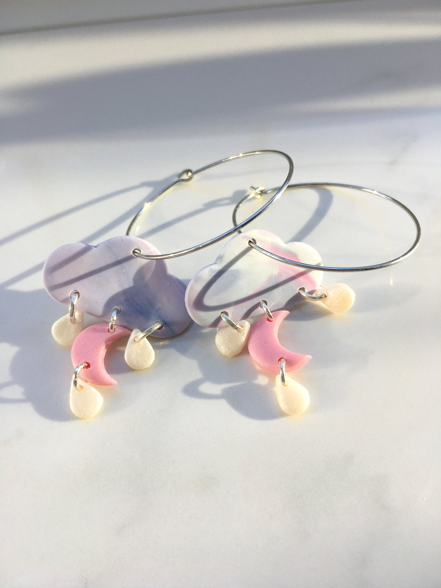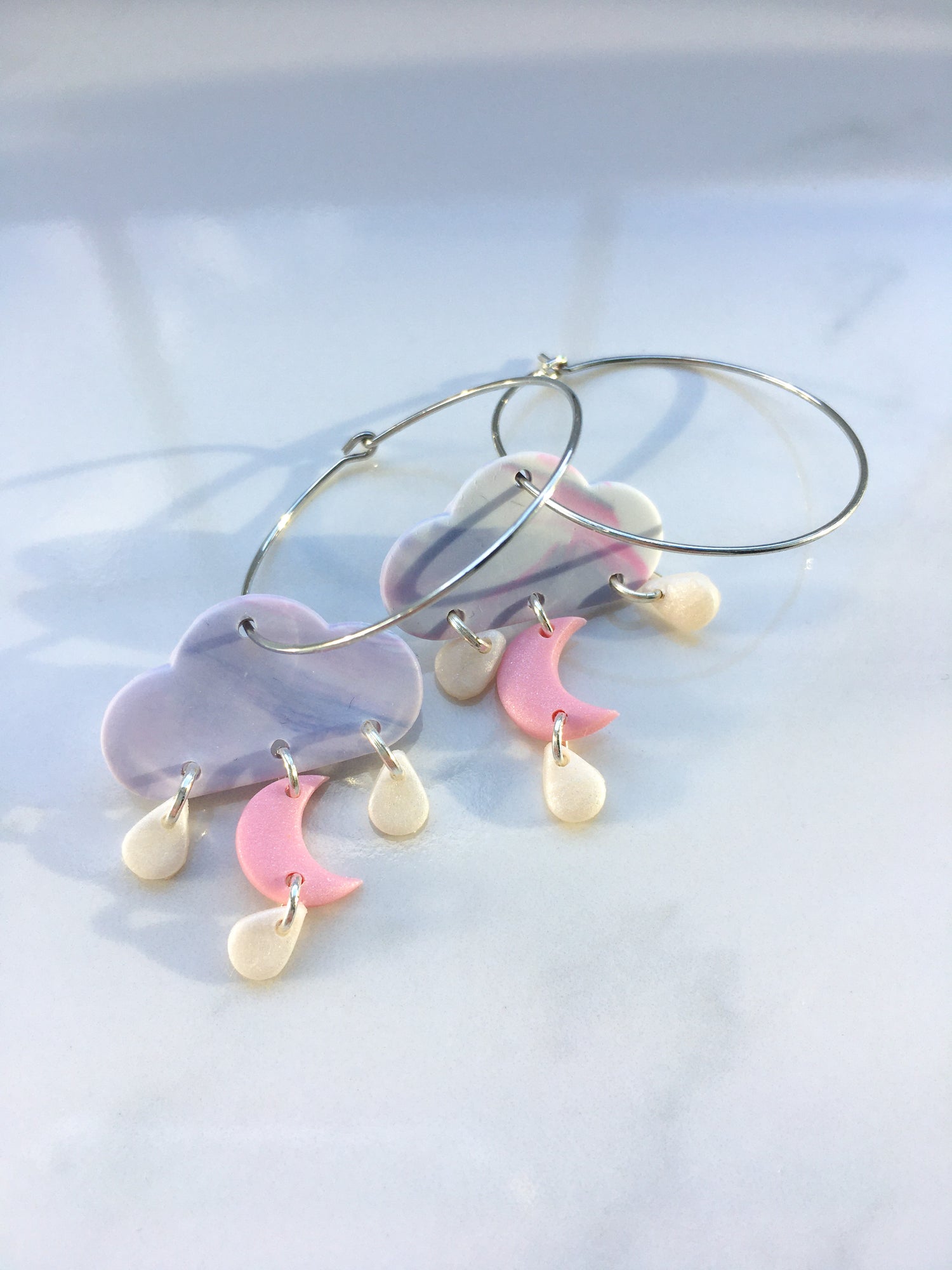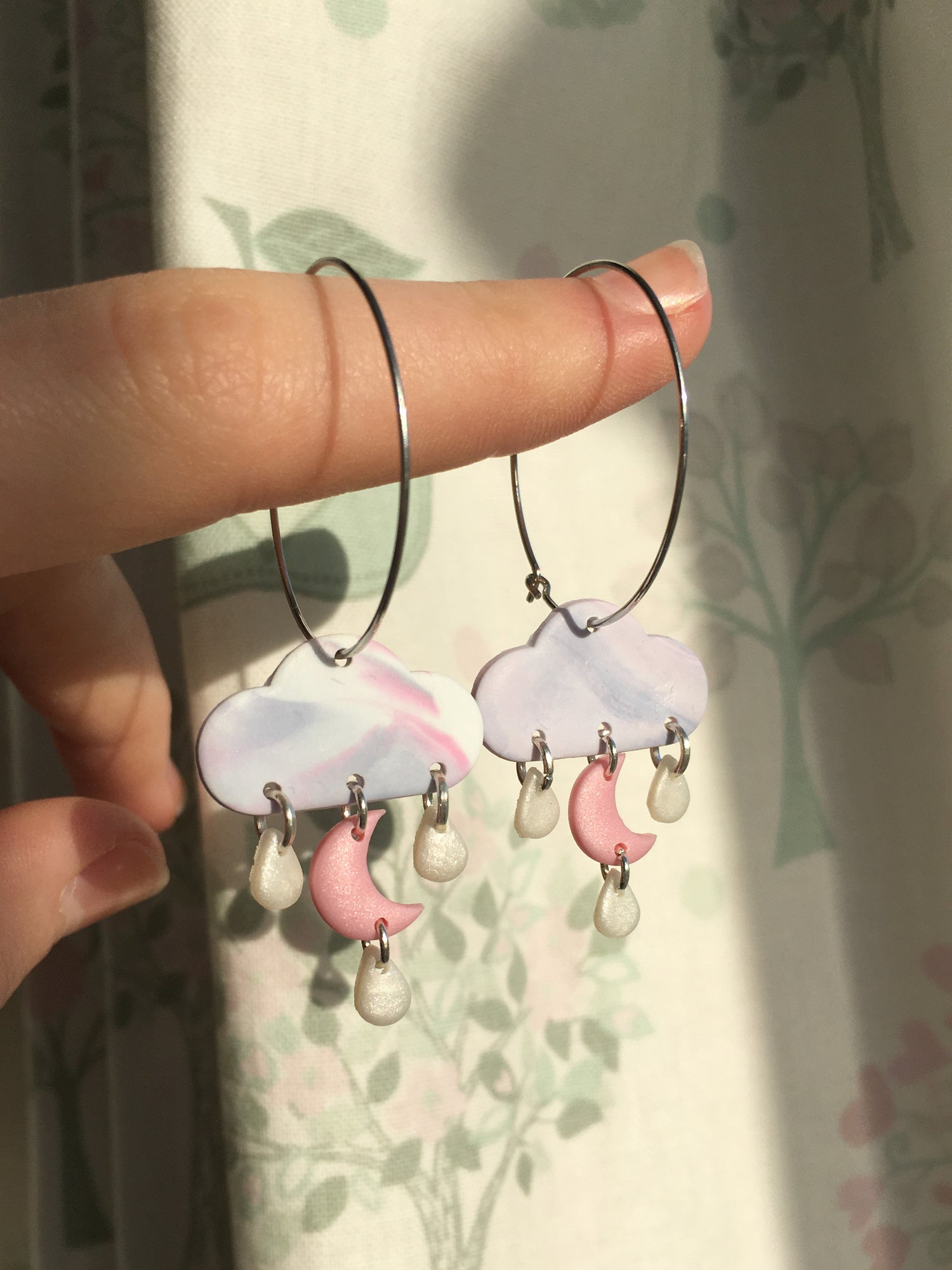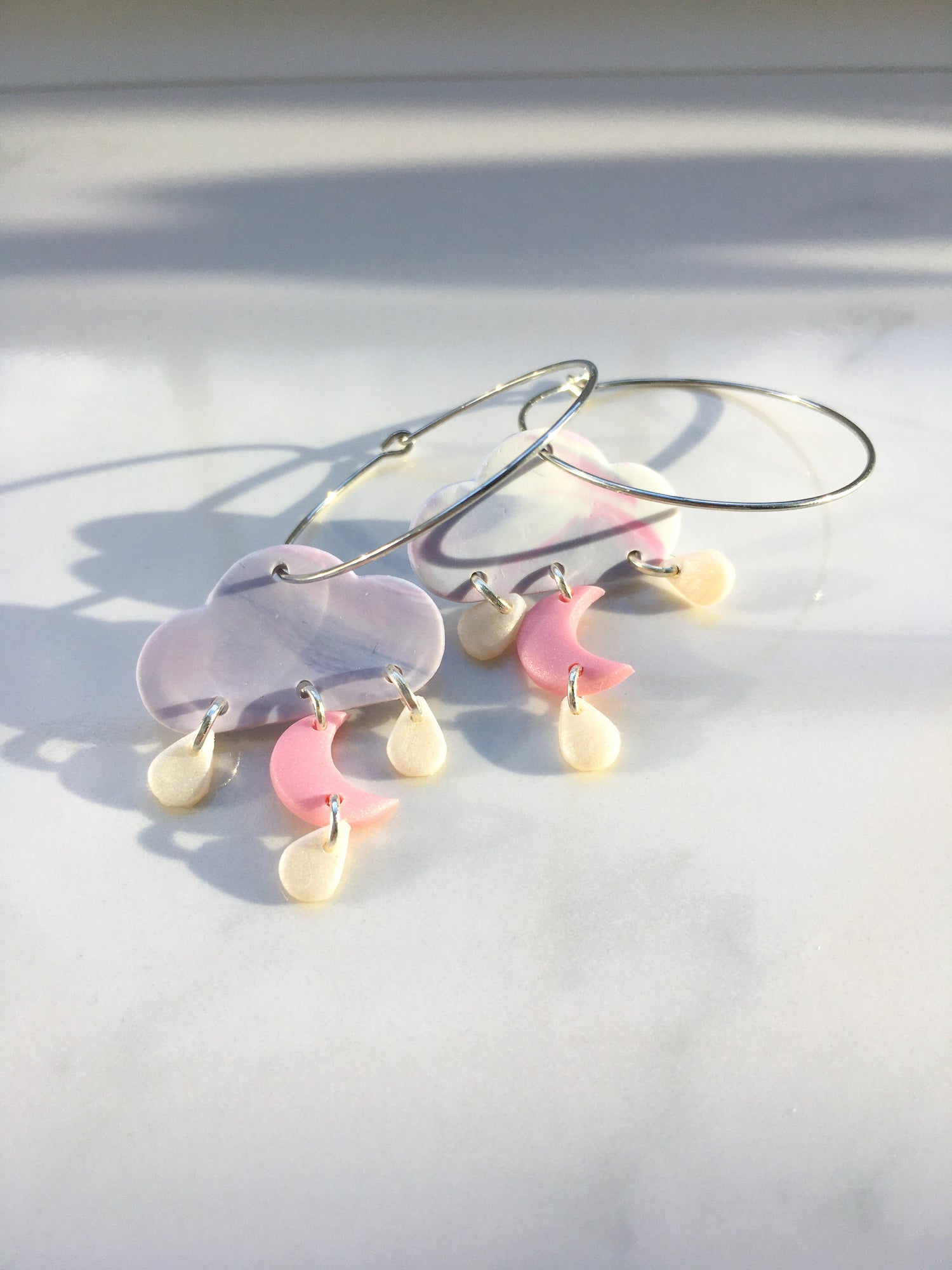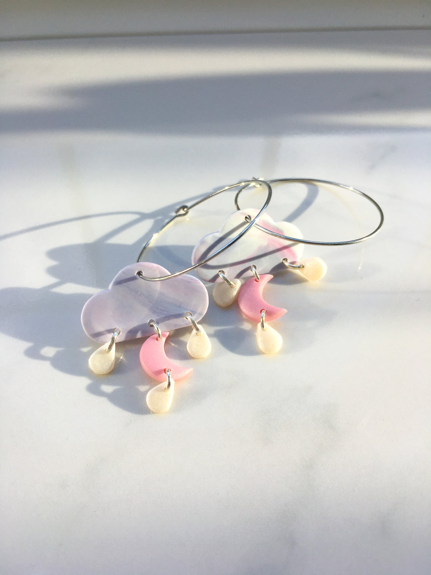 The long-awaited pastel pink & purple marbled Dream Clouds! Dangling from a hoop with a pearlised pink moon and drops of ivory to send you into sweet, sweet slumbers!