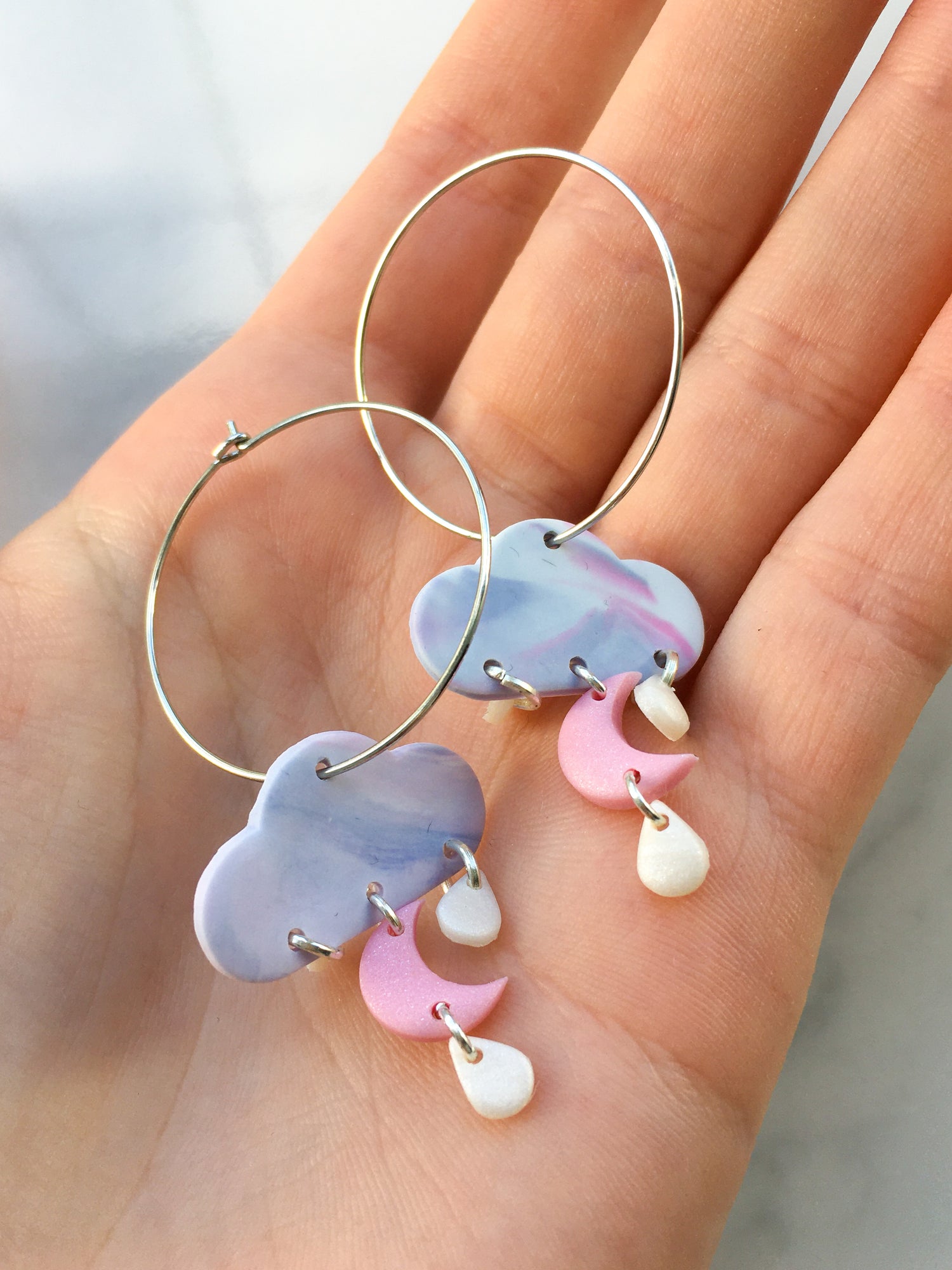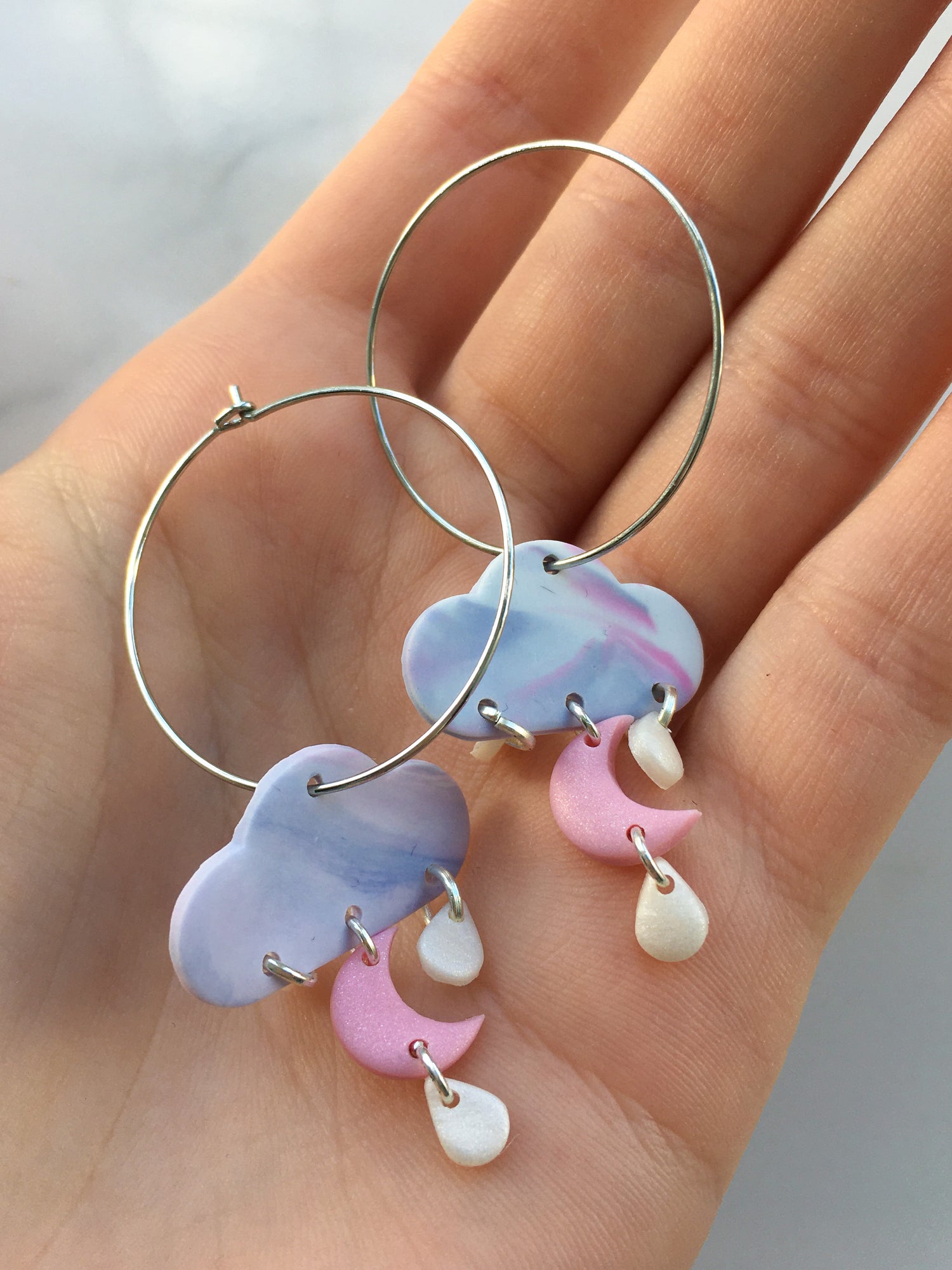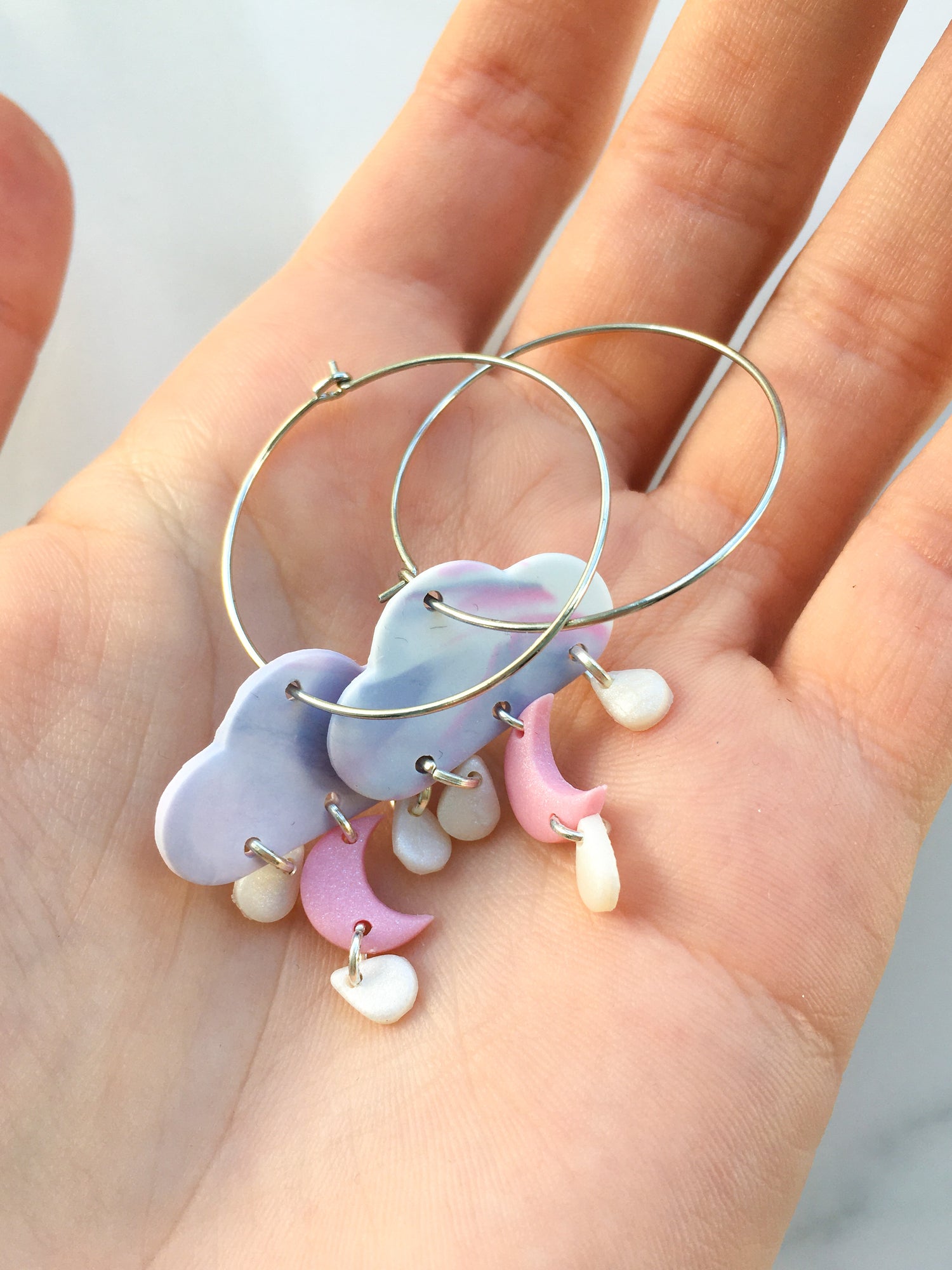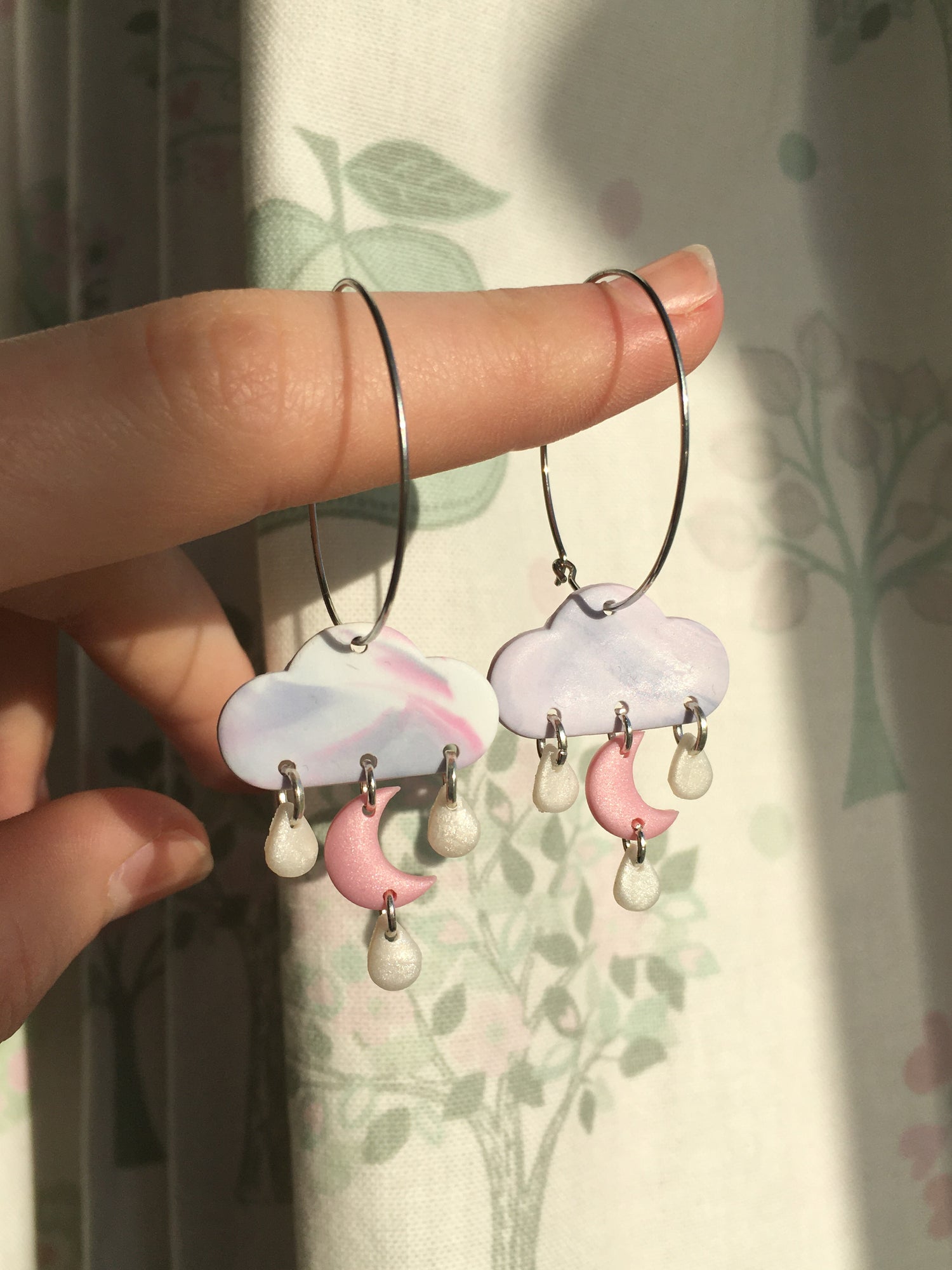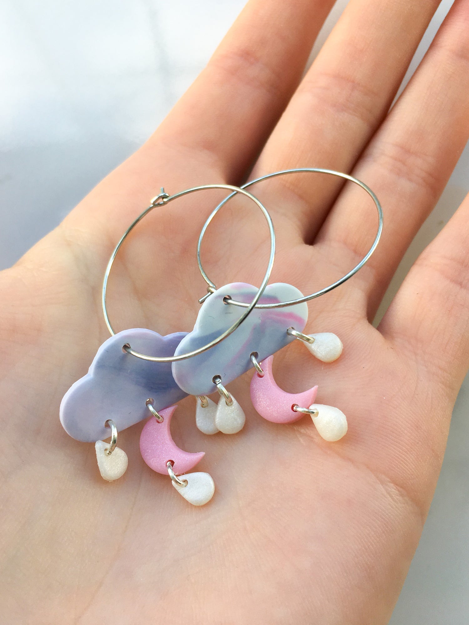 The long-awaited pastel pink & purple marbled Dream Clouds! Dangling from a hoop with a pearlised pink moon and drops of ivory to send you into sweet, sweet slumbers!