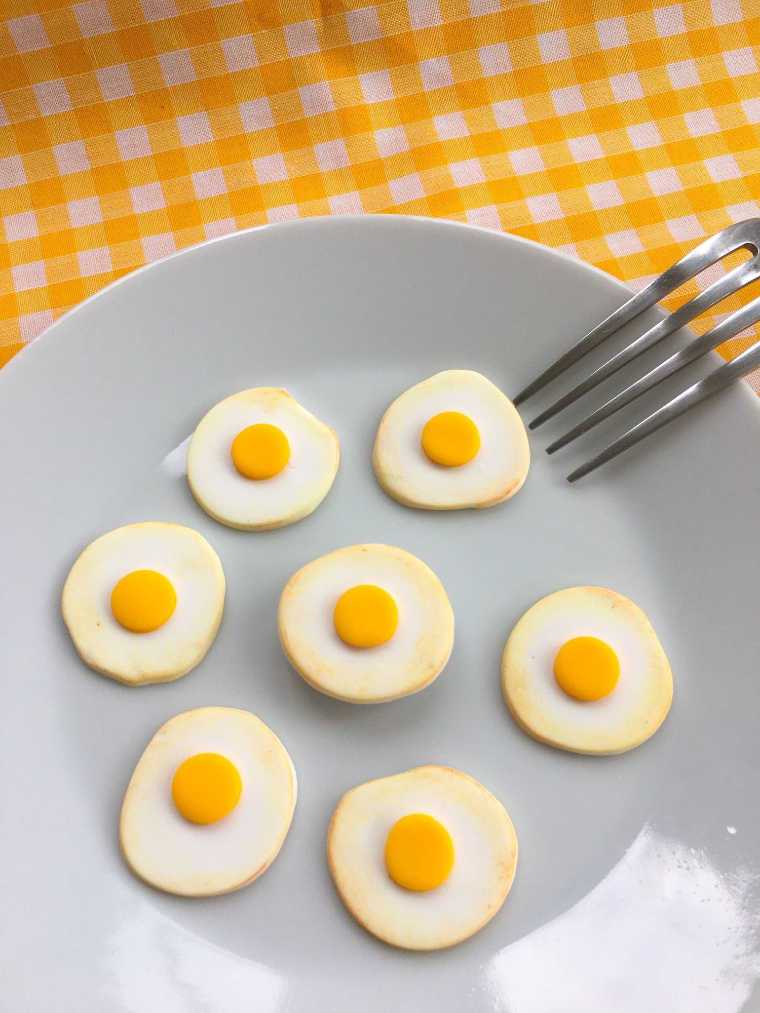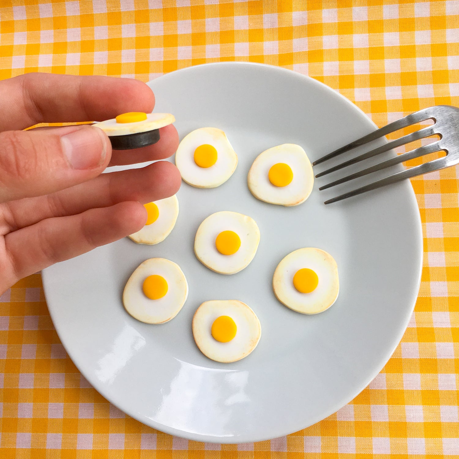 Add these fun fried egg magnets to your fridge! Handsculpted with polymer clay and dusted with oil pastels for that sizzled look.