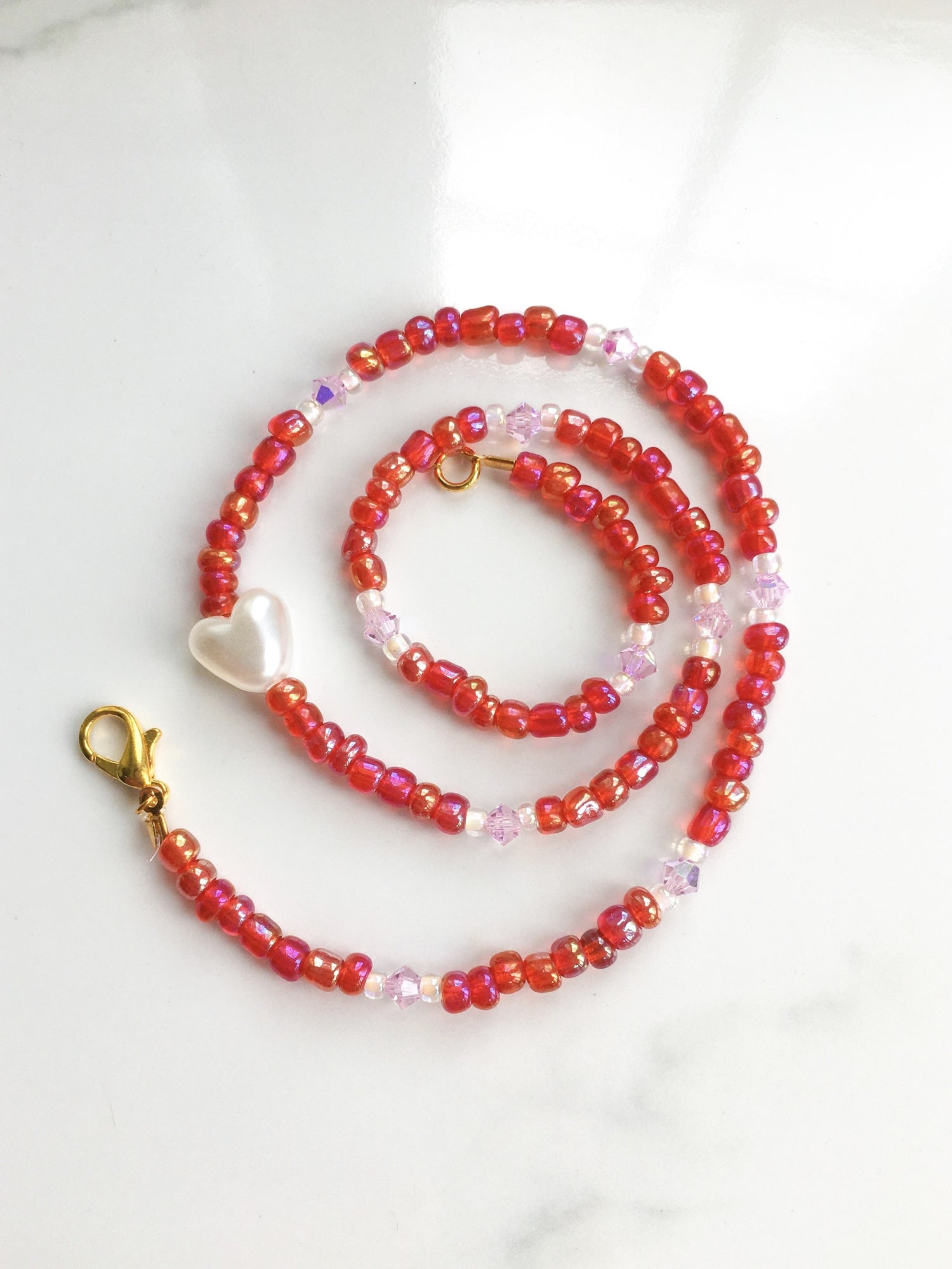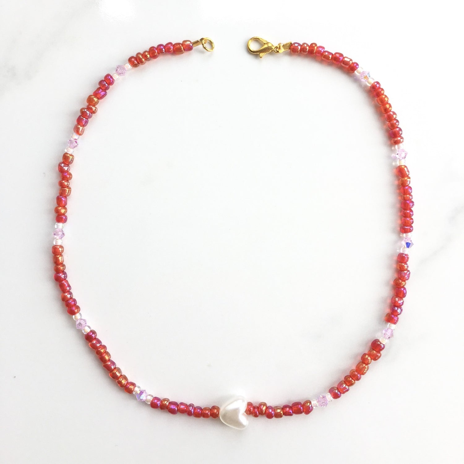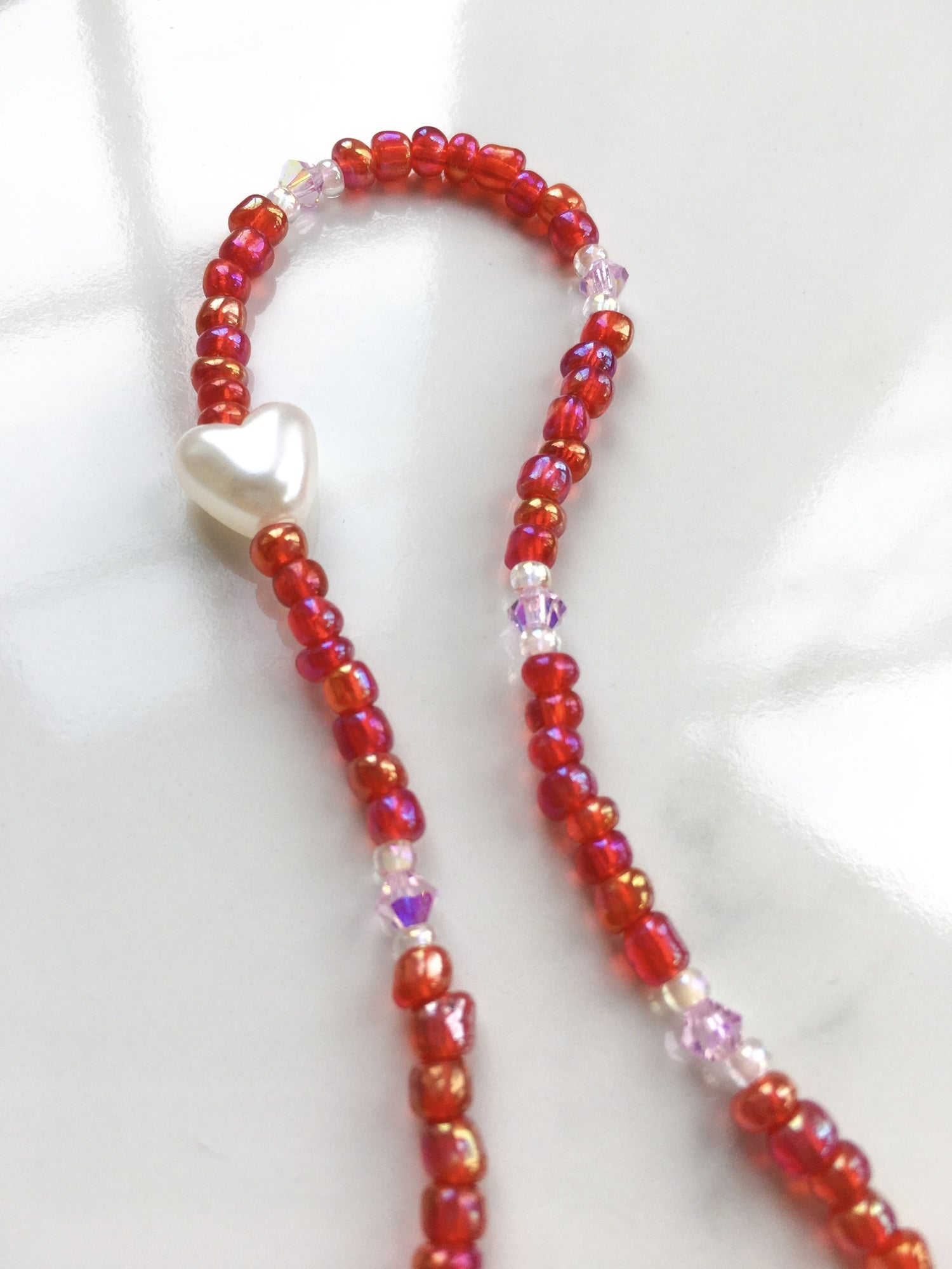 The muse of love poetry. This piece features glimmering red glass beads with baby pink bicone interspersions, complete with an acrylic pearlised central heart.