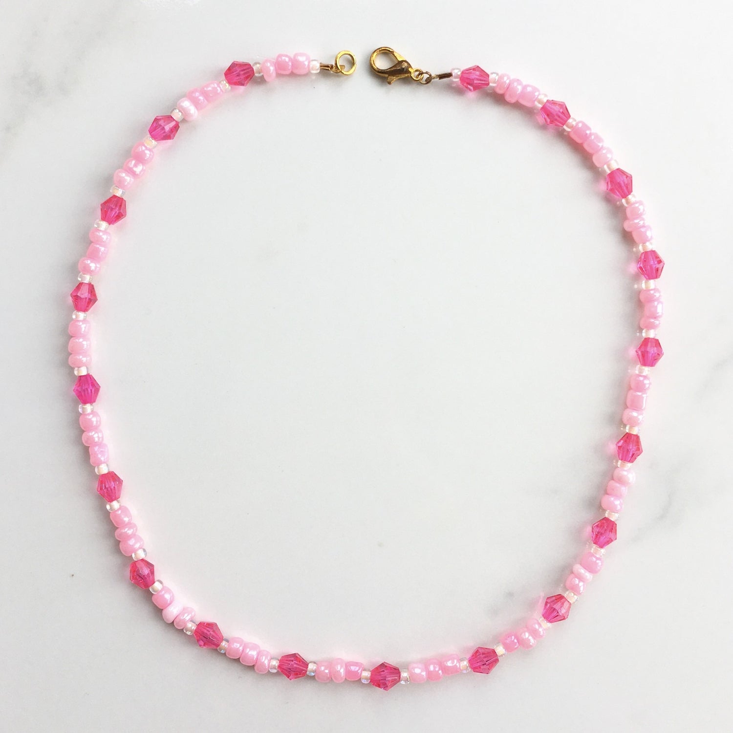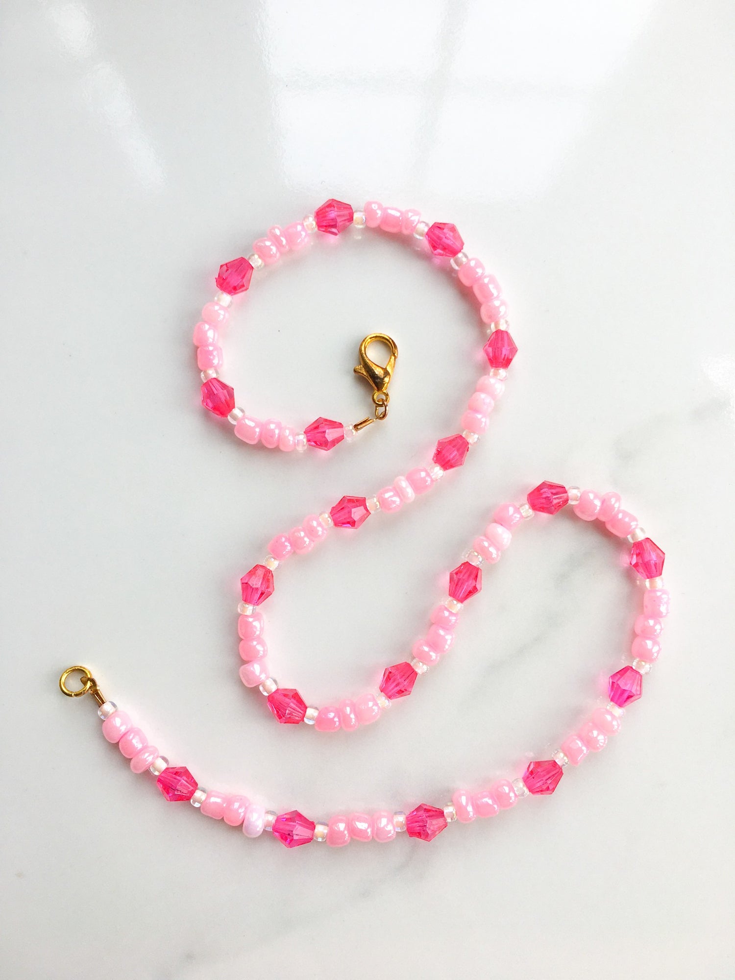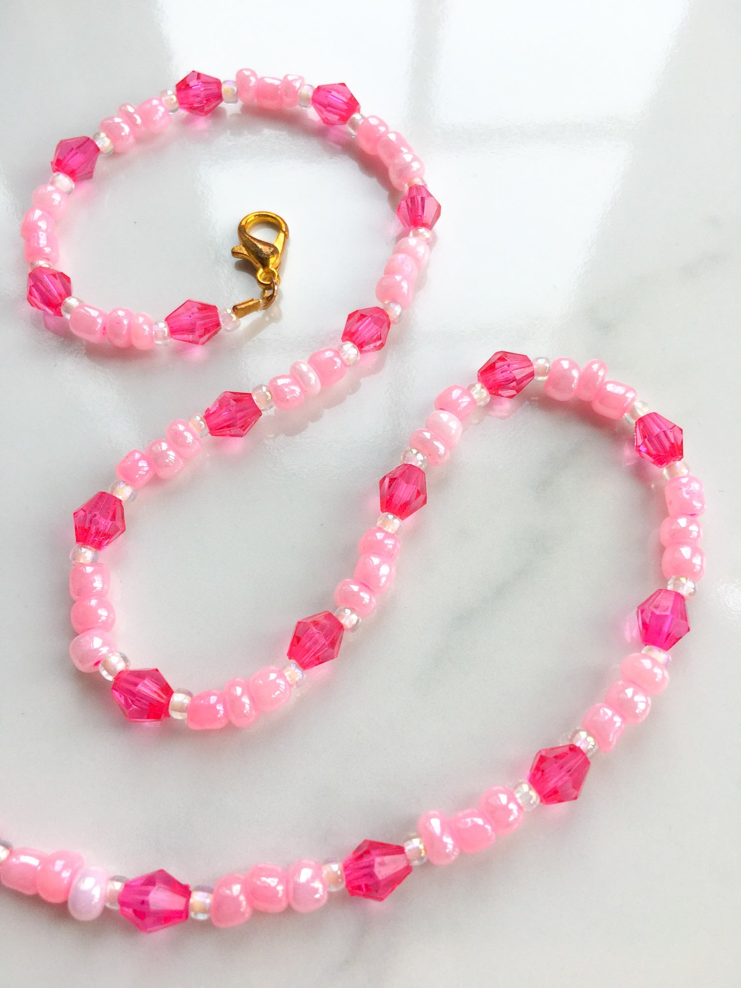 The muse of sacred poetry. This piece features shimmering pink glass beads with hot pink acrylic bicone interspersions.