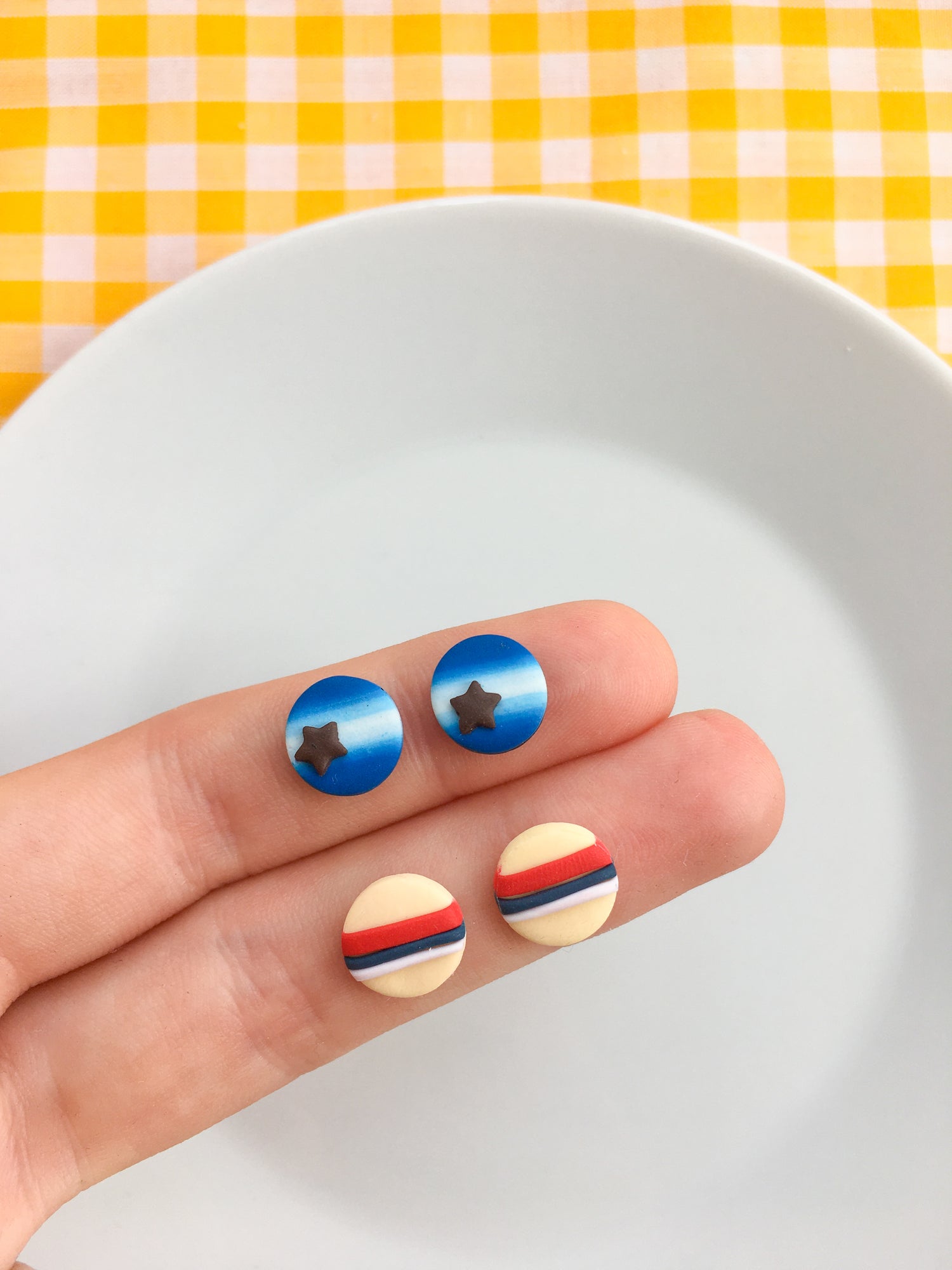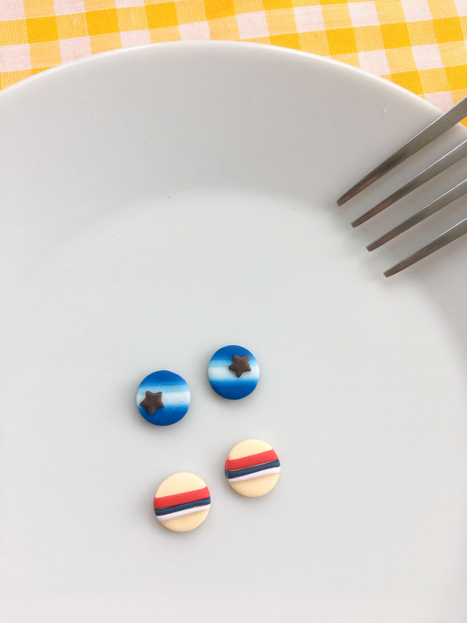 Inspired by two popular creamy space confectioneries, this stud pack features micro studs in a blue galaxy design with a tiny brown star and a milky white button with red and blue stripes.