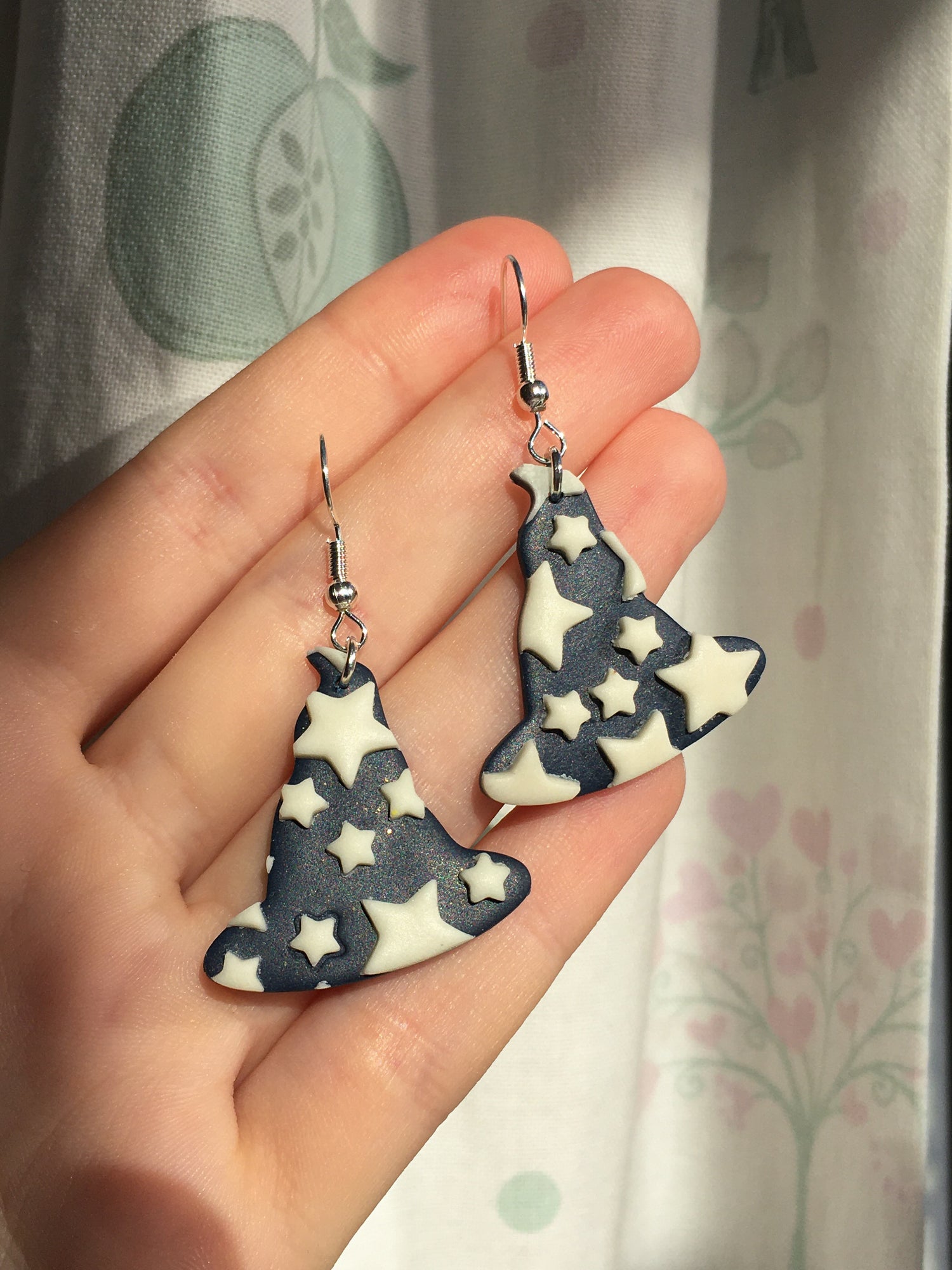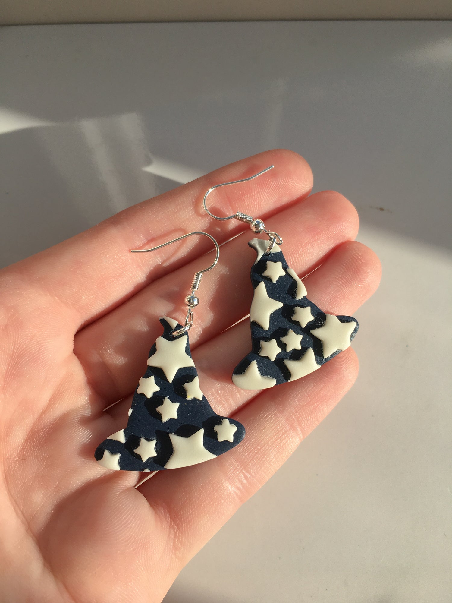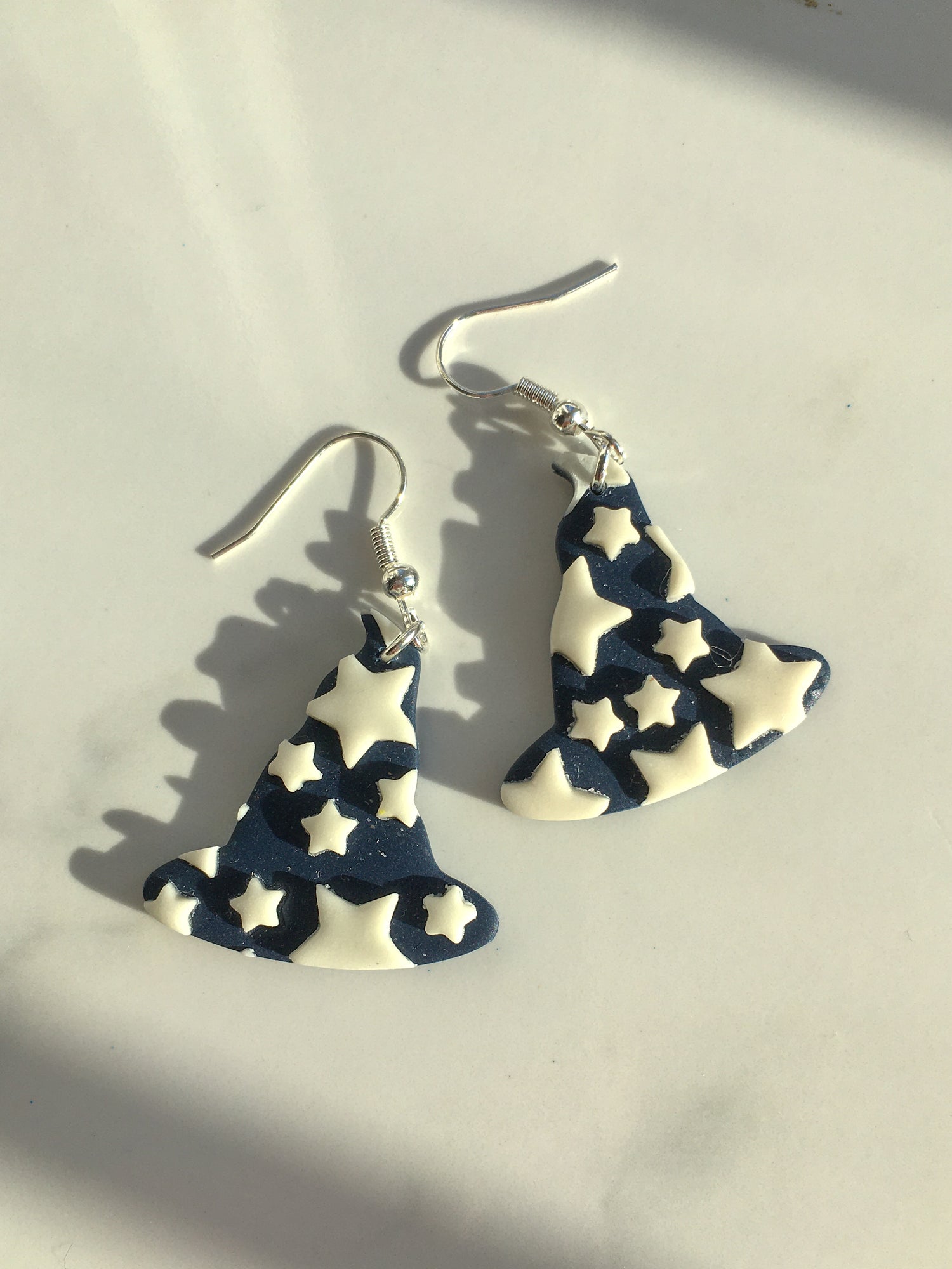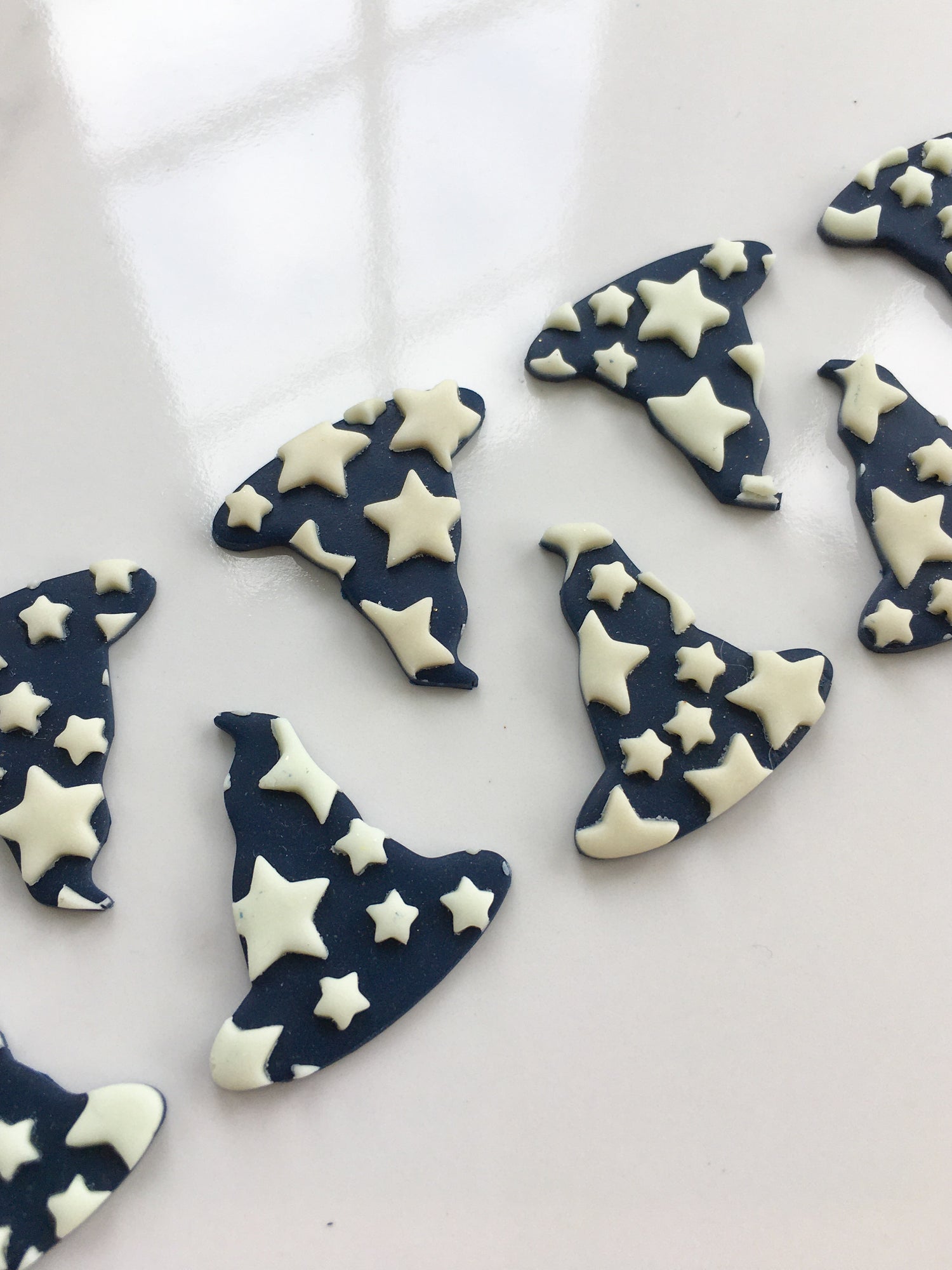 These adorable Wizard Hats feature glow-in-the-dark stars of varying size, on a sparkling navy background. The cutest Halloween pair.