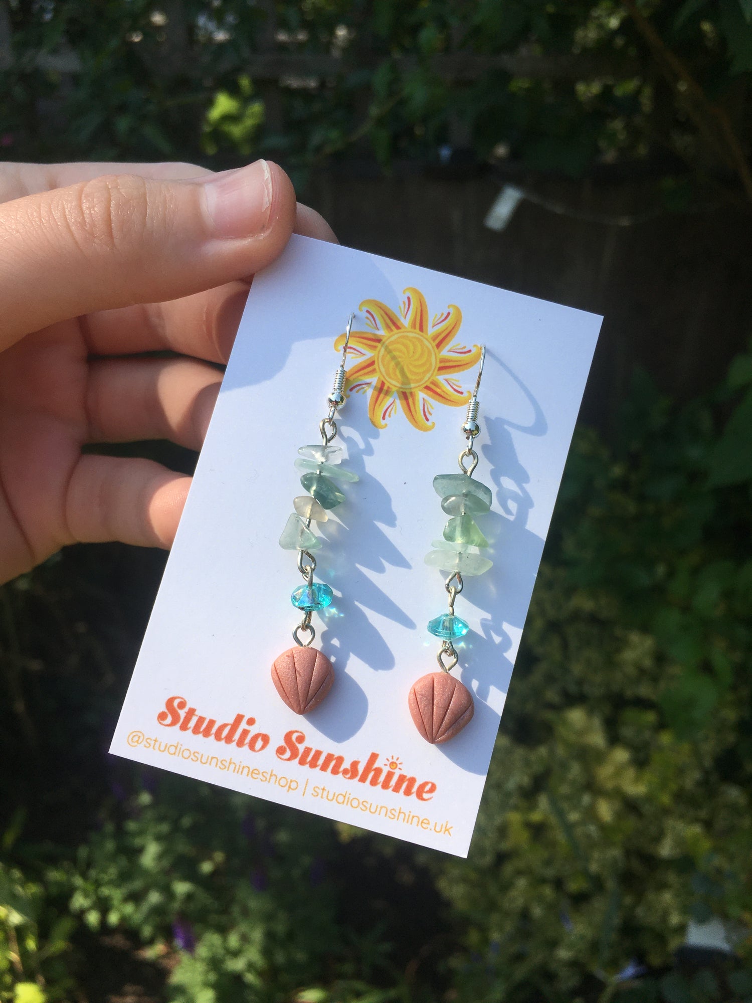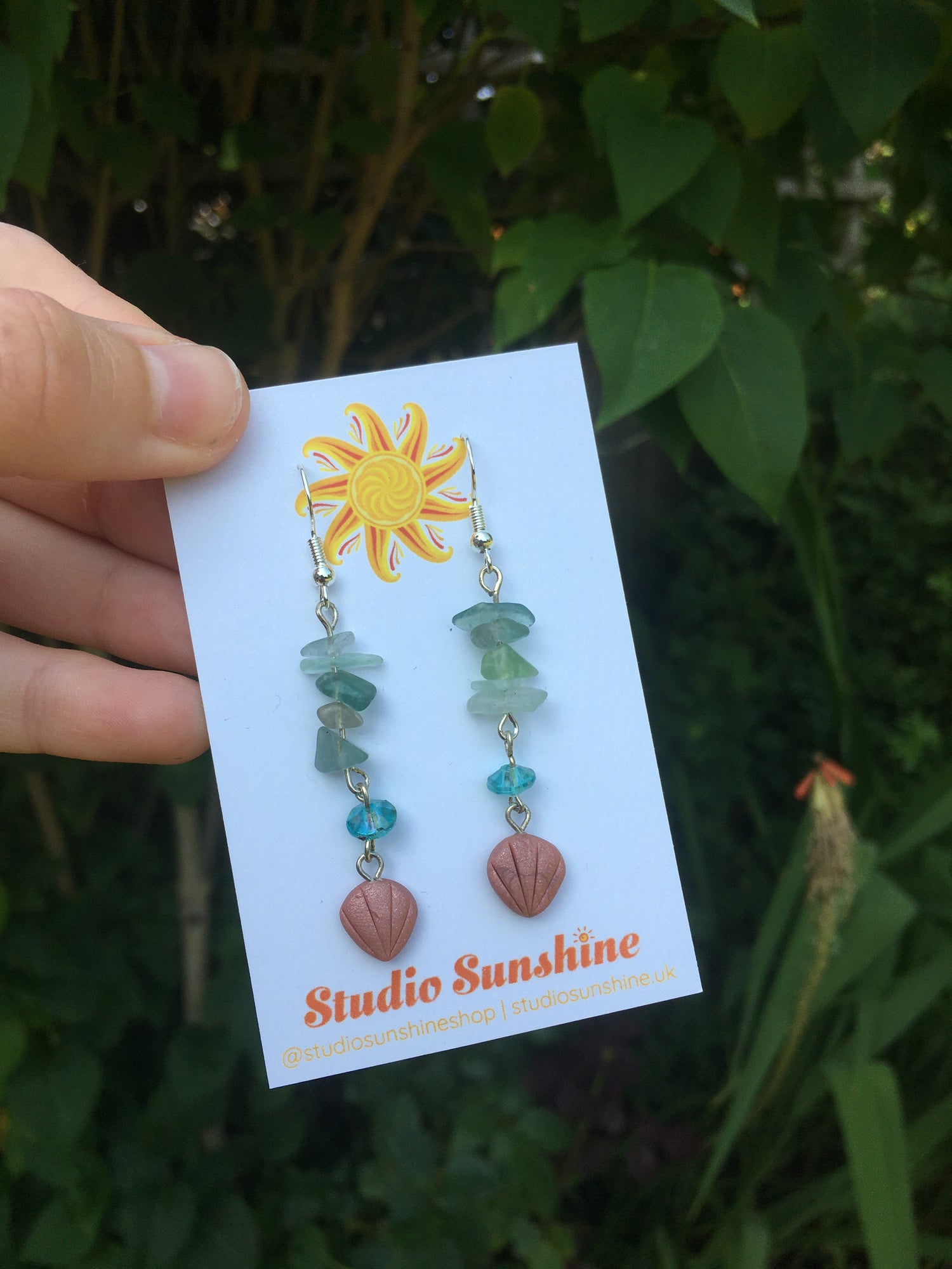 Cute fluorite dangles with additional blue and shell charms, perfect for summer!