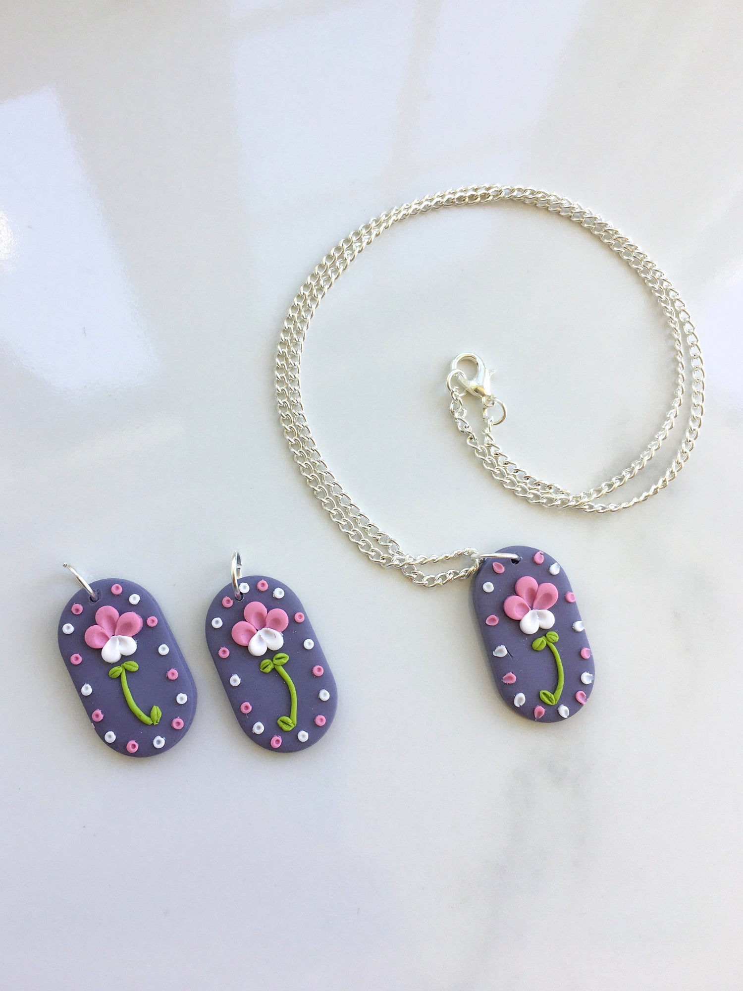 The sweetest pink pansy on a lilac background complete with a silver plated chain.