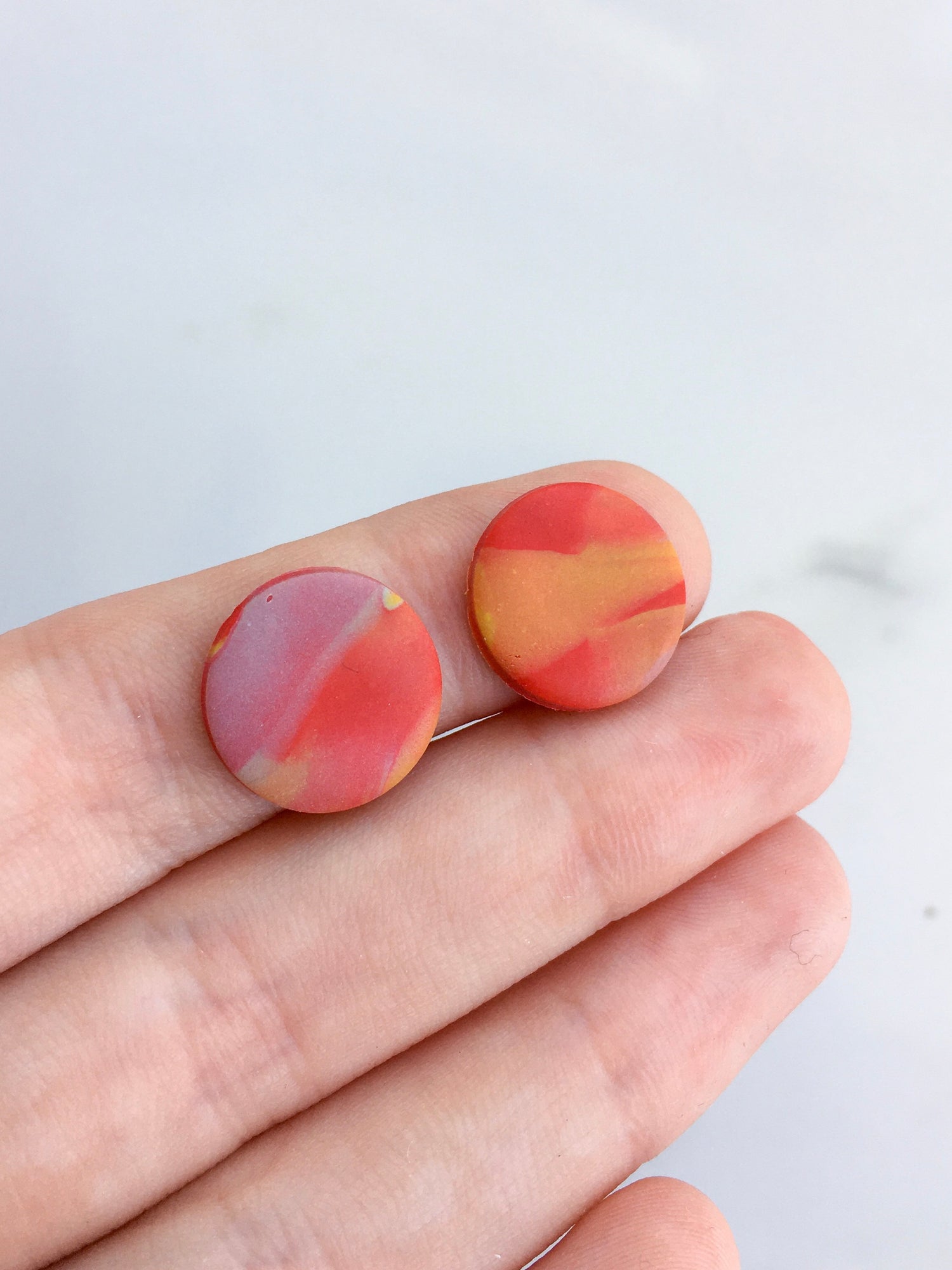 Disc studs in a marbled pattern of warm reds, yellows and blues. A cozy pair!