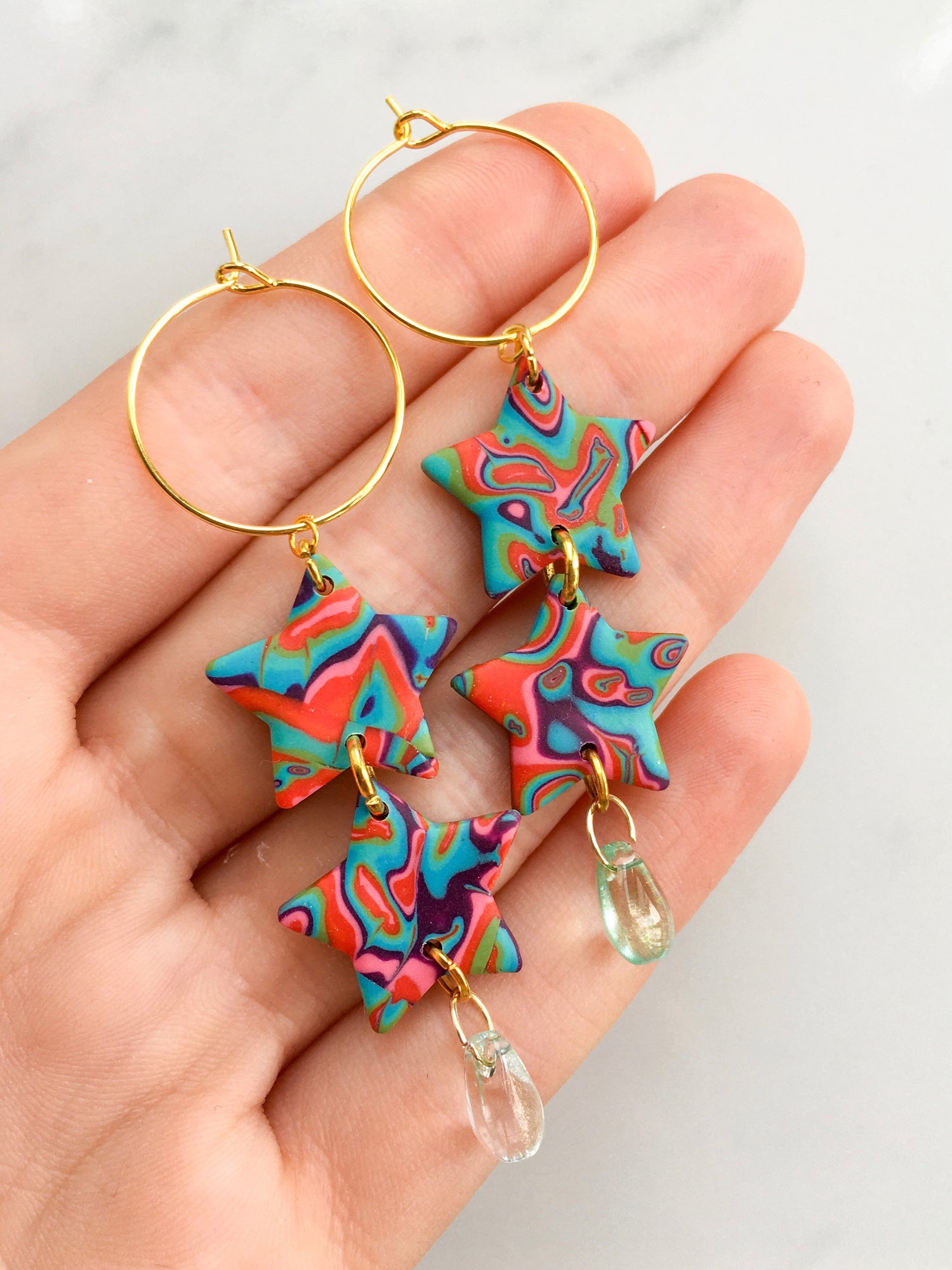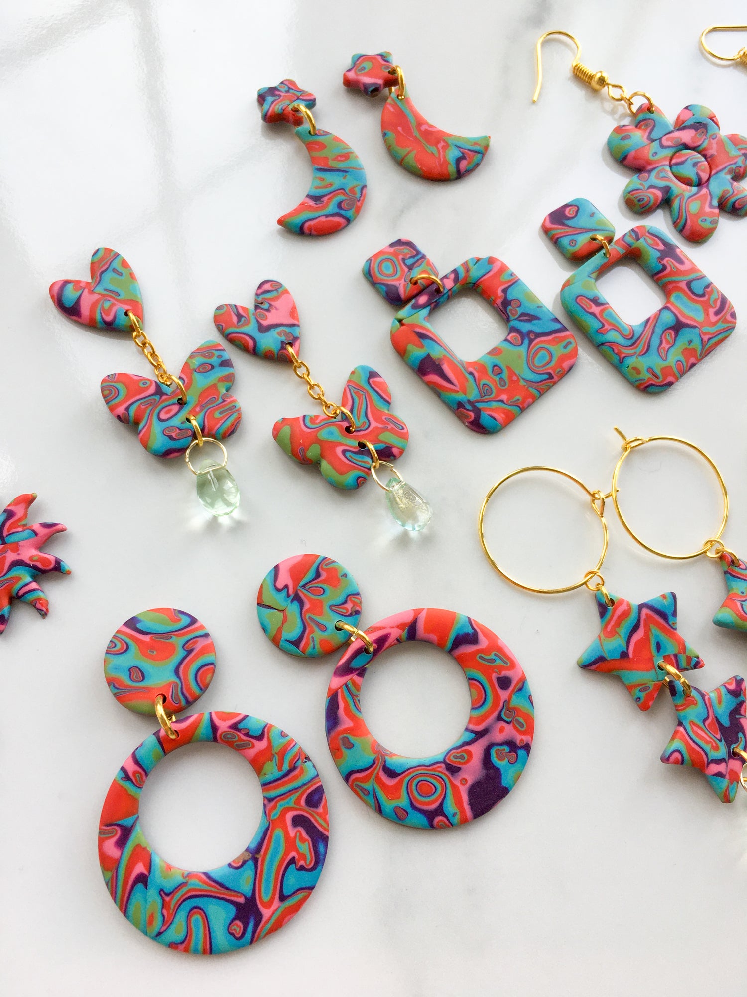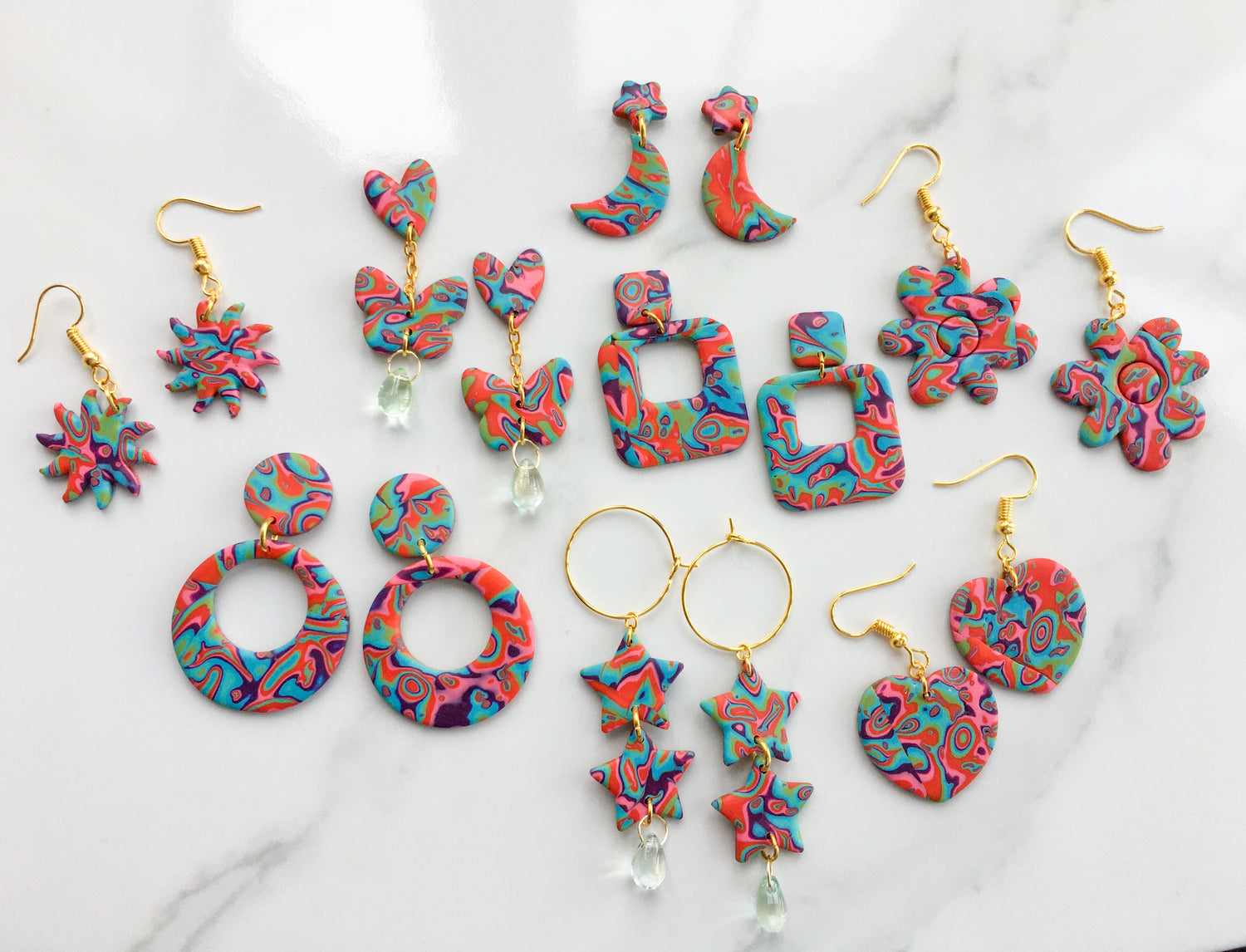 hoops ~ 4.5cm | square hoops ~ 3.5cm | chunky flowers ~ 4.5cm | hearts ~ 4.5cm | suns ~ 3.5cm | moons ~ 3cm | butterflies ~5cm | stacked star hoops ~ 5.5cm | star micros ~ 1cm