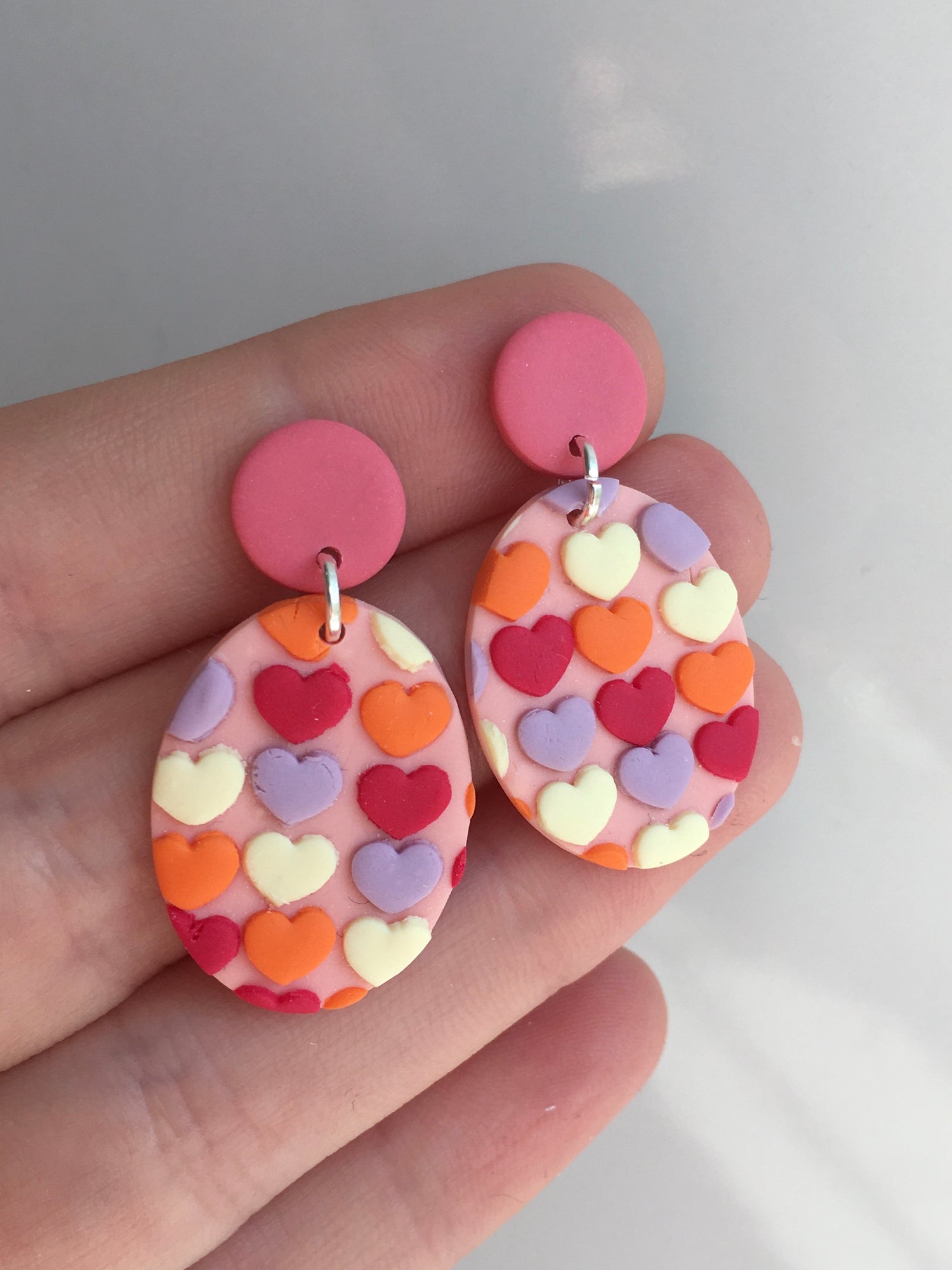 Earrings in a sugar sweet design with diagonal heart checks of pink, purple, orange & yellow! This pair features patterned ovals with a pink stud top.