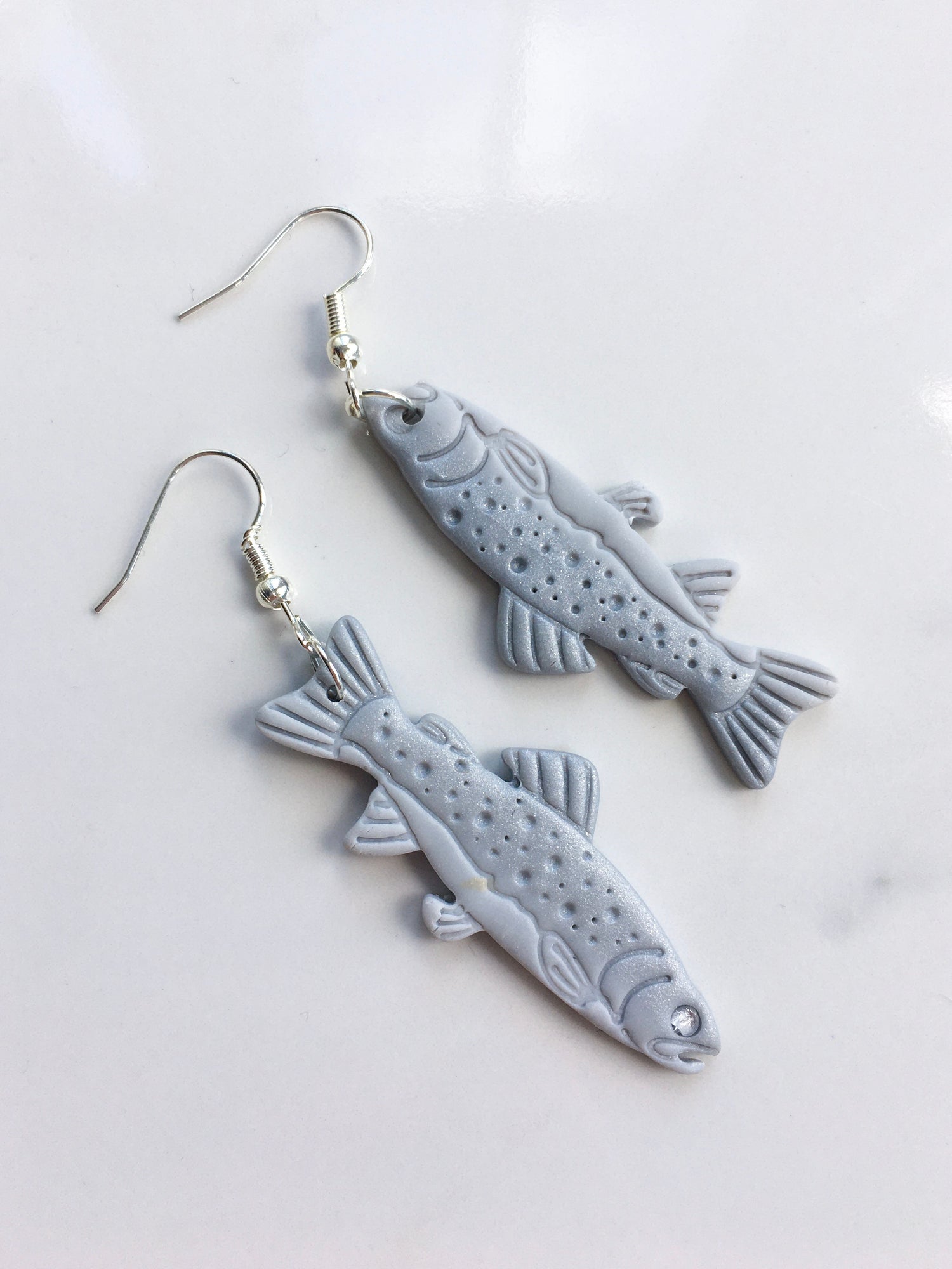 These funky, mismatched fishies will get you hooked on quirky earrings! Made with an ombre sparkling silver to grey and finished with dotted details and a silver beady eye.