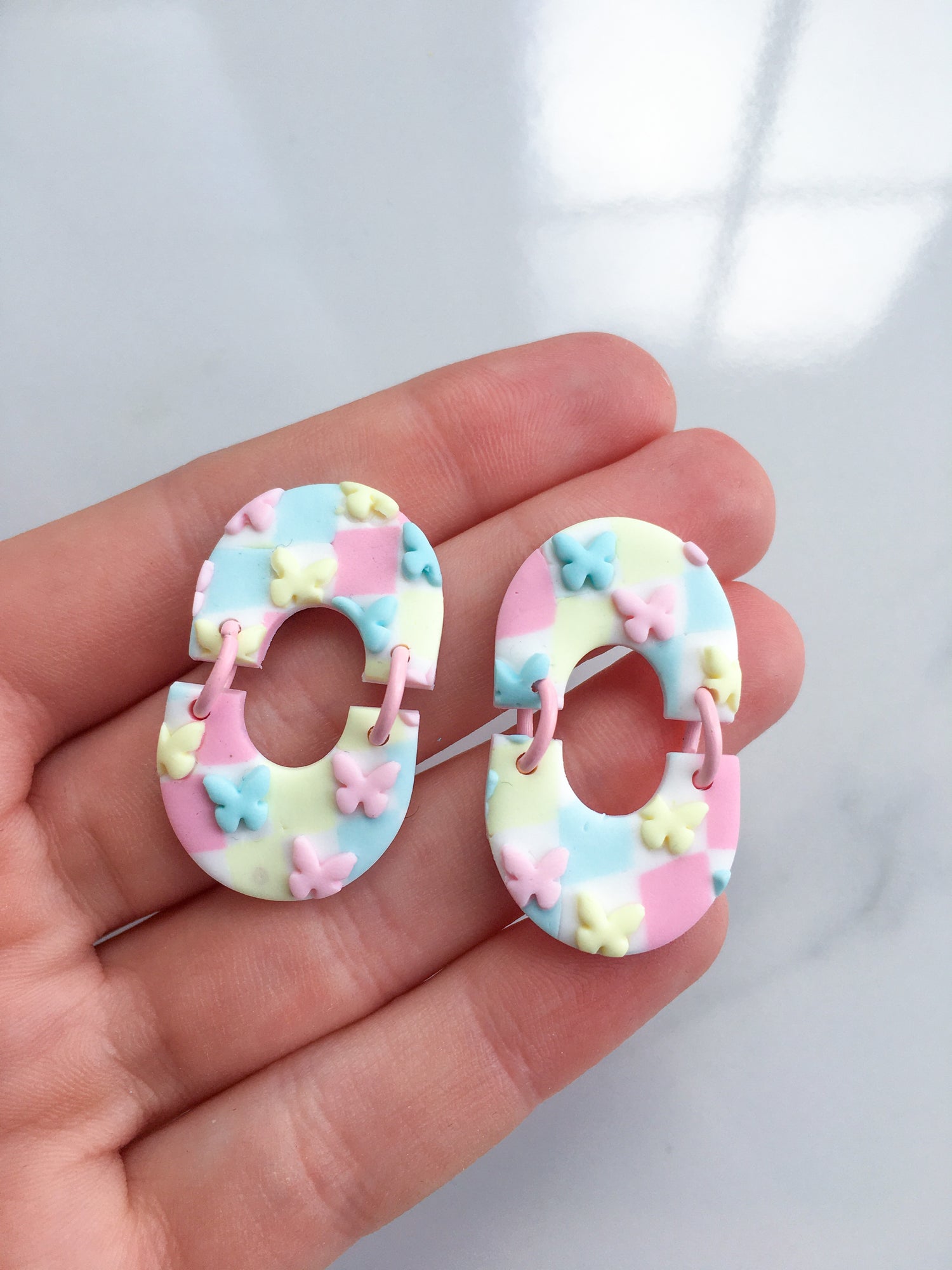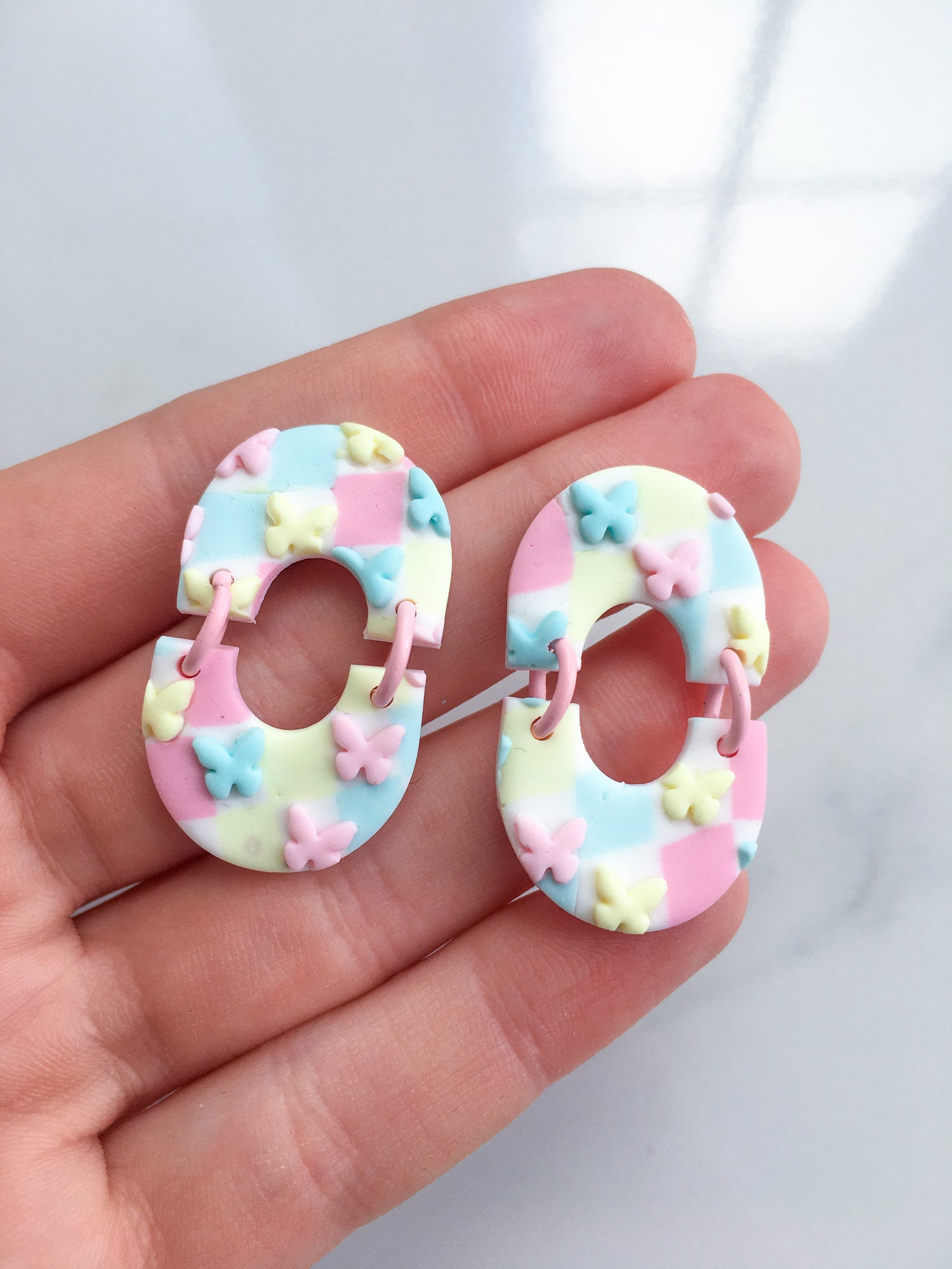 Bounce into Spring with these joyous pastel checked pieces! With a soft combination of pink, yellow and blue, butterflies and pastel jump rings complete the set.