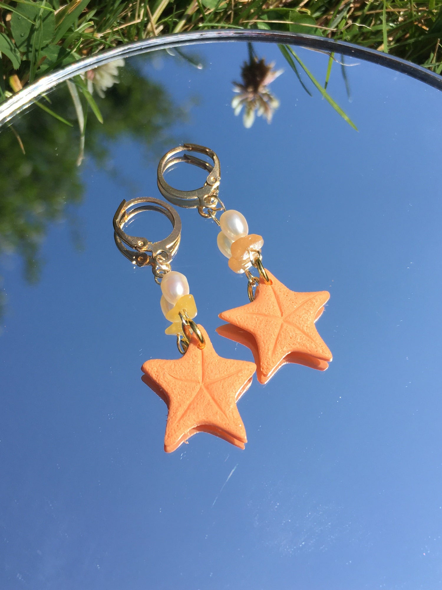 These adorable Starfish are the perfect companion for long beach days! Available in purple, blue, orange or coral, each pair features matching gemstones and natural pearls!