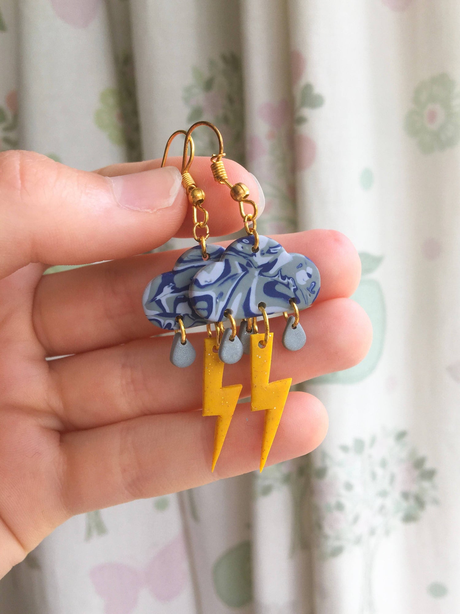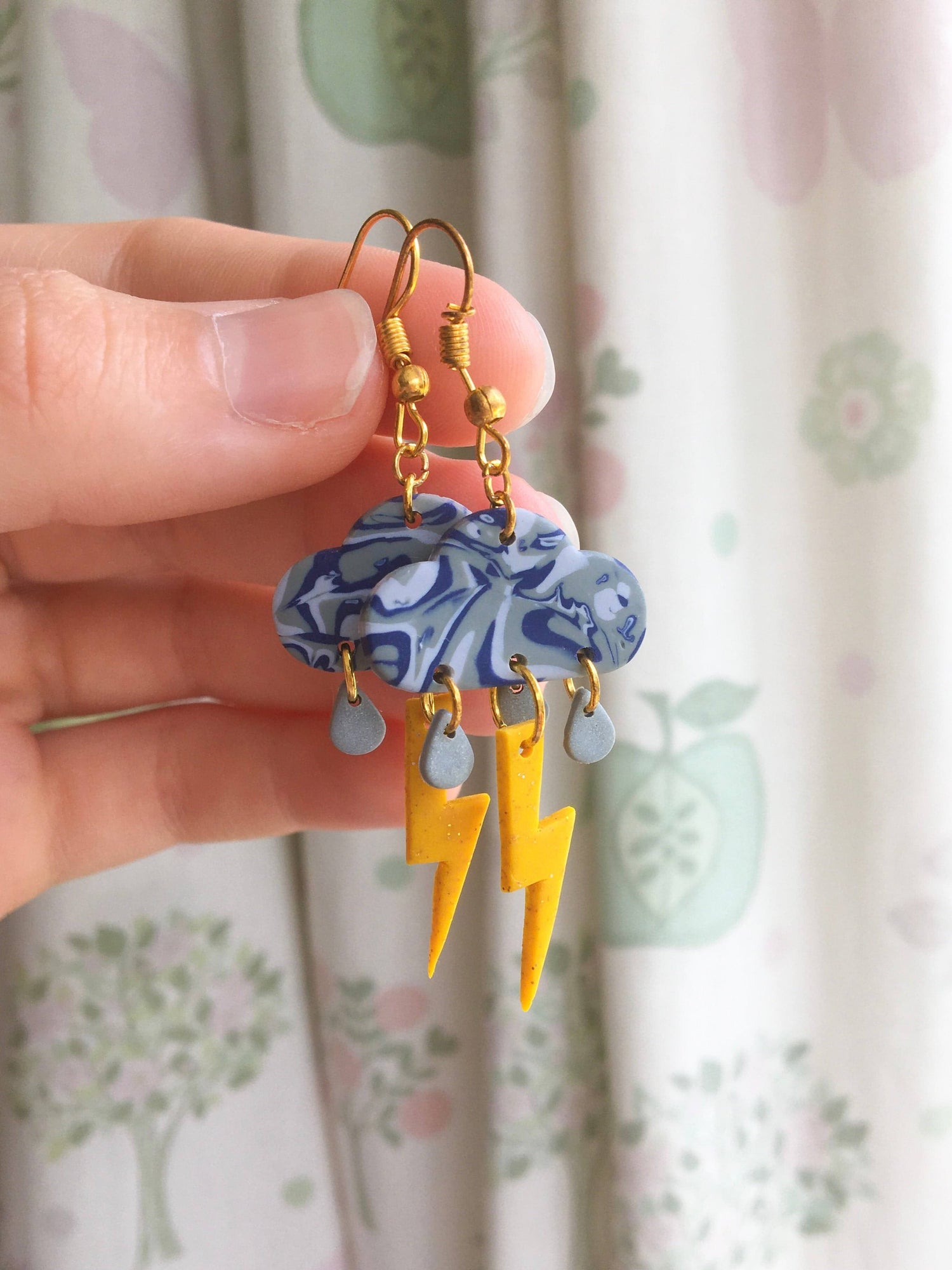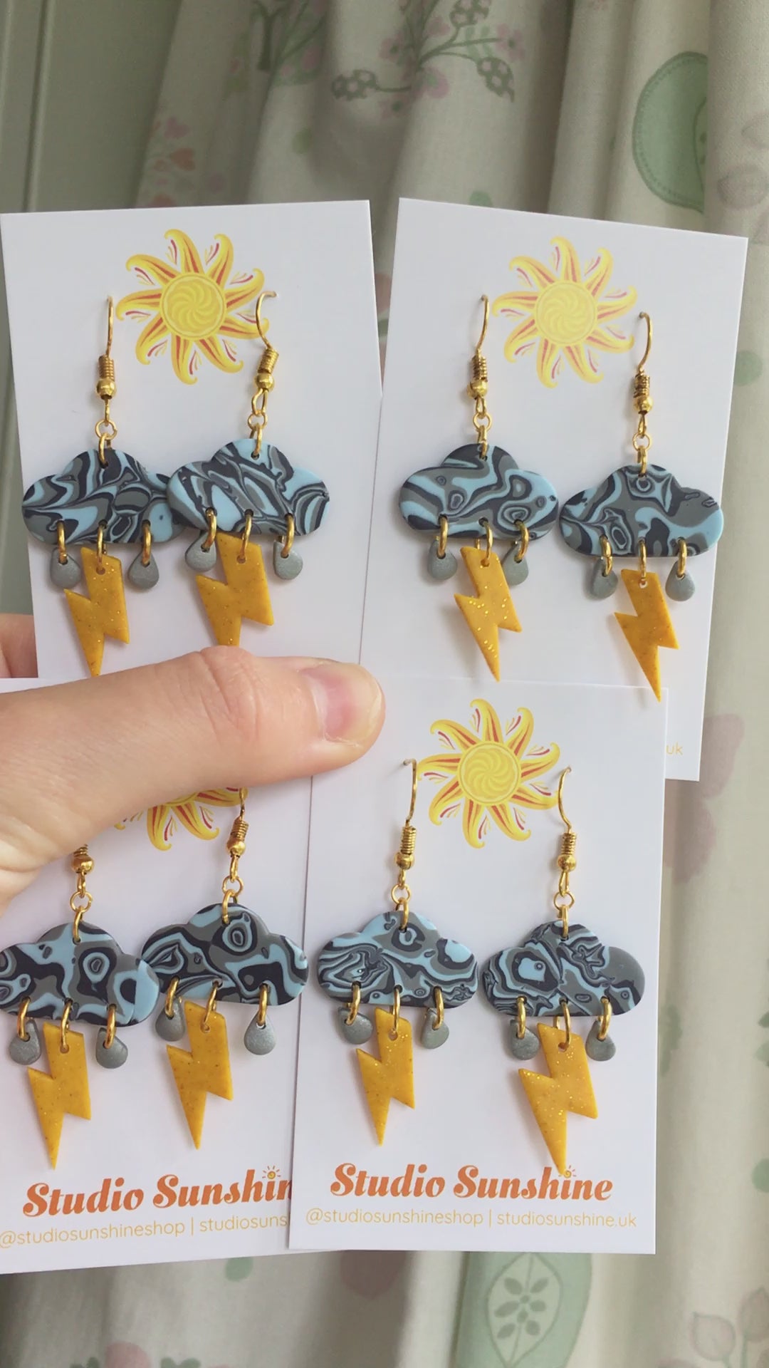 My personal favourite of the whole Woodland range... Stormclouds. Who doesn't love a dramatic storm? Featuring an indigo, grey and periwinkle cloud with silver raindrops and a glitter yellow lightning strike. These pairs dangle with such grace and drama!