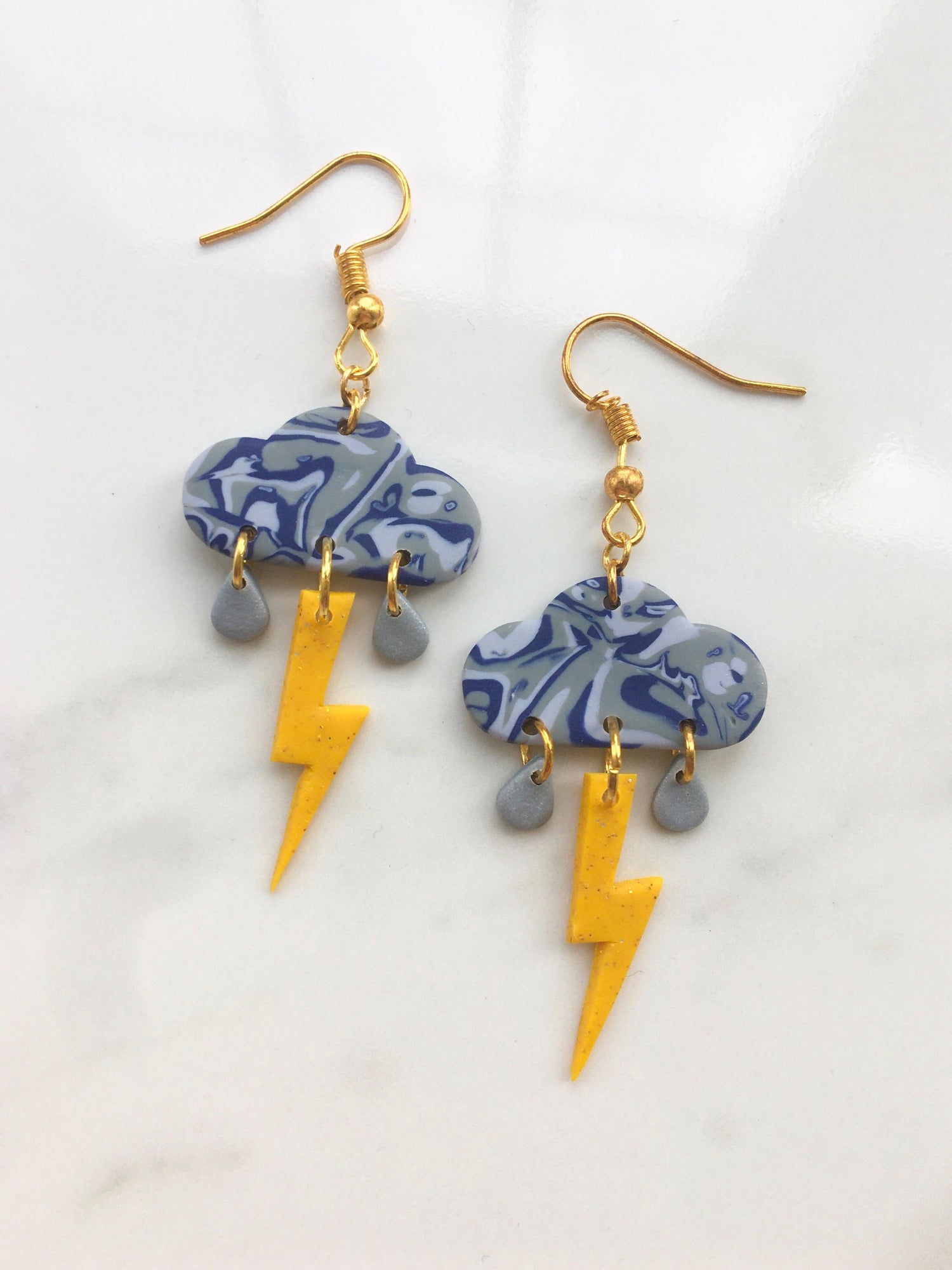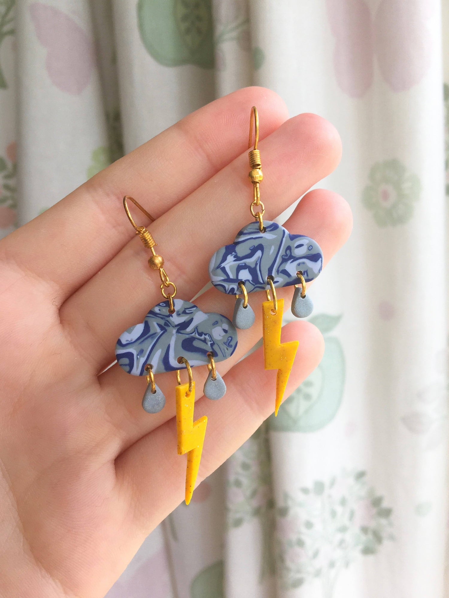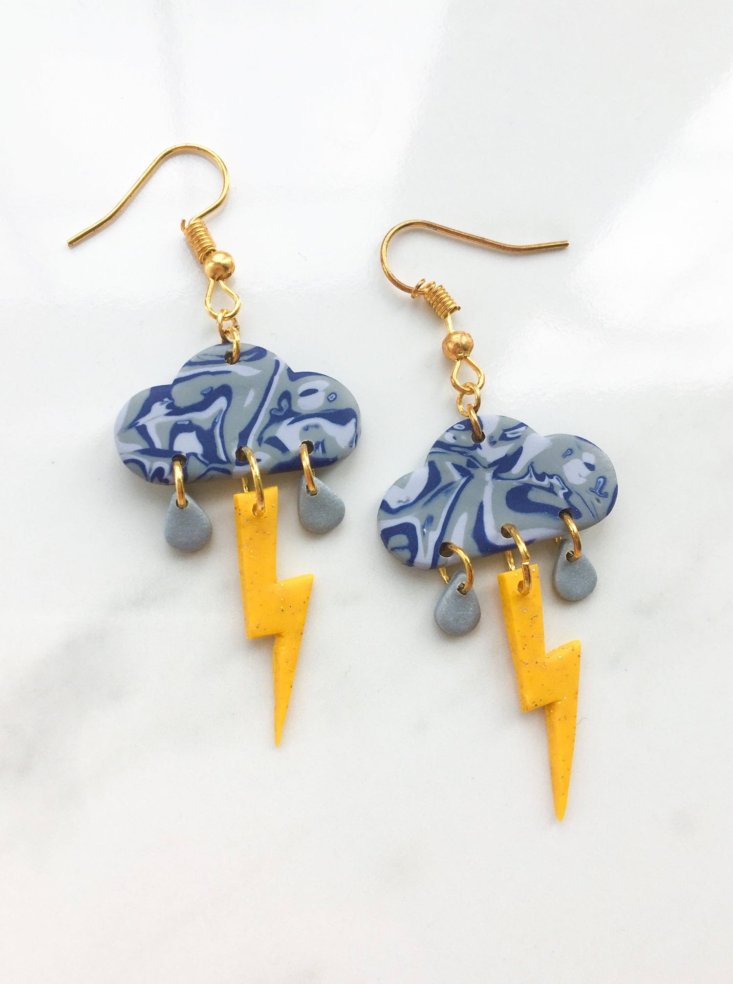 My personal favourite of the whole Woodland range... Stormclouds. Who doesn't love a dramatic storm? Featuring an indigo, grey and periwinkle cloud with silver raindrops and a glitter yellow lightning strike. These pairs dangle with such grace and drama!