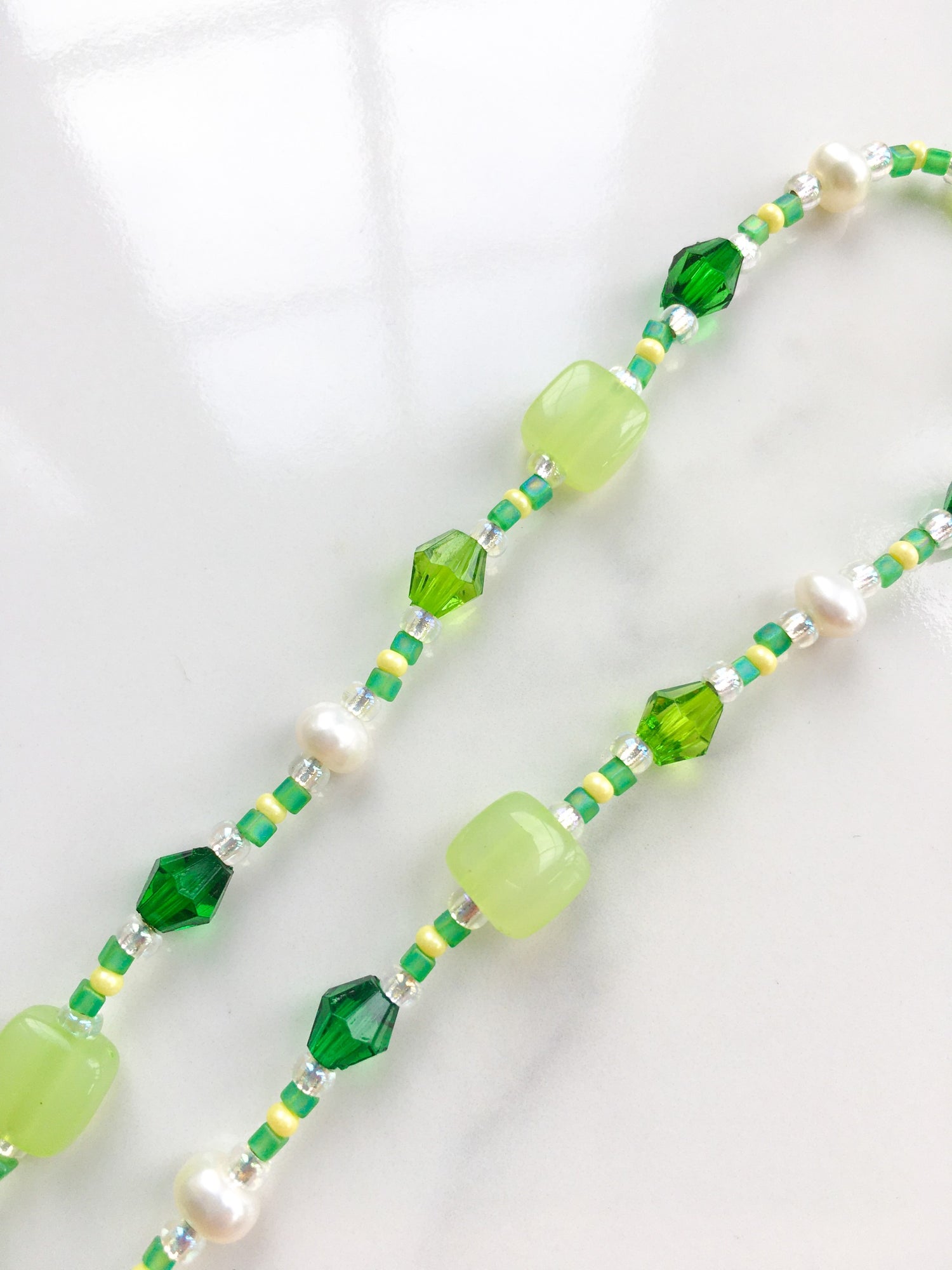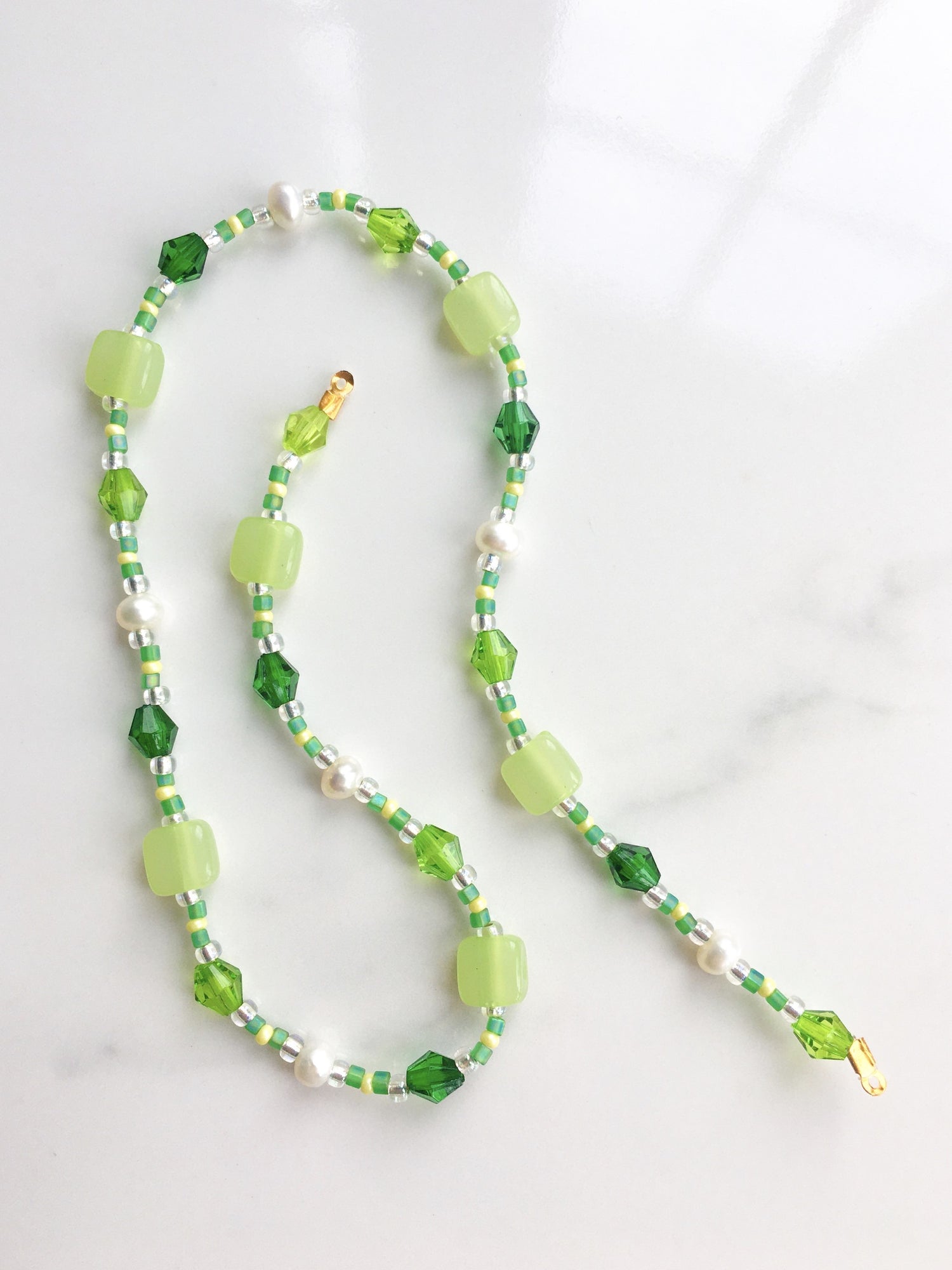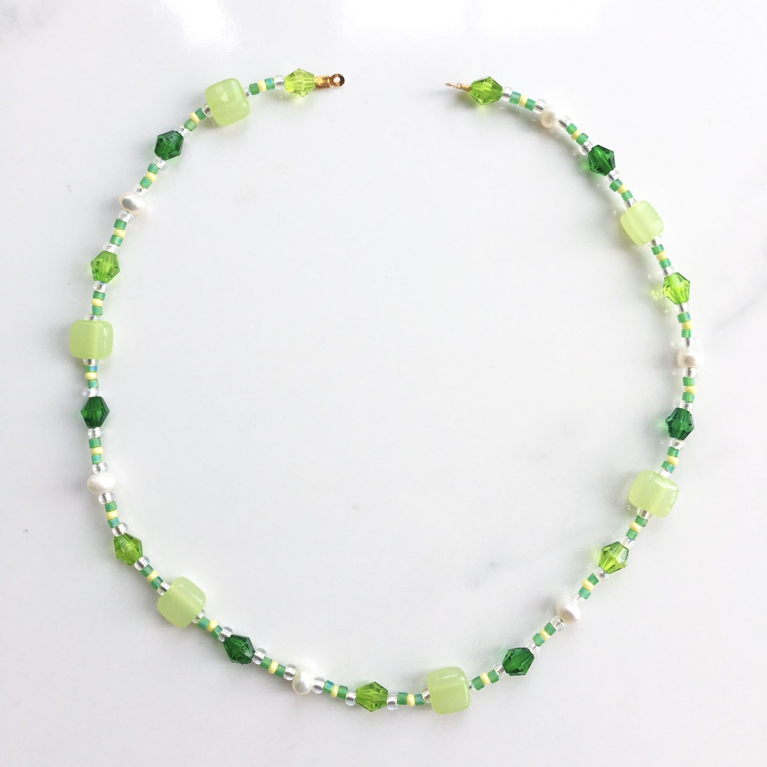 The muse of history. This piece features a gorgeous combinations of beads including glass Miyuki square, yellow and pearlised seeds, lime green jelly squares, acrylic bicones, complete with real freshwater pearls.