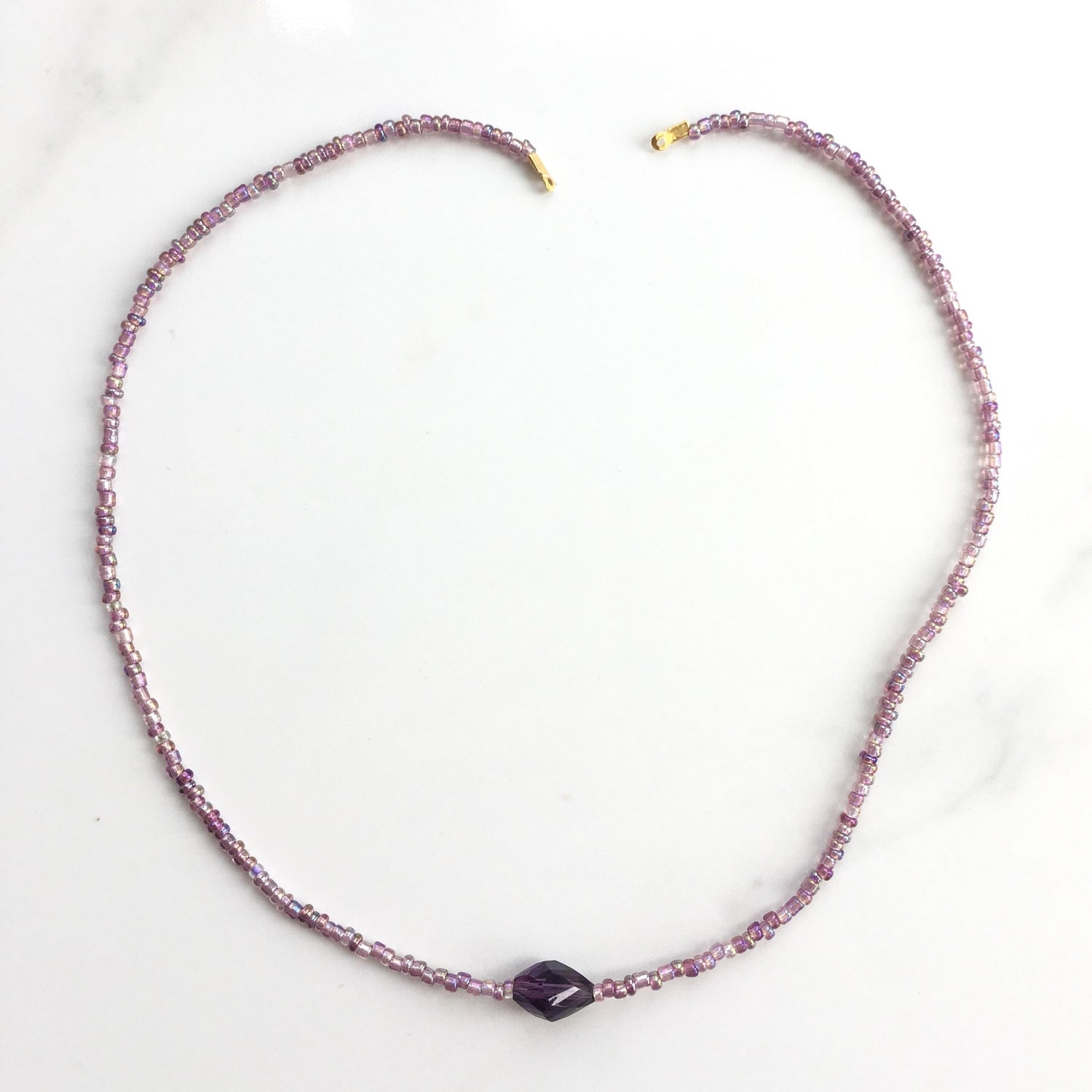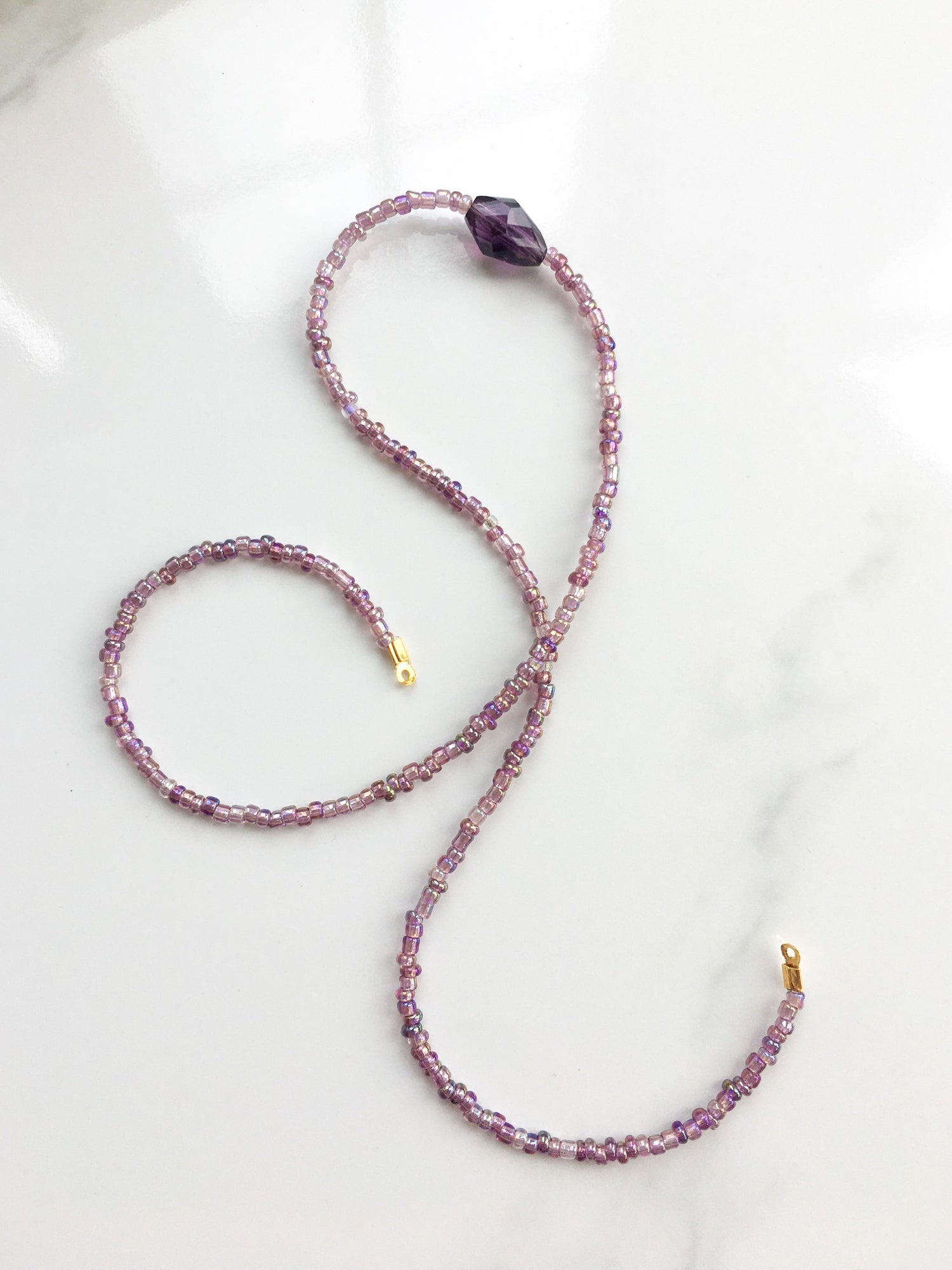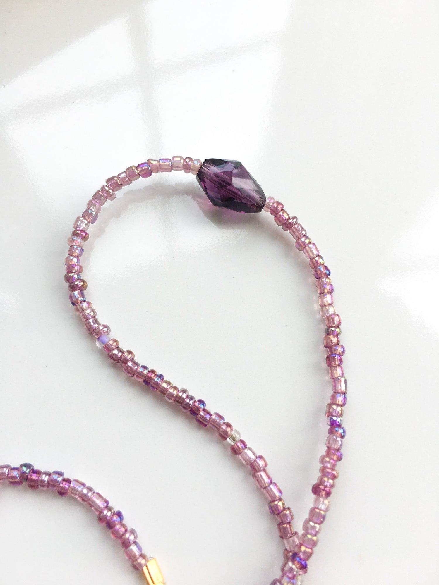 The muse of comedy. This piece features a string of lilac seed beads with a central dark purple diamond-shaped glass bead.