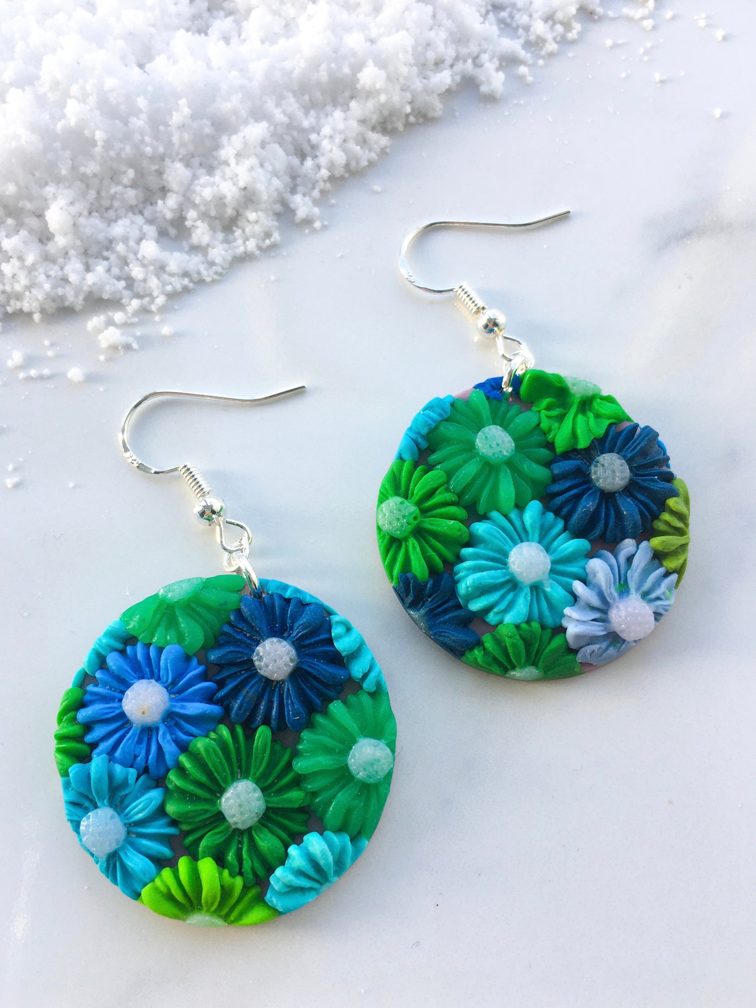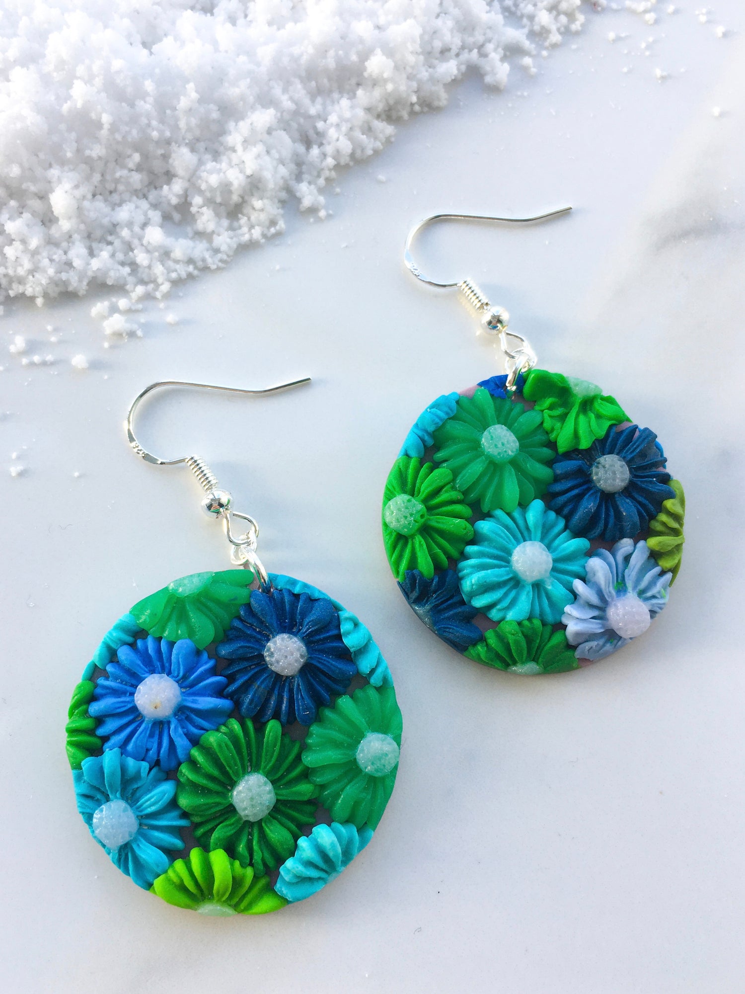 Hues of blue and green paint this floral winter garden pattern. This pair features large discs.